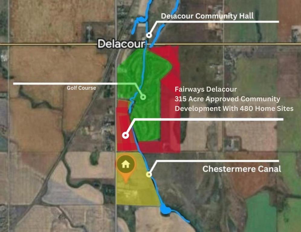 Nestled on over 58.59 acres of picturesque countryside, this exceptional property occupies one of the highest elevations in the area, offering remarkable privacy and breathtaking panoramic views. Ideally situated just 5 minutes from Delacour, 12 minutes from Chestermere, and only 17 minutes to Calgary, it strikes the perfect balance between peaceful rural living and convenient city access. The Chestermere Canal borders the rear of the property, adding both charm and utility to the landscape. Bordering a golf course and adjacent to the approved 315-acre Fairways Delacour development—which includes plans for 480 residential lots—this property also represents a prime investment opportunity. Whether you envision a private estate, a small business, or future subdivision and rezoning, the possibilities here are substantial. The gated entrance and professionally landscaped grounds lend the property a secluded, estate-like atmosphere. Key features include an oversized garage that doubles as a workshop, a 2,000+ sq ft animal shelter, and multiple outbuildings for storage and livestock. With ample open land, a strong well, and canal access, the property is ideally suited for gardens, pasture, or larger-scale agricultural uses. Its layout also supports future subdivision and development potential, given the proximity to infrastructure and neighboring projects. Inside, the home is filled with natural light and thoughtfully updated throughout. Hardwood floors flow through the main living areas, beginning with a warm and welcoming foyer that leads into a cozy family room framed by large front-facing windows. The adjacent dining area offers scenic views, while the kitchen blends classic oak cabinetry with modern stainless steel appliances, including a gas range, built-in oven, and double-door refrigerator. A bright breakfast nook opens to multiple decks, and a large living room with gas fireplace and expansive windows provides an ideal space for relaxing or entertaining. Upstairs, the luxurious 363 sq ft primary suite features dual closets, a gas fireplace, a lavish five-piece ensuite, and abundant windows that showcase surrounding views. Two additional bedrooms, two full bathrooms, and a spacious bonus room complete the upper level. The finished basement offers even more functionality, with a large recreation room, an additional bedroom, office space, and generous storage options. This is more than a property—it’s a lifestyle. Whether you're looking to establish a business, embrace country living, or invest in long-term development, this versatile acreage delivers unmatched potential and charm. Book your private tour today to fully experience the space, serenity, and opportunity this unique offering provides.