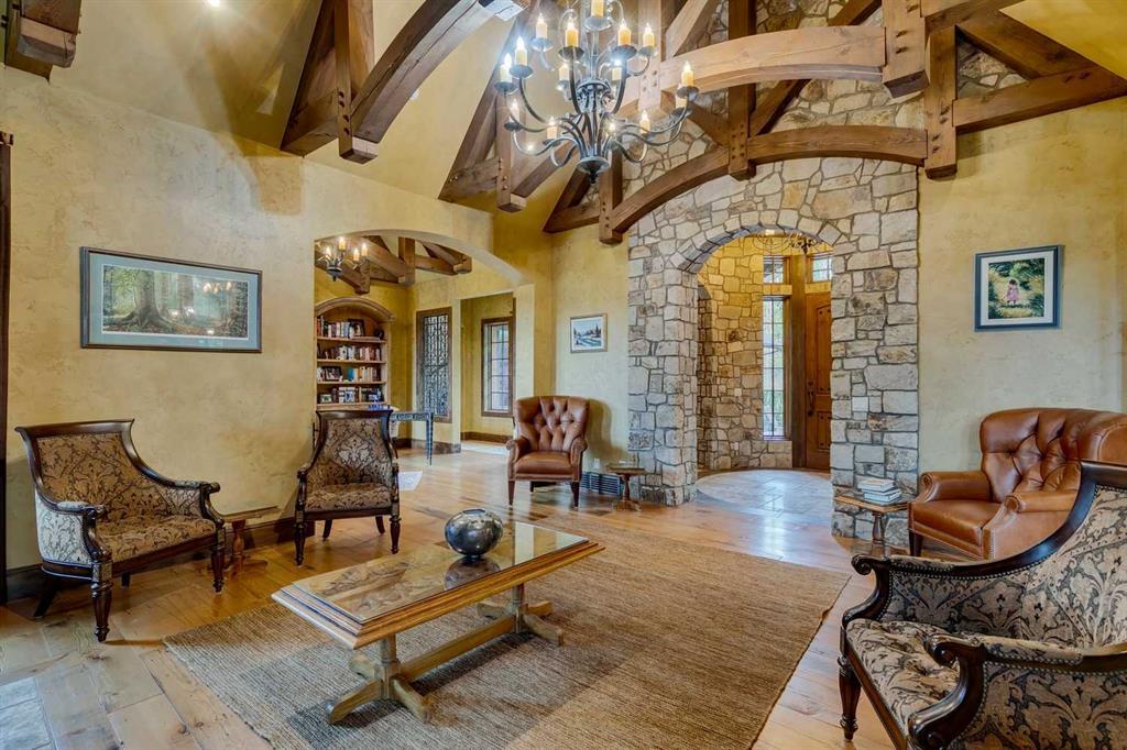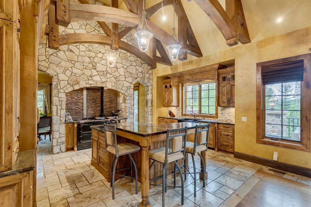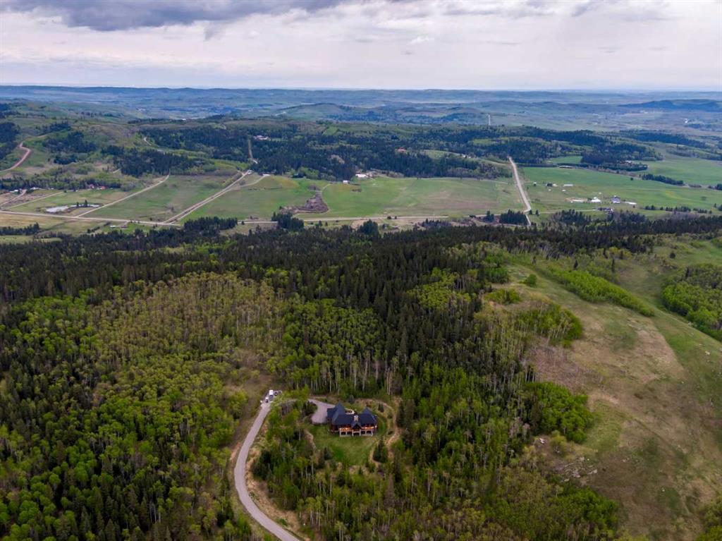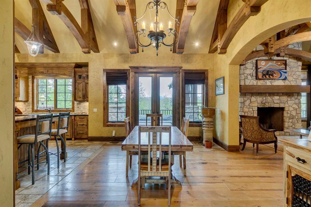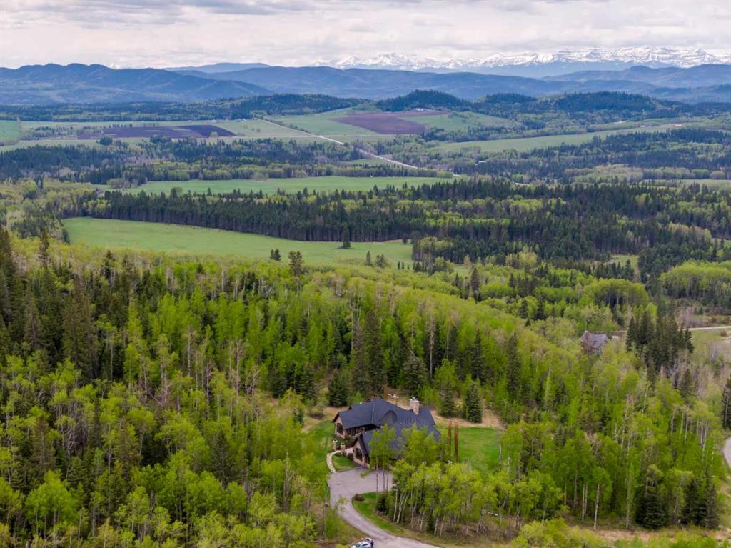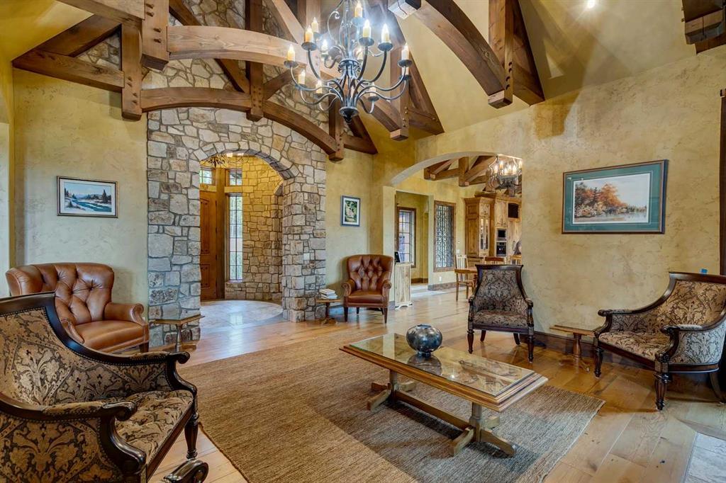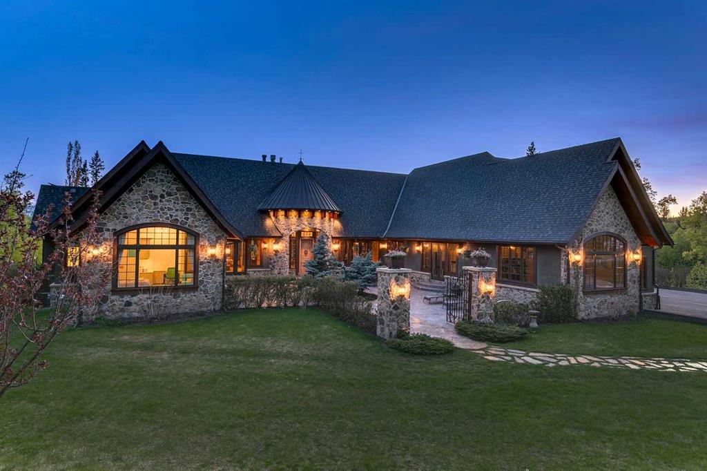 25 minutes from southwest Calgary city limits, this timber and stone masterpiece is set against the backdrop of the majestic Rockies, embraced by rolling ranch lands that offer endless natural beauty. Nestled between Brown-Lowery Provincial Park and Kananaskis Forest Reserve the home promises a lifestyle rooted in nature and refined living . The nearby charming towns of Millarville, Black Diamond and Bragg Creek host festivals and markets year round along with access to esteemed schools, shopping, entertainment and medical facilities. This 2011 SAM Award–Best New Custom Home-winning residence captivates with its stone fireplaces, exposed timber beams, tall French doors under vaulted ceilings. By design, mornings begin in a bright courtyard featuring a serene fountain, while evenings are reserved for unwinding on a west-facing deck that showcases sunsets and mountain vistas “as far as the eye can see.” With amenities like a built-in gas BBQ, an outdoor stone fireplace, and overhead heaters beneath the shelter of a timber truss roof, every season is met with inviting warmth and style. The home’s seamless flow unites a one and half story main floor, a walkout lower level, and an upper loft that can be converted to feature a fourth bedroom, ensuite bath and private den—totaling 6,561 square feet of thoughtfully planned living space. The chef’s kitchen is a dream come true, featuring custom-built alder cabinets, an Aga vented gas range, an integrated fridge and freezer, and a plumbed coffee maker. This culinary space adjoins rooms that facilitate both formal dining and casual family gatherings, ensuring that every meal becomes a shared experience. True to its natural spirit, the home is built almost entirely of organic materials. A copper-seamed Coppola roof crowns the exterior alongside natural stone and brick facades, while reclaimed hardwoods and honed stone floors lend an artisanal touch throughout. Metal-clad fir windows and oversized French doors open onto wood-planked decks that embrace the walkout patio and extend to the hot tub area—perfect for relaxing or entertaining in style. A Scandinavian-inspired spa, a three-piece bath, and a dedicated gym further round out a suite of wellness-oriented features. Inside, vaulted ceilings accented by fir timber beam trusses create a grand yet inviting atmosphere. Stone and granite countertops provide a luxurious touch in every room. Additional highlights include a home theater, wine cellar, billiards room, and a striking Tulikivi fireplace that anchors memorable family moments. An ensuite bedroom on the lower level ensures comfort and privacy for guests or extended family. Modern living integrated with timeless design. State-of-the-art equipment all working together to keep the air, water, and environment healthy, clean, and comfortable year-round. This move-in ready estate awaits your private viewing.