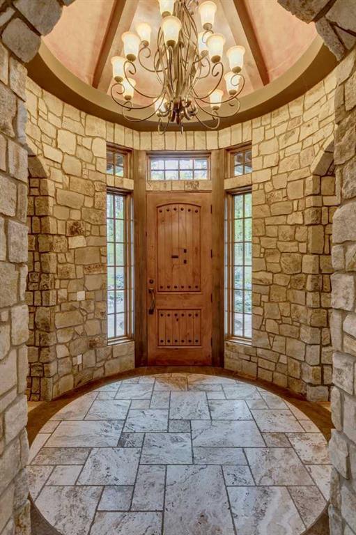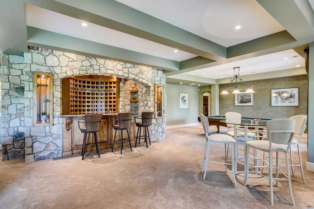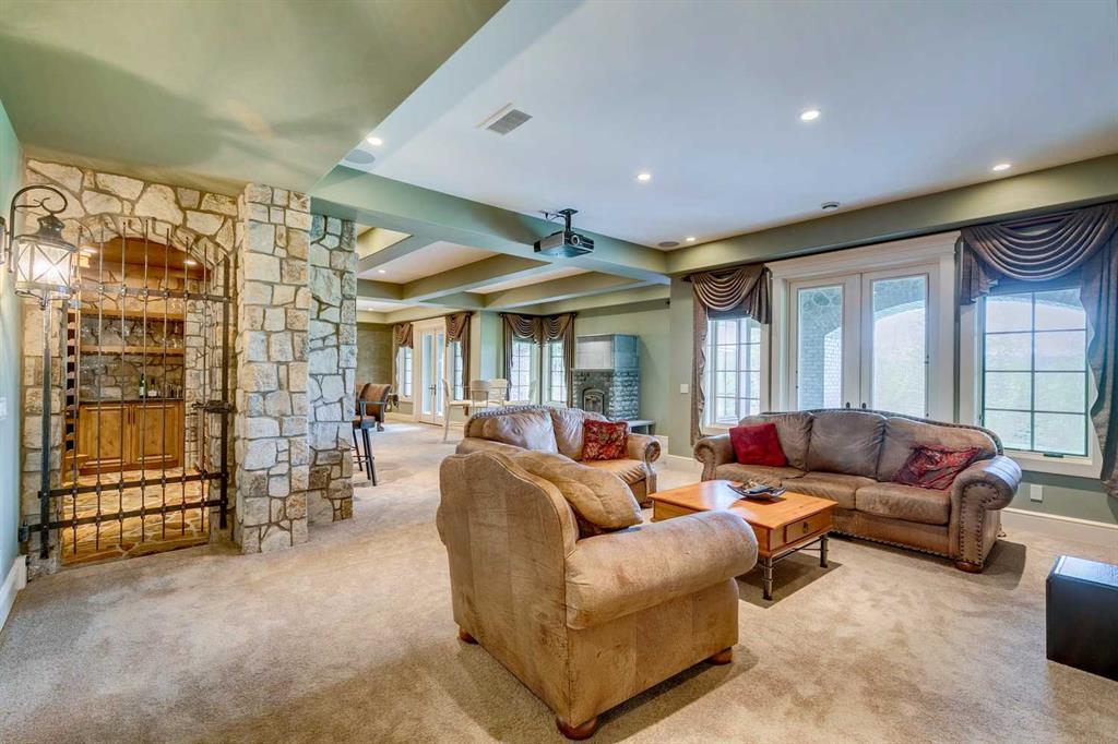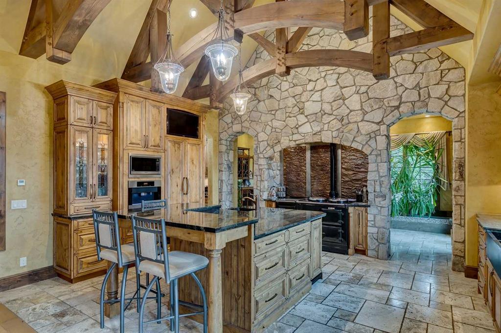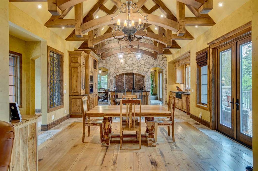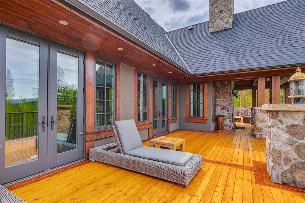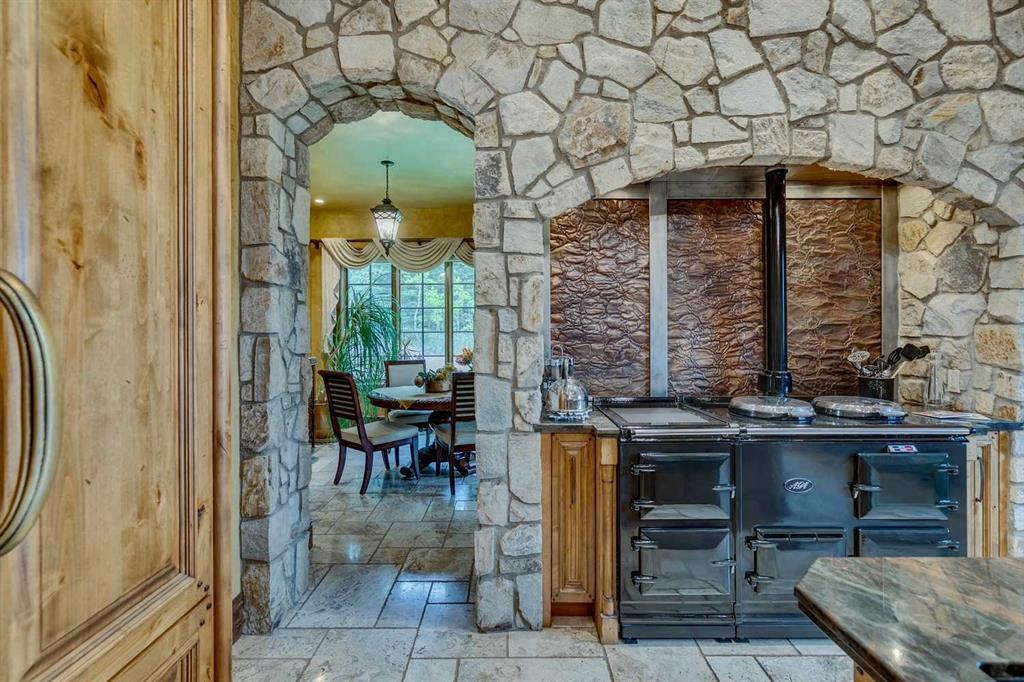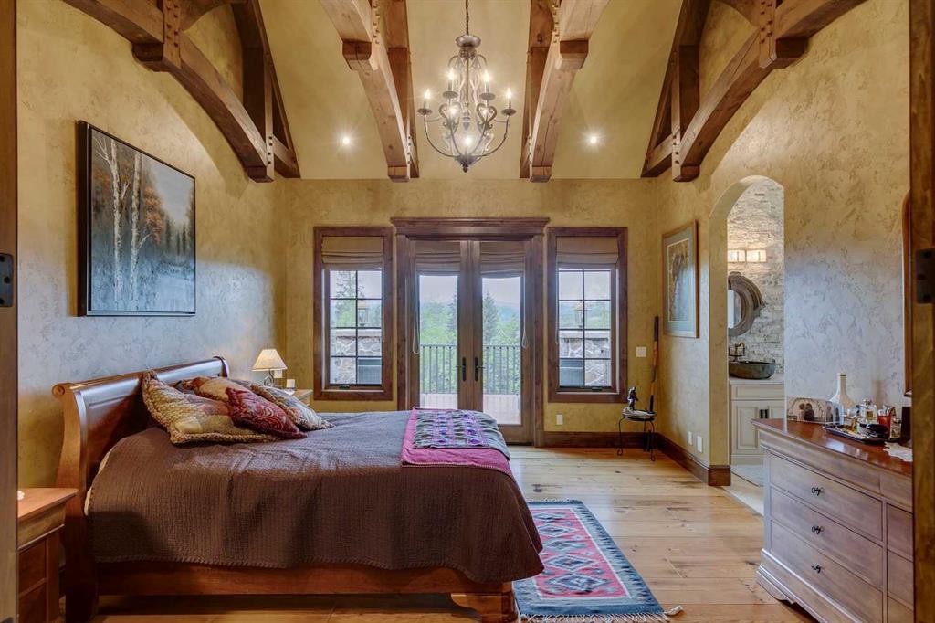 25 minutes from southwest Calgary city limits, this timber and stone masterpiece is set against the backdrop of the majestic Rockies, embraced by rolling ranch lands that offer endless natural beauty. Nestled between Brown-Lowery Provincial Park and Kananaskis Forest Reserve the home promises a lifestyle rooted in nature and refined living . The nearby charming towns of Millarville, Black Diamond and Bragg Creek host festivals and markets year round along with access to esteemed schools, shopping, entertainment and medical facilities. This 2011 SAM Award–Best New Custom Home-winning residence captivates with its stone fireplaces, exposed timber beams, tall French doors under vaulted ceilings. By design, mornings begin in a bright courtyard featuring a serene fountain, while evenings are reserved for unwinding on a west-facing deck that showcases sunsets and mountain vistas “as far as the eye can see.” With amenities like a built-in gas BBQ, an outdoor stone fireplace, and overhead heaters beneath the shelter of a timber truss roof, every season is met with inviting warmth and style. The home’s seamless flow unites a one and half story main floor, a walkout lower level, and an upper loft that can be converted to feature a fourth bedroom, ensuite bath and private den—totaling 6,561 square feet of thoughtfully planned living space. The chef’s kitchen is a dream come true, featuring custom-built alder cabinets, an Aga vented gas range, an integrated fridge and freezer, and a plumbed coffee maker. This culinary space adjoins rooms that facilitate both formal dining and casual family gatherings, ensuring that every meal becomes a shared experience. True to its natural spirit, the home is built almost entirely of organic materials. A copper-seamed Coppola roof crowns the exterior alongside natural stone and brick facades, while reclaimed hardwoods and honed stone floors lend an artisanal touch throughout. Metal-clad fir windows and oversized French doors open onto wood-planked decks that embrace the walkout patio and extend to the hot tub area—perfect for relaxing or entertaining in style. A Scandinavian-inspired spa, a three-piece bath, and a dedicated gym further round out a suite of wellness-oriented features. Inside, vaulted ceilings accented by fir timber beam trusses create a grand yet inviting atmosphere. Stone and granite countertops provide a luxurious touch in every room. Additional highlights include a home theater, wine cellar, billiards room, and a striking Tulikivi fireplace that anchors memorable family moments. An ensuite bedroom on the lower level ensures comfort and privacy for guests or extended family. Modern living integrated with timeless design. State-of-the-art equipment all working together to keep the air, water, and environment healthy, clean, and comfortable year-round. This move-in ready estate awaits your private viewing.