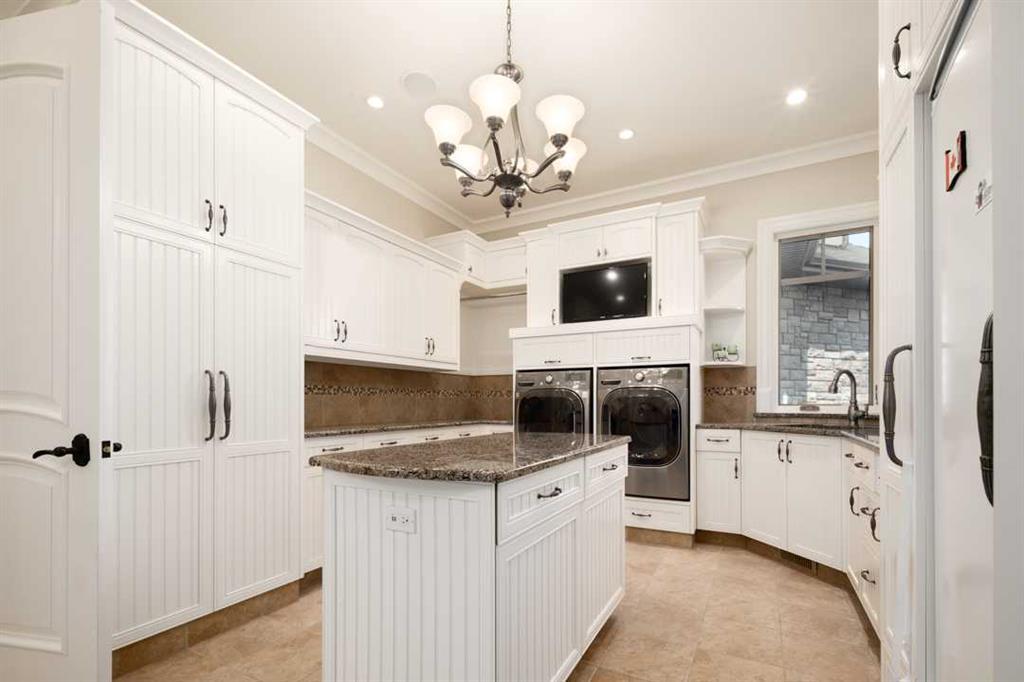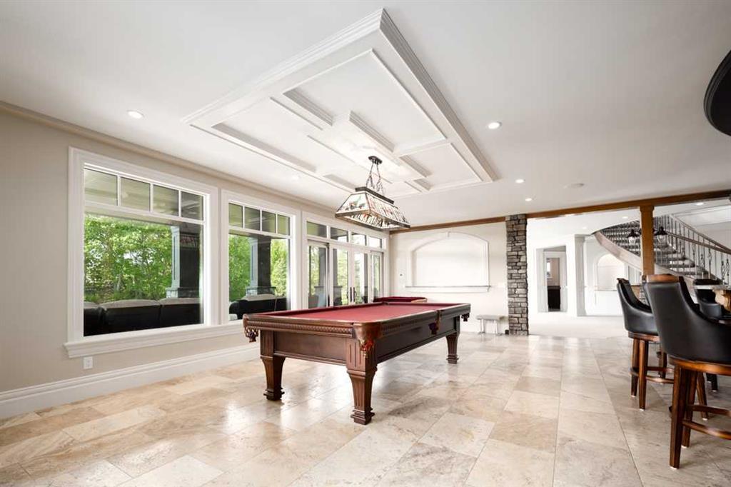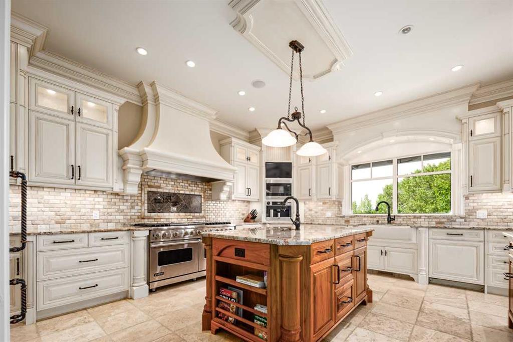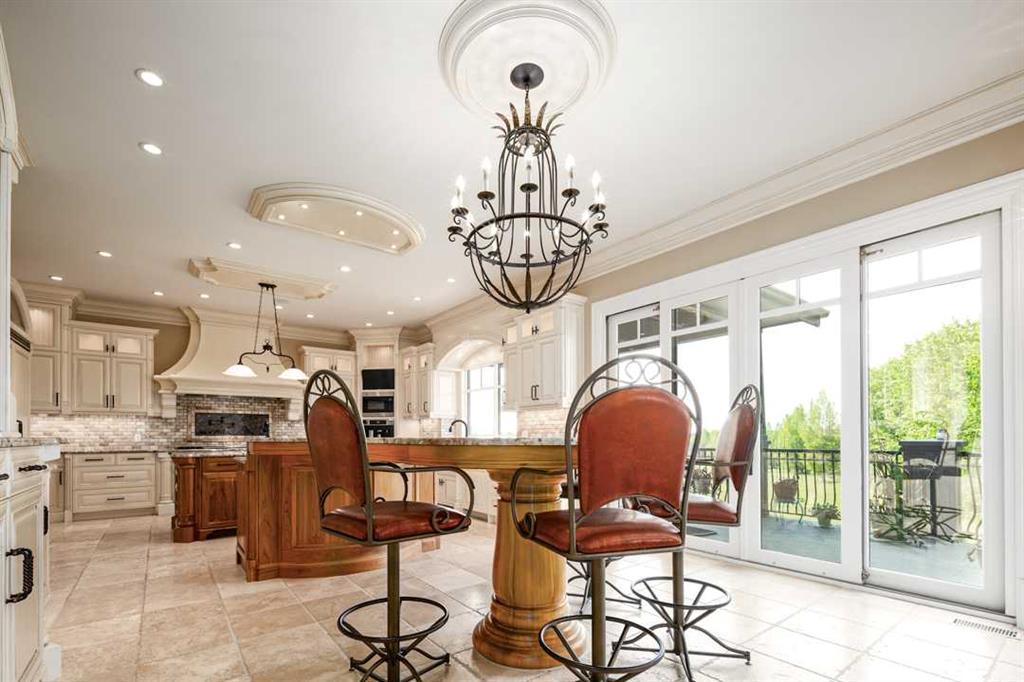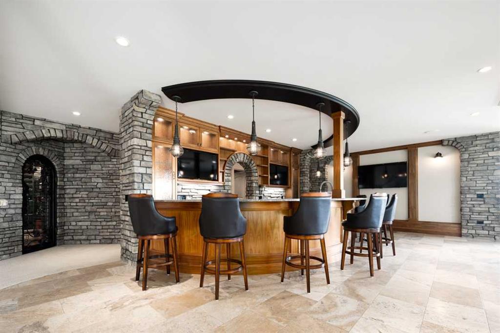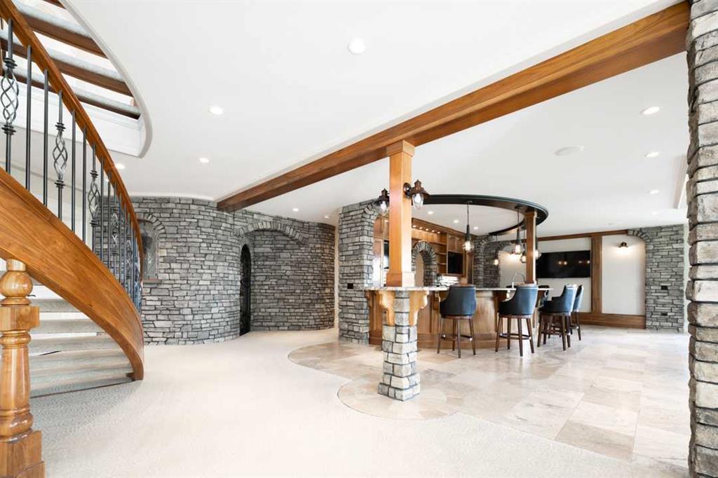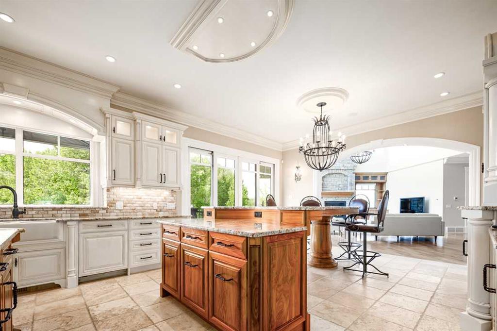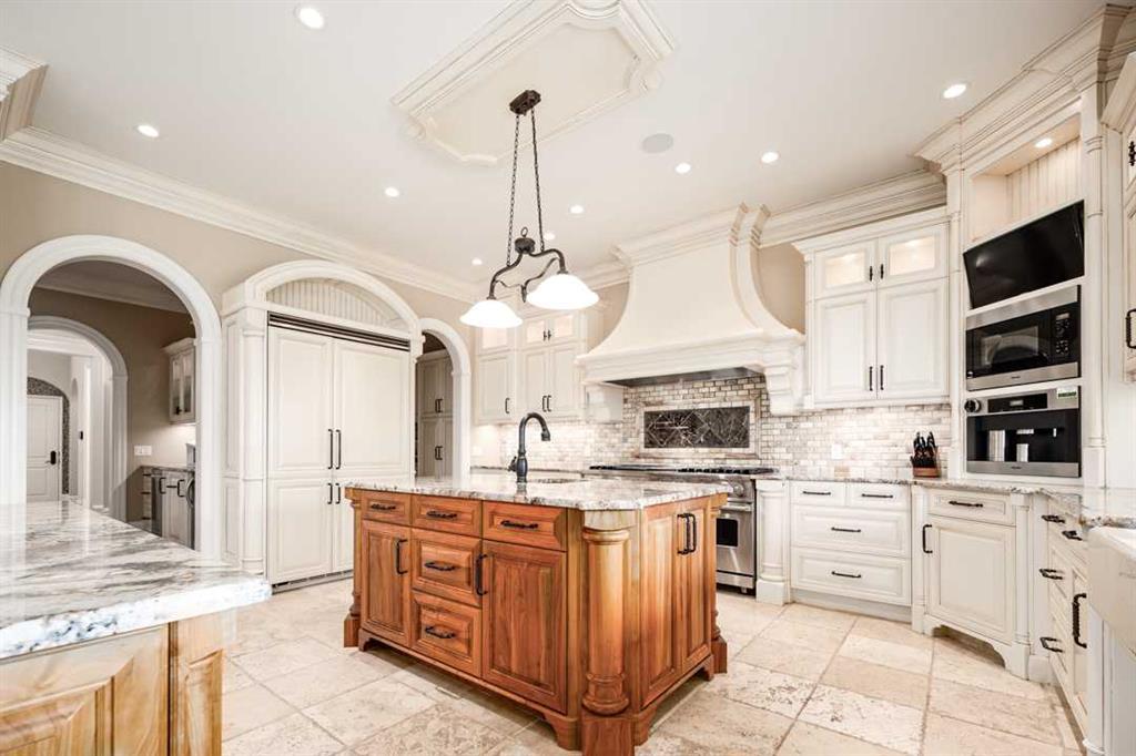 Experience timeless elegance in this extraordinary French Country Chateau, designed by Dreamworks, this architectural masterpiece is nestled on a picturesque 2-acre lot with panoramic mountain views. At the heart of the home is a magnificent 2 storey Great Room with a dramatic 20 ft barrel vaulted ceiling and floor-to-ceiling natural stone fireplace. Rich walnut hardwood floors, custom crown mouldings, and a curved walnut staircase set the tone for this warm yet opulent residence. The dream kitchen offers both function and elegance, featuring antiqued cream cabinetry, exotic granite countertops, and two expansive islands. Culinary enthusiasts will appreciate the top-tier appliance package, including a 60” Viking gas range, 48” paneled Viking fridge, KitchenAid Professional dishwasher, ice maker, and wine and beverage fridges. The layout includes a walk-through pantry with custom cabinets and granite counters, offering direct access from the garage for effortless grocery unloading, as well as a separate butler’s pantry with additional storage and prep space, perfect for seamless entertaining. The main floor showcases a luxurious primary suite featuring a double sided fireplace, bay window sitting area, private balcony access, & vaulted ceilings with ambient valence lighting. The spa-like ensuite offers a free standing BainUltra heated air-jet tub, steam shower, and an enormous double dressing room with custom-built cabinetry, drawers, and a central island. Additional main level highlights include two powder rooms, a private office, a richly paneled den with walnut coffered ceilings and custom built-ins, and a well-appointed laundry room. The upper level features two secondary bedrooms, each with private ensuite bathrooms. Downstairs, the fully finished walkout basement is a true entertainer’s paradise. A stunning circular wet bar with pendant lighting anchors the massive recreation and games room, while a dedicated media room features a 135” screen, 1080p projector, elevated theatre seating for seven, and a Dolby THX 14.2 surround sound system. A private gym with cork flooring and adjacent steam bath, a guest bedroom with 5-piece ensuite, a wine cellar with wrought iron glass doors and temperature control, and a Russound 26-speaker home stereo system complete this spectacular level. For the car enthusiast, quadruple oversized attached garages offer parking for up to 6 vehicles, featuring 12.5’ ceilings, epoxy floors with border detailing, floor drains, and direct access to the basement. Located in a serene and private setting, yet minutes from top-rated schools, Aspen Landing, the 69th Street C-Train station, and major routes including Stoney Trail. Enjoy nearby golf courses and community amenities including a playground, outdoor recreation area, pickleball court, skating rink, picnic space, and an extensive network of walking paths. This is more than a home—it’s a lifestyle. A rare and refined estate for the most discerning buyer