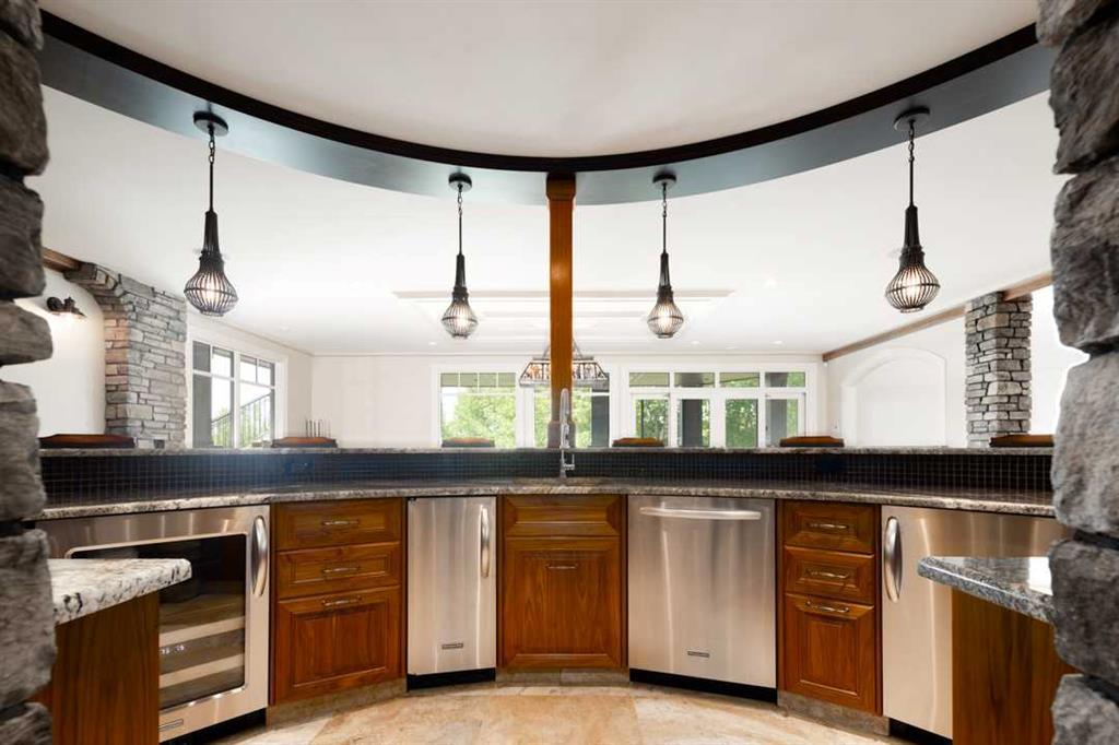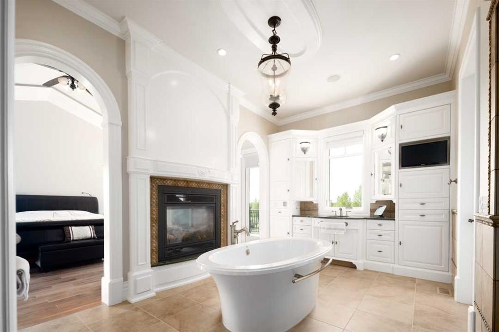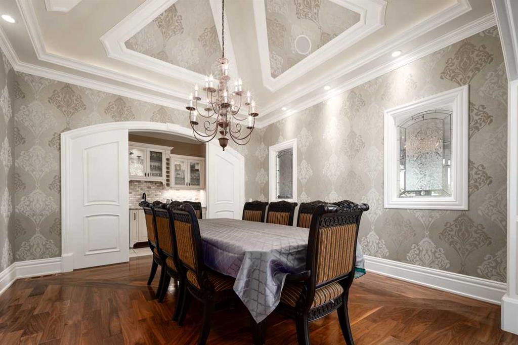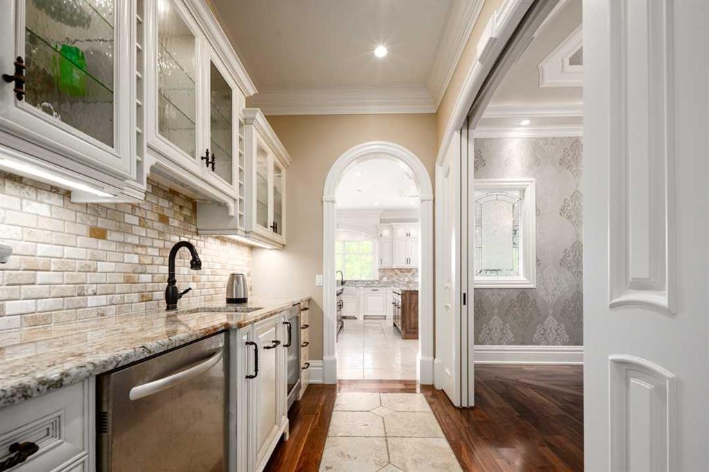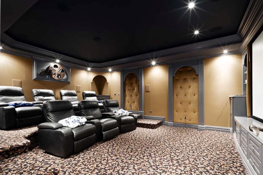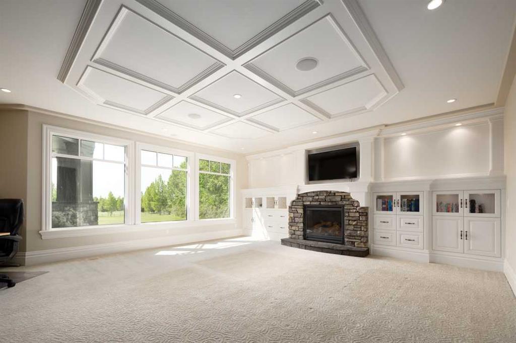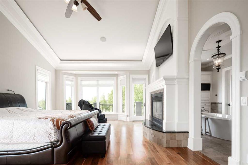 Experience timeless elegance in this extraordinary French Country Chateau, designed by Dreamworks, this architectural masterpiece is nestled on a picturesque 2-acre lot with panoramic mountain views. At the heart of the home is a magnificent 2 storey Great Room with a dramatic 20 ft barrel vaulted ceiling and floor-to-ceiling natural stone fireplace. Rich walnut hardwood floors, custom crown mouldings, and a curved walnut staircase set the tone for this warm yet opulent residence. The dream kitchen offers both function and elegance, featuring antiqued cream cabinetry, exotic granite countertops, and two expansive islands. Culinary enthusiasts will appreciate the top-tier appliance package, including a 60” Viking gas range, 48” paneled Viking fridge, KitchenAid Professional dishwasher, ice maker, and wine and beverage fridges. The layout includes a walk-through pantry with custom cabinets and granite counters, offering direct access from the garage for effortless grocery unloading, as well as a separate butler’s pantry with additional storage and prep space, perfect for seamless entertaining. The main floor showcases a luxurious primary suite featuring a double sided fireplace, bay window sitting area, private balcony access, & vaulted ceilings with ambient valence lighting. The spa-like ensuite offers a free standing BainUltra heated air-jet tub, steam shower, and an enormous double dressing room with custom-built cabinetry, drawers, and a central island. Additional main level highlights include two powder rooms, a private office, a richly paneled den with walnut coffered ceilings and custom built-ins, and a well-appointed laundry room. The upper level features two secondary bedrooms, each with private ensuite bathrooms. Downstairs, the fully finished walkout basement is a true entertainer’s paradise. A stunning circular wet bar with pendant lighting anchors the massive recreation and games room, while a dedicated media room features a 135” screen, 1080p projector, elevated theatre seating for seven, and a Dolby THX 14.2 surround sound system. A private gym with cork flooring and adjacent steam bath, a guest bedroom with 5-piece ensuite, a wine cellar with wrought iron glass doors and temperature control, and a Russound 26-speaker home stereo system complete this spectacular level. For the car enthusiast, quadruple oversized attached garages offer parking for up to 6 vehicles, featuring 12.5’ ceilings, epoxy floors with border detailing, floor drains, and direct access to the basement. Located in a serene and private setting, yet minutes from top-rated schools, Aspen Landing, the 69th Street C-Train station, and major routes including Stoney Trail. Enjoy nearby golf courses and community amenities including a playground, outdoor recreation area, pickleball court, skating rink, picnic space, and an extensive network of walking paths. This is more than a home—it’s a lifestyle. A rare and refined estate for the most discerning buyer