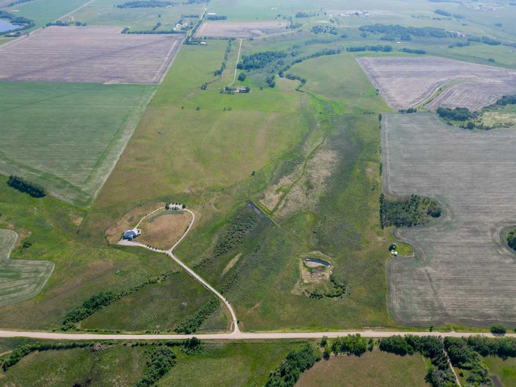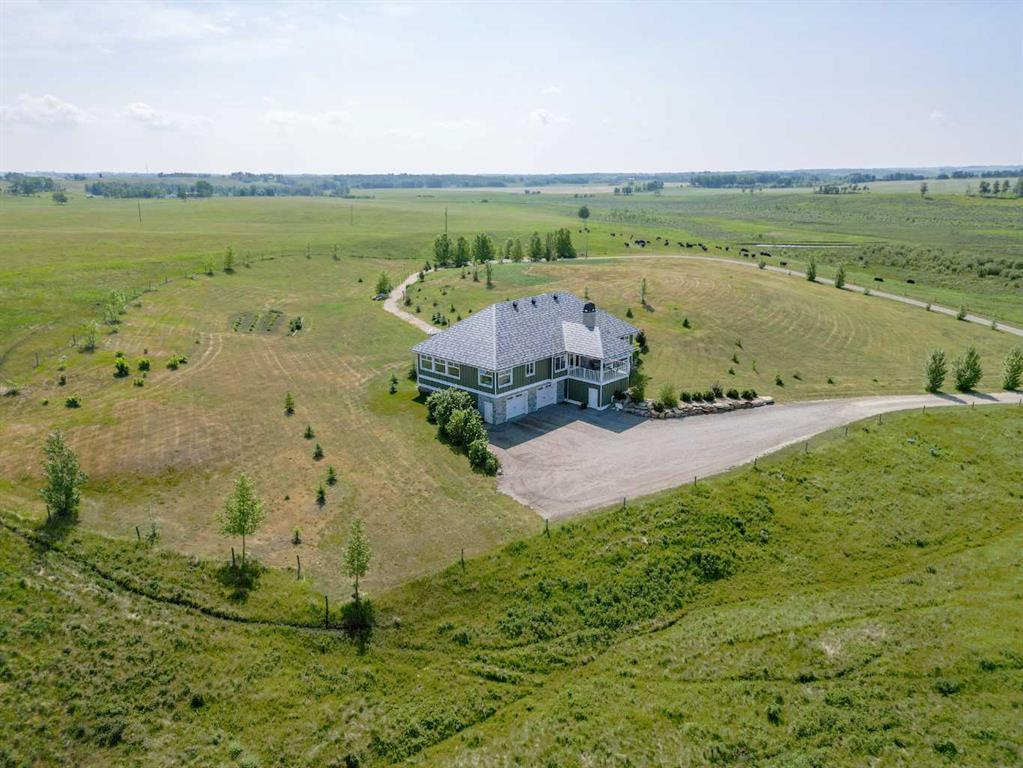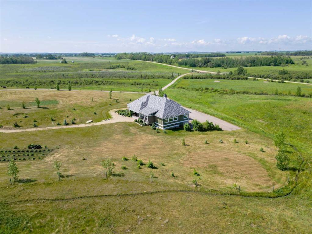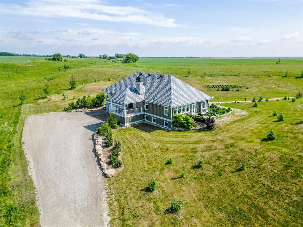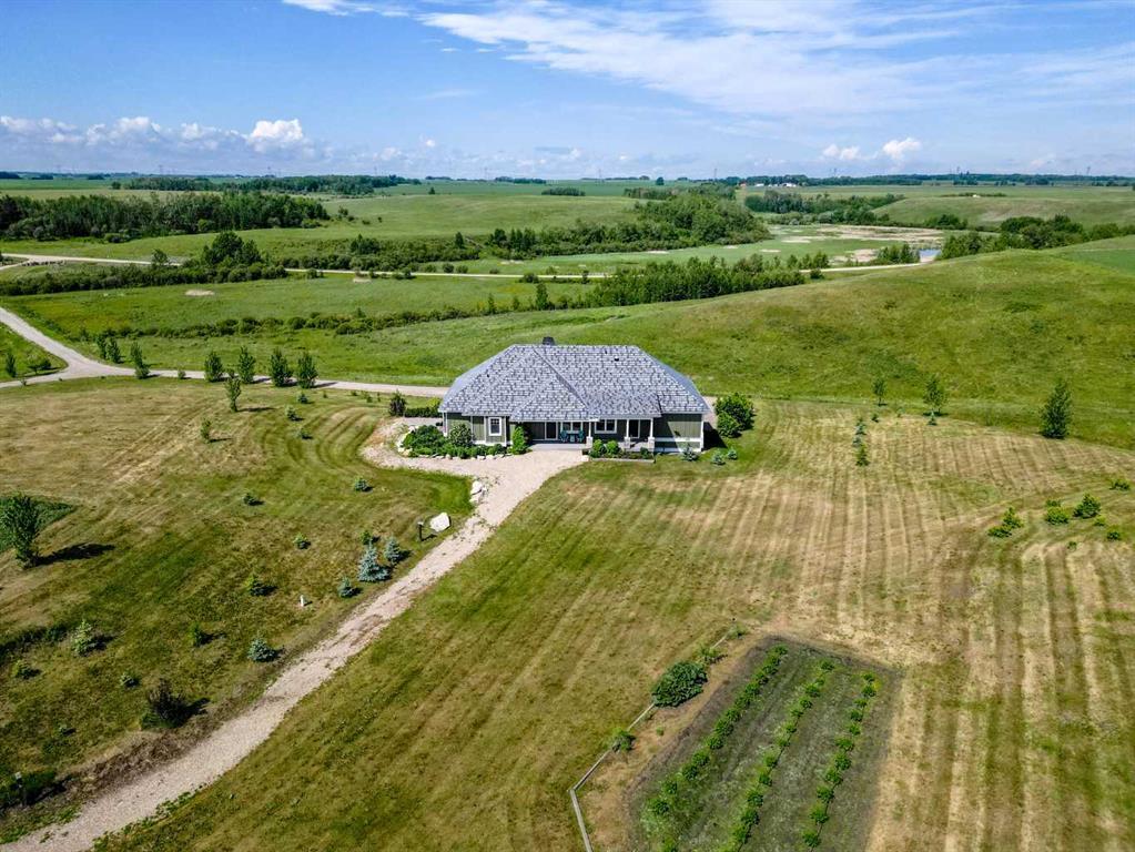 Welcome to this immaculate modern farmhouse set on 157 gently rolling acres, offering unmatched privacy, subtle luxury, and endless potential. Located just 5 minutes from the town of Olds and only 45 minutes from Calgary International Airport, this extraordinary property is the perfect blend of peaceful rural living and everyday convenience. Built with quality craftsmanship and environmental consideration throughout, the home features 18-foot vaulted shiplap ceilings, engineered hardwood floors, and an impressive stone fireplace anchoring the bright, open-concept main living area. The heart of the home is a stunning chef’s kitchen and dining space, perfect for entertaining or quiet family meals. The primary suite is a true retreat with a spacious walk-through closet, a tucked-away micro office, and a spa-like 3-piece ensuite with a massive walk-in shower and standalone tub that gazes out over the scenic countryside. This level also includes a sun-filled sitting room, three additional large bedrooms, a full bathroom, powder room, and convenient main-floor laundry. A standout feature of this home is the separately accessed yoga studio, complete with its own entrance, parking lot (hidden from the main residence), and lock-off from the home—ideal for a home-based business, gym, or creative space. Downstairs, the walk-out lower level offers a sprawling recreation room with a wood-burning fireplace, space for games or media, a fifth bedroom or office, a dedicated gear room, cold/wine storage, and a versatile music room with separate access—ideal for clients or team members coming and going. Step outside and enjoy thoughtful exterior features like a west-facing deck, expansive covered front porch, and oversized attached garage. The land includes a dugout with solar pump, natural water tributary, and a 155-foot well. Approximately 30 acres are cultivated, and the property generates income through land rental and an oil and gas lease. Within the fenced 5-acre inner yard, you’ll find a large vegetable garden, sunflower and rose beds, and a beautifully lit path connecting the yoga studio to the home. Grain storage and three natural springs round out the property’s agricultural and recreational value. Whether you’re seeking a lifestyle property, small-scale farming potential, a retreat space, or simply a beautifully built home in nature—this rare offering delivers it all.