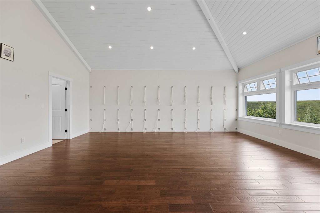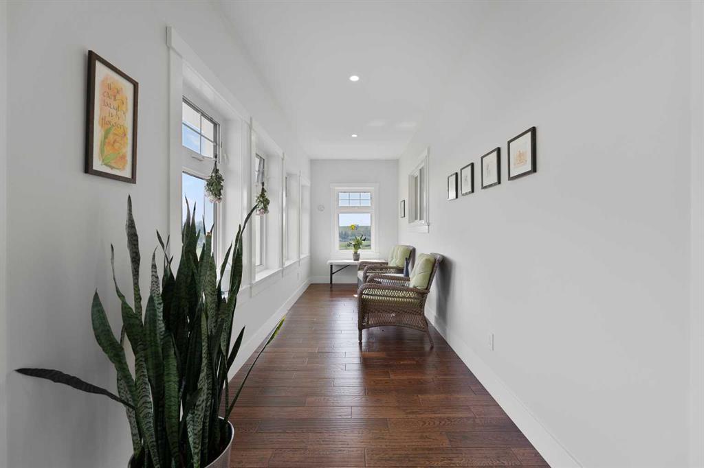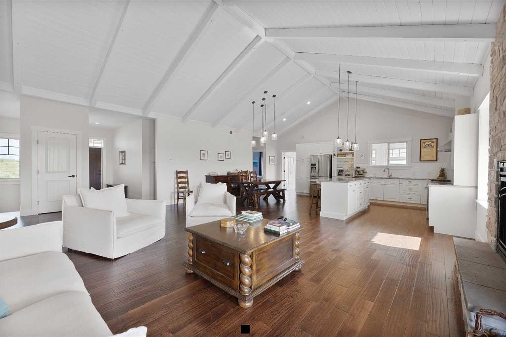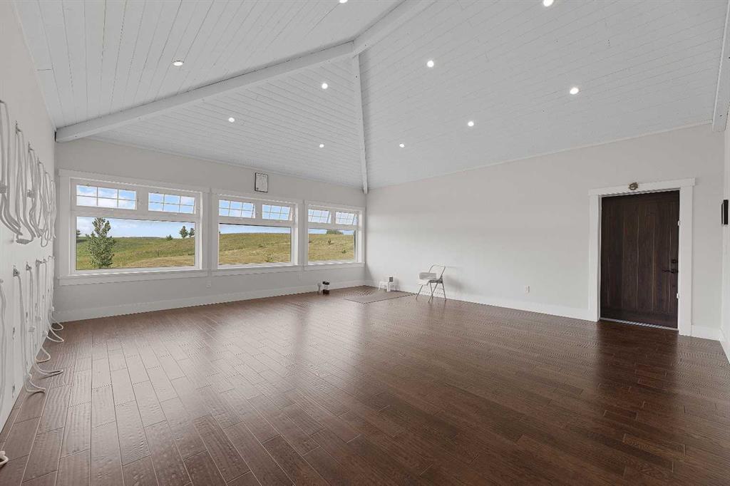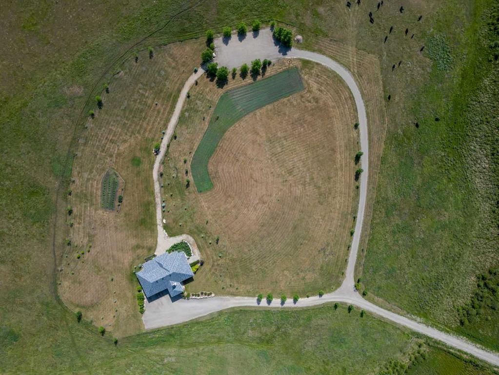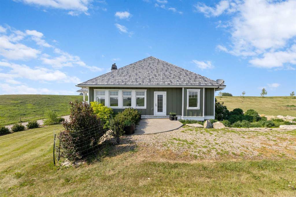 Welcome to this immaculate modern farmhouse set on 157 gently rolling acres, offering unmatched privacy, subtle luxury, and endless potential. Located just 5 minutes from the town of Olds and only 45 minutes from Calgary International Airport, this extraordinary property is the perfect blend of peaceful rural living and everyday convenience. Built with quality craftsmanship and environmental consideration throughout, the home features 18-foot vaulted shiplap ceilings, engineered hardwood floors, and an impressive stone fireplace anchoring the bright, open-concept main living area. The heart of the home is a stunning chef’s kitchen and dining space, perfect for entertaining or quiet family meals. The primary suite is a true retreat with a spacious walk-through closet, a tucked-away micro office, and a spa-like 3-piece ensuite with a massive walk-in shower and standalone tub that gazes out over the scenic countryside. This level also includes a sun-filled sitting room, three additional large bedrooms, a full bathroom, powder room, and convenient main-floor laundry. A standout feature of this home is the separately accessed yoga studio, complete with its own entrance, parking lot (hidden from the main residence), and lock-off from the home—ideal for a home-based business, gym, or creative space. Downstairs, the walk-out lower level offers a sprawling recreation room with a wood-burning fireplace, space for games or media, a fifth bedroom or office, a dedicated gear room, cold/wine storage, and a versatile music room with separate access—ideal for clients or team members coming and going. Step outside and enjoy thoughtful exterior features like a west-facing deck, expansive covered front porch, and oversized attached garage. The land includes a dugout with solar pump, natural water tributary, and a 155-foot well. Approximately 30 acres are cultivated, and the property generates income through land rental and an oil and gas lease. Within the fenced 5-acre inner yard, you’ll find a large vegetable garden, sunflower and rose beds, and a beautifully lit path connecting the yoga studio to the home. Grain storage and three natural springs round out the property’s agricultural and recreational value. Whether you’re seeking a lifestyle property, small-scale farming potential, a retreat space, or simply a beautifully built home in nature—this rare offering delivers it all.
