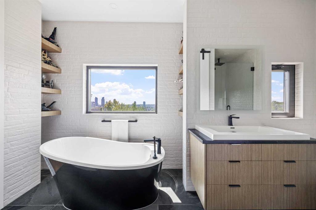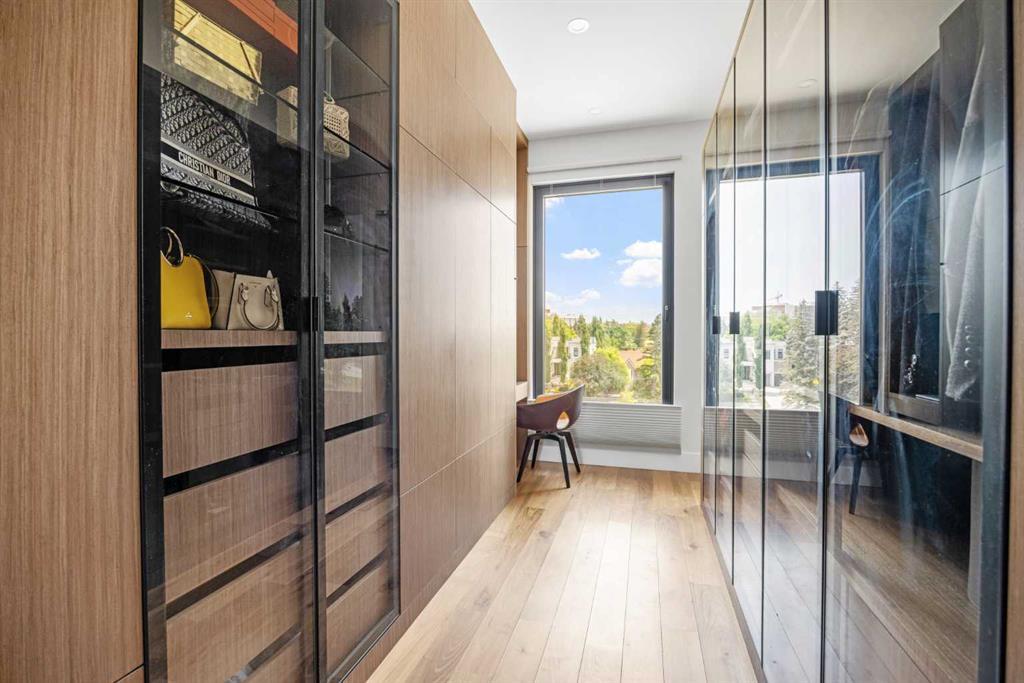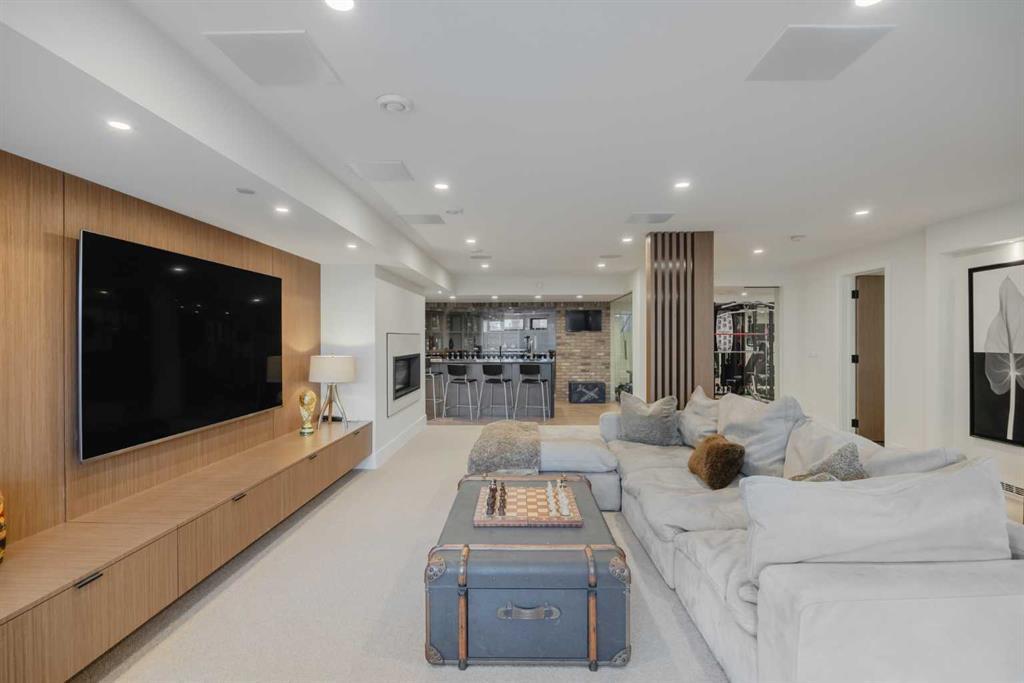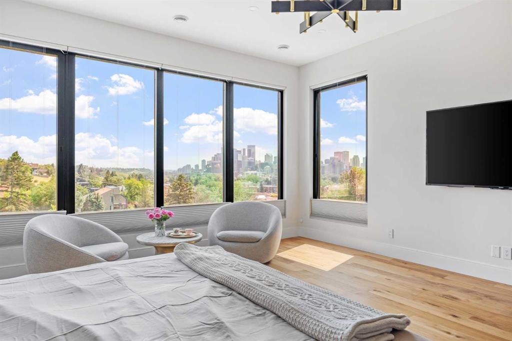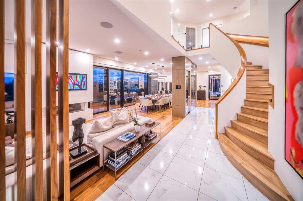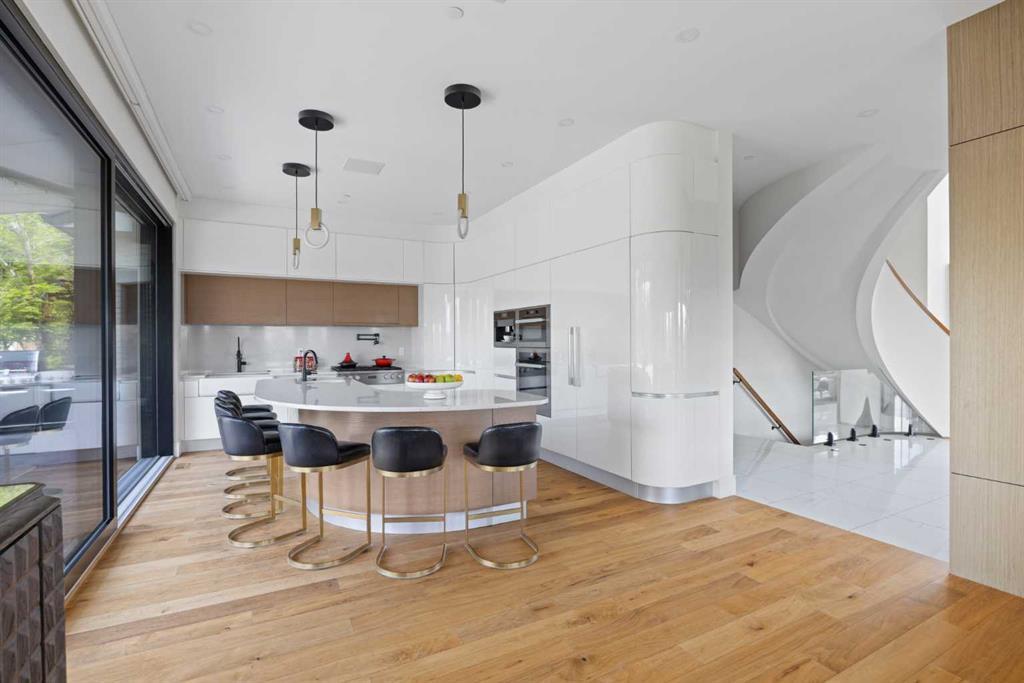 OPEN HOUSE October 25th 2-4PM. The Glasshaus is a REMARKABLE offering in Calgary’s coveted Briar Hill. This lock-and-leave luxury residence is perched on an ULTRA-EXCLUSIVE ridge lot surrounded by PARKLAND on three sides, offering unmatched PRIVACY and PANORAMIC VIEWS from east to west. A true retreat in the heart of the city, The Glasshaus blends iconic architecture with a low-maintenance lifestyle — perfect for those seeking sophisticated living without compromise. REIMAGINED FROM THE STUDS with nearly $3 million in upgrades — including new electrical, plumbing, HVAC, triple-pane windows, and custom structural reengineering — The Glasshaus is a seamless expression of comfort, functional beauty, refined living, and purposeful minimalism. Smooth stucco, brick detailing, and composite wood-look siding wrap the exterior in a sophisticated, warm-modern finish. Gaulhofer triple-pane windows from Austria, paired with a solar film, provide exceptional energy efficiency, sound attenuation, and soft natural light throughout the day. The entry opens to a 19-foot foyer anchored by the sculptural Apparatus Studio "Cloud" chandelier, floating beneath an architectural window and setting the tone for the artful design within. Airy living spaces flow around a dramatic, climate-controlled glass wine cellar — the centerpiece of the home. The Italian Pedini kitchen — with integrated Miele appliances, a curved quartz island, Matthew McCormick pendants, and handle-free cabinets — is a functional space for those with a passion for culinary arts. Finishes include Spanish hardwood flooring, Italian tile, and New Zealand wool carpet. A Control4 system manages lighting, blinds, audio, video, temperature, intercom, and security. Bowers & Wilkins speakers deliver rich sound throughout. The main level also includes a soundproof office with custom millwork and leather upholstery, a designer powder room, and laundry with quartz surfaces and smart storage. The architecturally striking curved stairwell leads to the upper level where FOUR IMMENSE bedrooms EACH INCLUDE AN ENSUITE, spacious walk-in closets, motorized blackout blinds, and incredible sunrise and sunset views. The primary suite features a downtown-facing, custom-designed bed wall, a double-sided fireplace, a built-in wardrobe, and a spa-inspired ensuite with radiant quartz counters, “gold” European fixtures, a freestanding tub, a frameless glass shower, and a Japanese-style smart toilet. The lower level hosts a second wine cellar, a wet bar, a state-of-the-art home theatre system, a glass-enclosed gym with cork flooring, a steam spa bathroom, and an open recreation space. Advanced Radon mitigation, water filtration, UV air purification, and a whole-home fire suppression system add peace of mind. Exterior upgrades include full concrete work, electric awnings, and a multi-sport court. The heated 3-vehicle garage offers lift potential. A one-of-a-kind residence, redefined for effortless living. Schedule your private showing today.