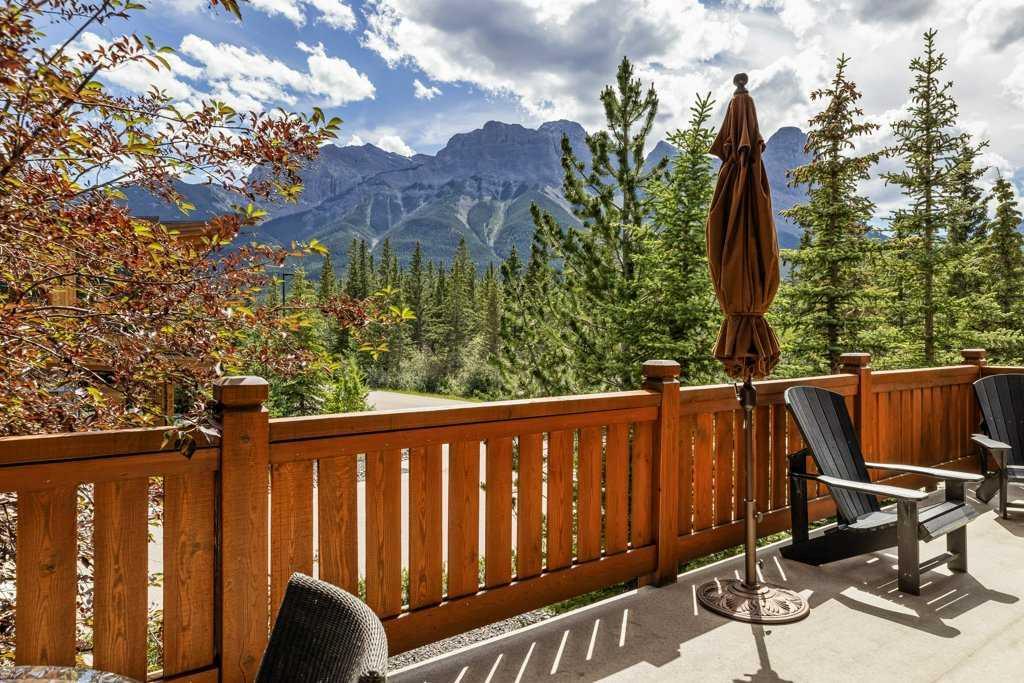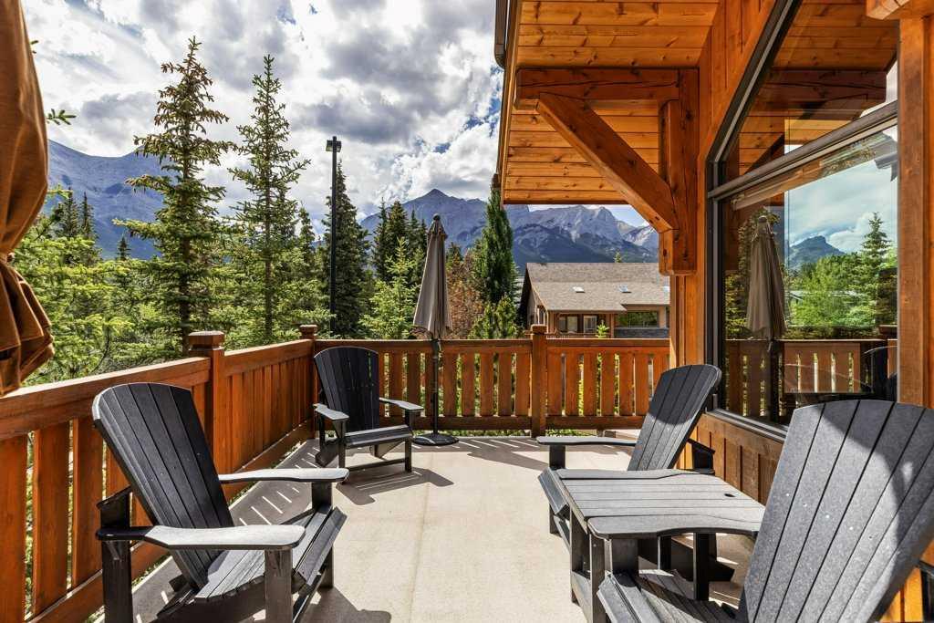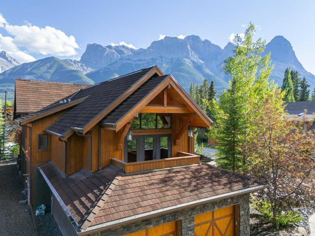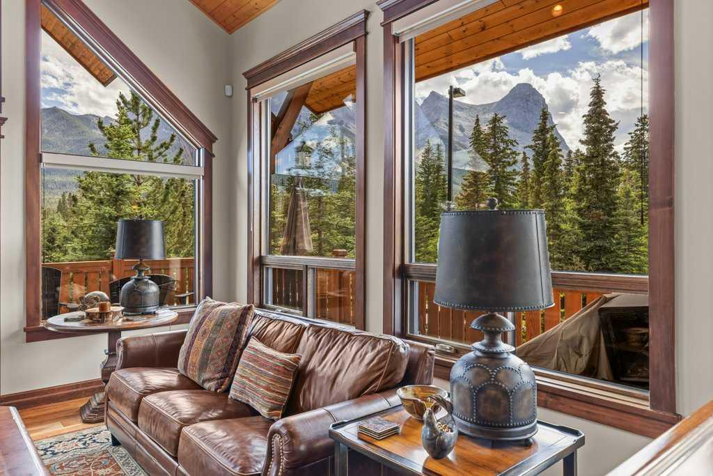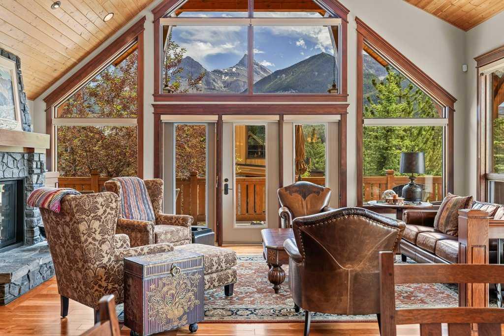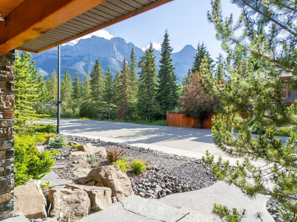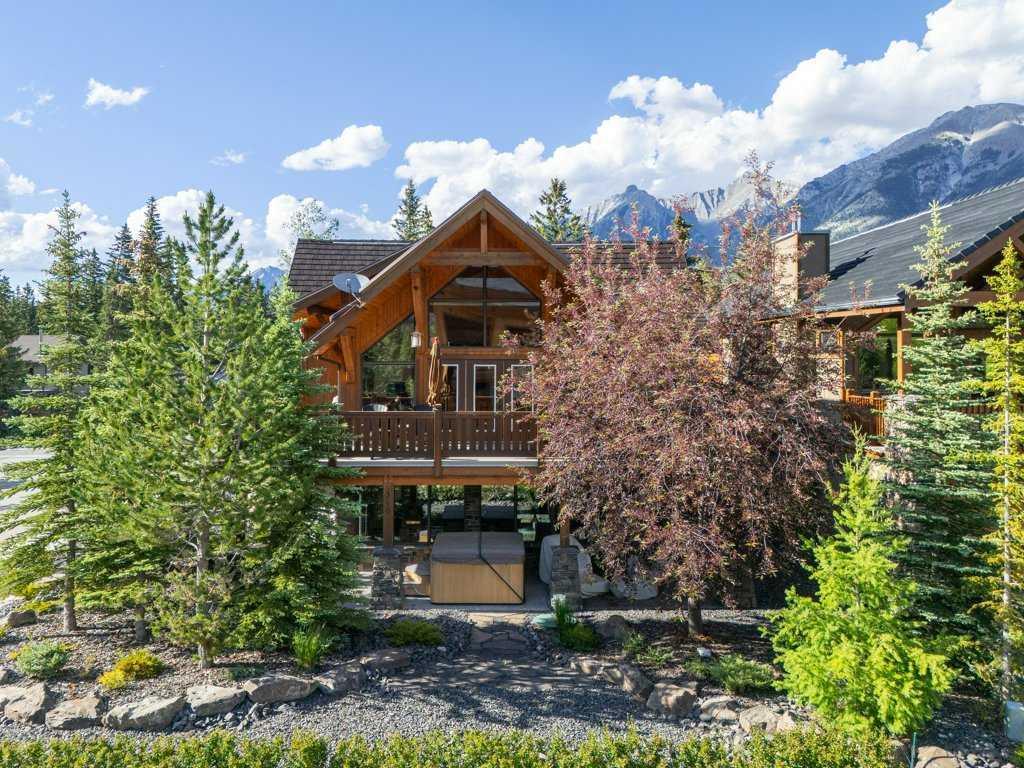 Welcome to this stunning custom mountain home, tucked away on a very private street in one of Canmore’s premium and most sought-after locations. Panoramic views from the Three Sisters to the Rundle Range fill the open-concept upper level through dramatic raked windows. A striking Rundle stone fireplace anchors the spacious living and dining areas, while the chef’s kitchen impresses with Wolf, Sub-Zero, and Miele appliances, granite counters, and an island bar. Step onto the wraparound deck for all-day sun and mountain vistas. The vaulted primary suite features its own view deck and spa-inspired 5-piece ensuite with steam shower and jetted tub. A second bedroom with ensuite, laundry, and powder room complete this level. The walkout lower level offers in-slab heat, a large family room with fireplace, two bedrooms, a 5-piece bath, and an office with custom built-ins. Finished with low-maintenance landscaping and extensive Rundle stone, plus an oversized, heated garage.