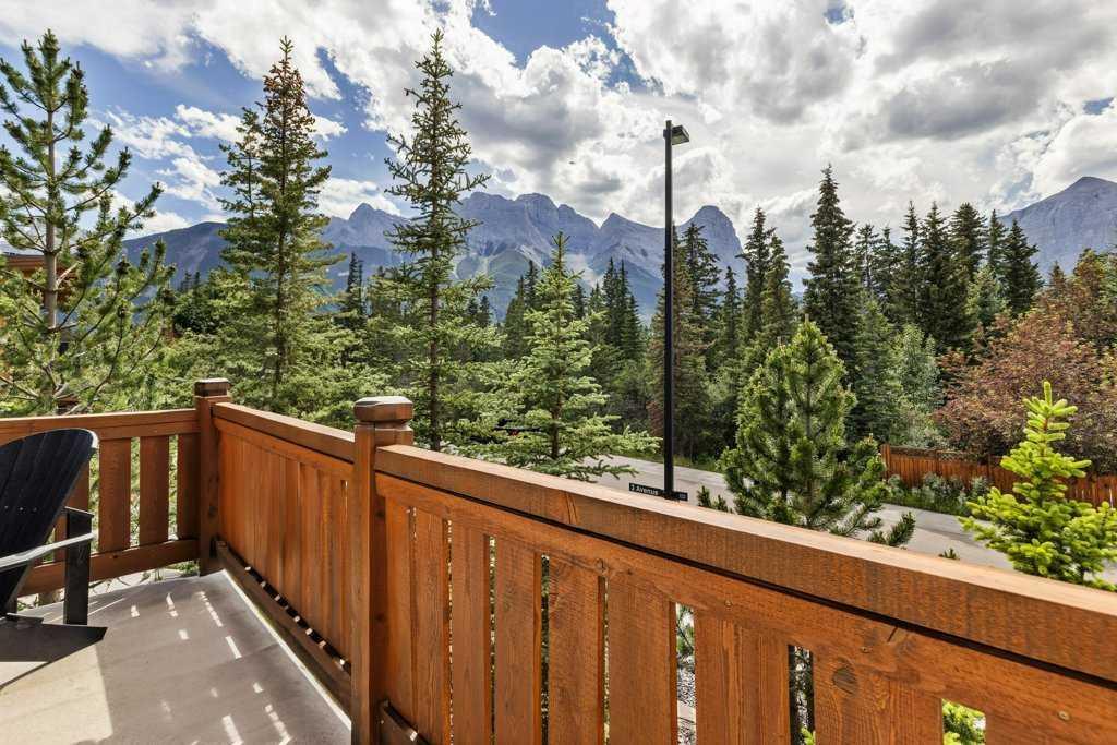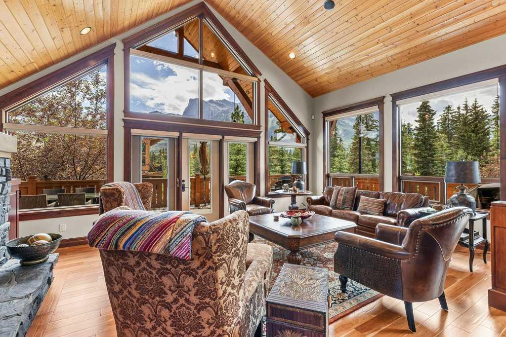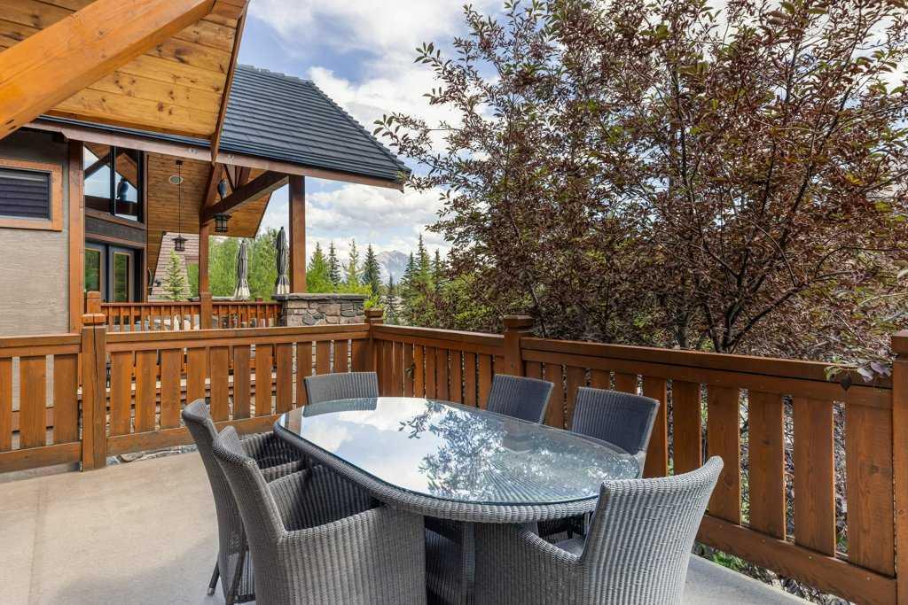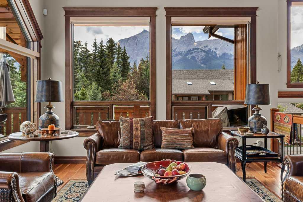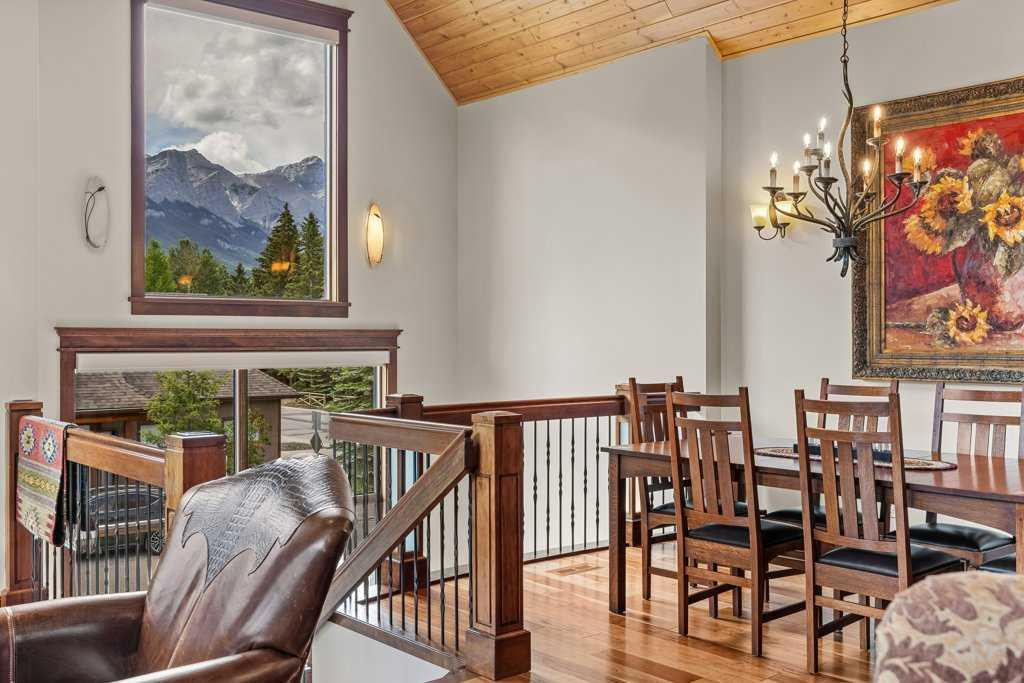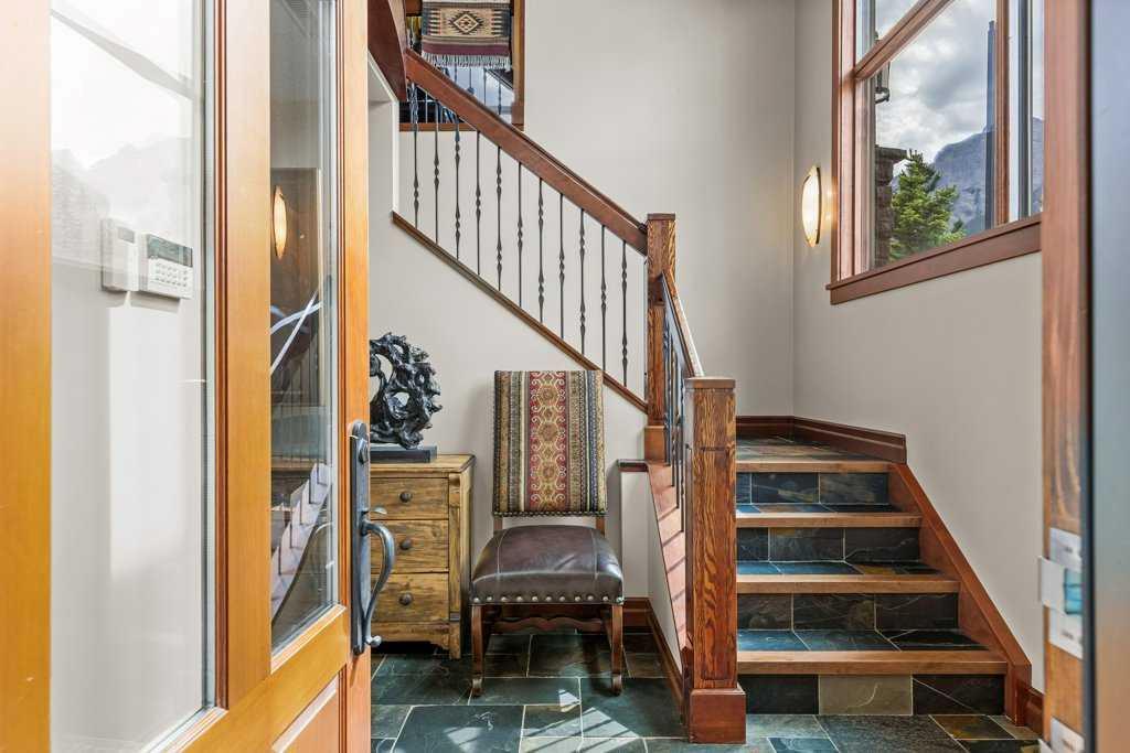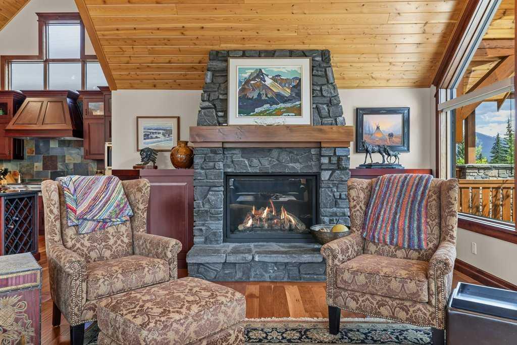 Welcome to this stunning custom mountain home, tucked away on a very private street in one of Canmore’s premium and most sought-after locations. Panoramic views from the Three Sisters to the Rundle Range fill the open-concept upper level through dramatic raked windows. A striking Rundle stone fireplace anchors the spacious living and dining areas, while the chef’s kitchen impresses with Wolf, Sub-Zero, and Miele appliances, granite counters, and an island bar. Step onto the wraparound deck for all-day sun and mountain vistas. The vaulted primary suite features its own view deck and spa-inspired 5-piece ensuite with steam shower and jetted tub. A second bedroom with ensuite, laundry, and powder room complete this level. The walkout lower level offers in-slab heat, a large family room with fireplace, two bedrooms, a 5-piece bath, and an office with custom built-ins. Finished with low-maintenance landscaping and extensive Rundle stone, plus an oversized, heated garage.
