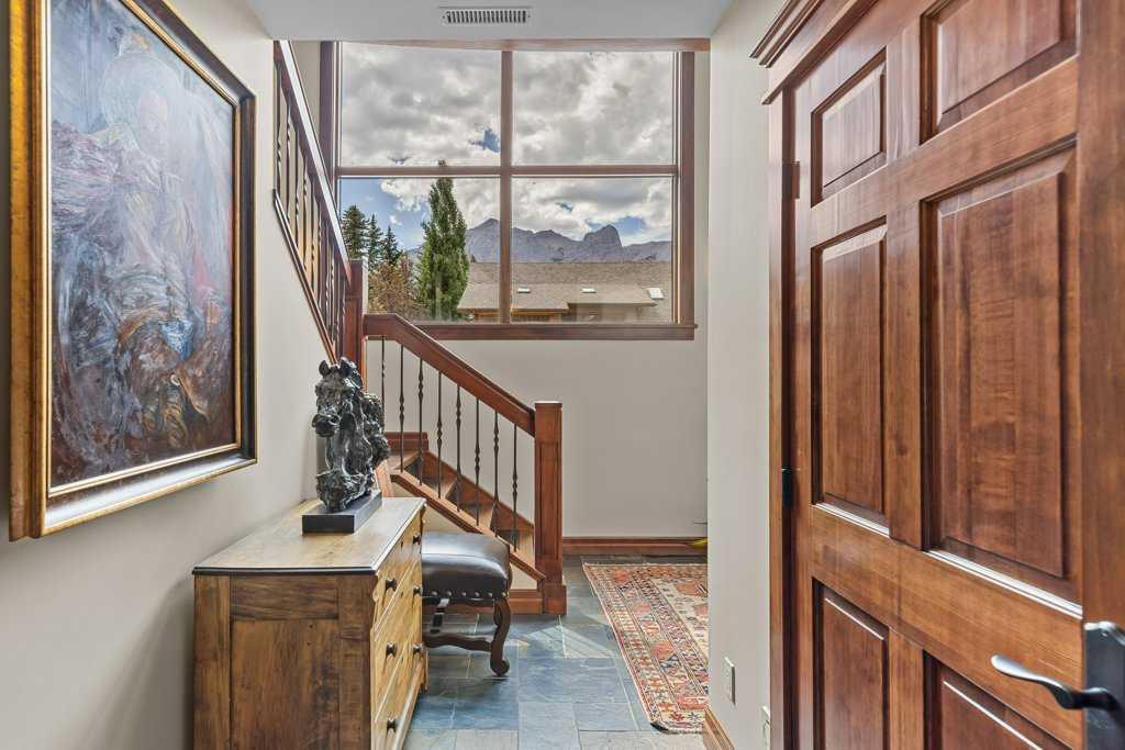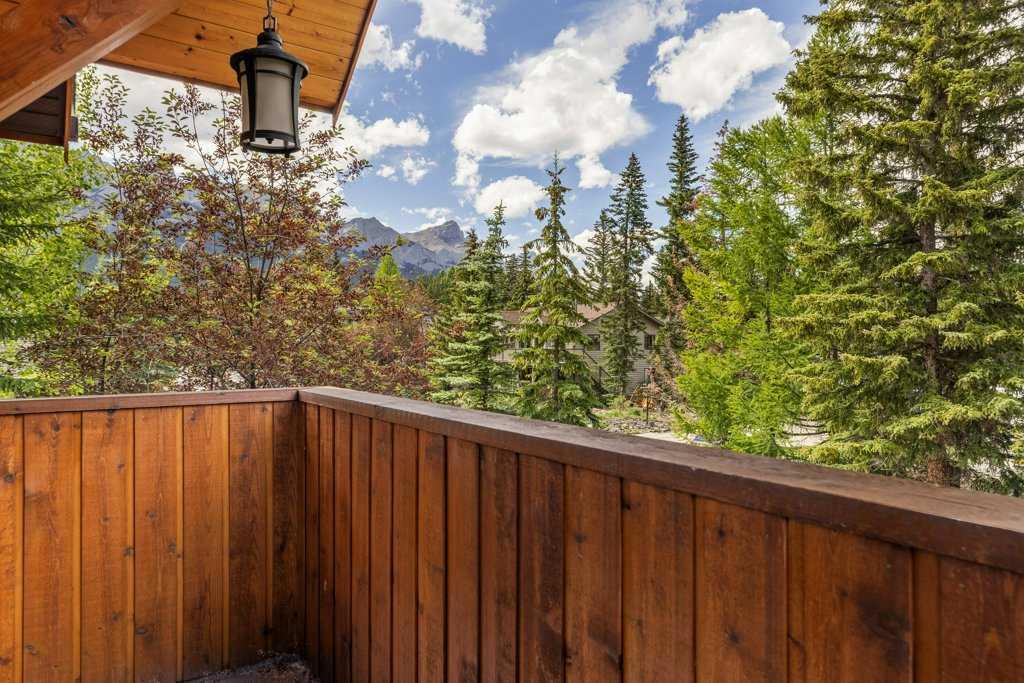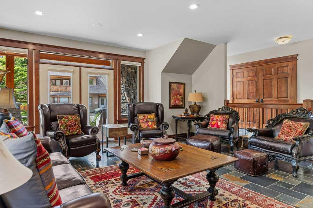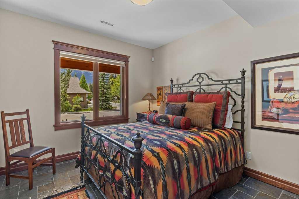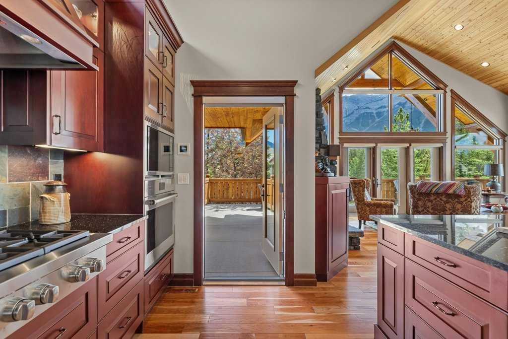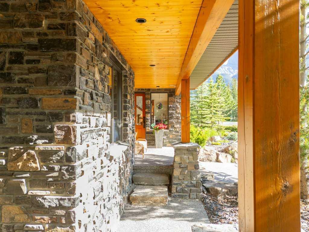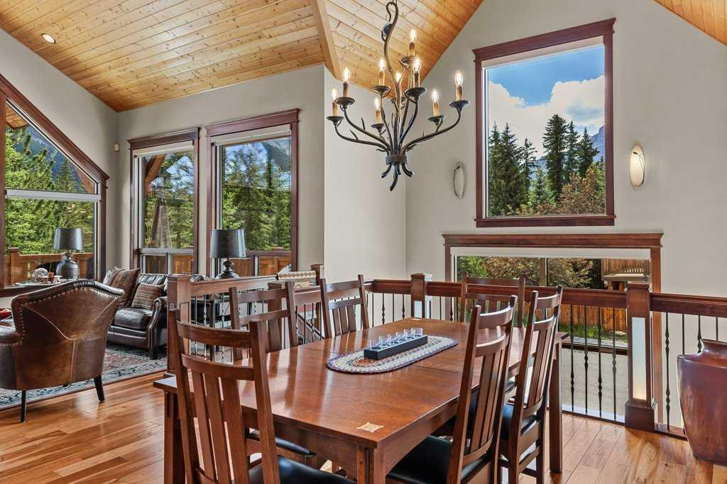 Welcome to this stunning custom mountain home, tucked away on a very private street in one of Canmore’s premium and most sought-after locations. Panoramic views from the Three Sisters to the Rundle Range fill the open-concept upper level through dramatic raked windows. A striking Rundle stone fireplace anchors the spacious living and dining areas, while the chef’s kitchen impresses with Wolf, Sub-Zero, and Miele appliances, granite counters, and an island bar. Step onto the wraparound deck for all-day sun and mountain vistas. The vaulted primary suite features its own view deck and spa-inspired 5-piece ensuite with steam shower and jetted tub. A second bedroom with ensuite, laundry, and powder room complete this level. The walkout lower level offers in-slab heat, a large family room with fireplace, two bedrooms, a 5-piece bath, and an office with custom built-ins. Finished with low-maintenance landscaping and extensive Rundle stone, plus an oversized, heated garage.