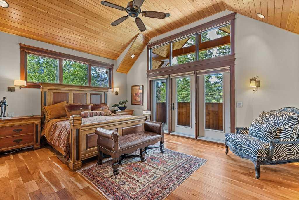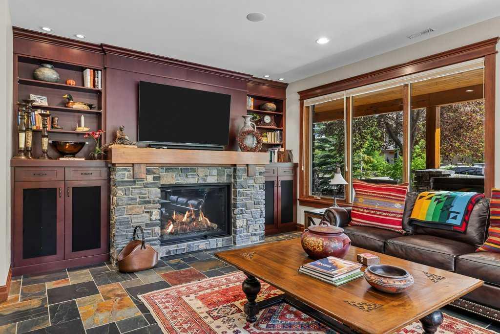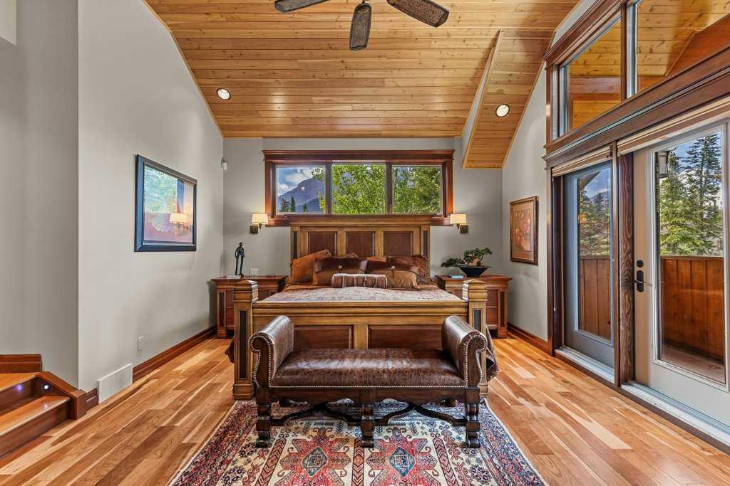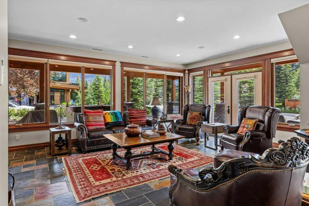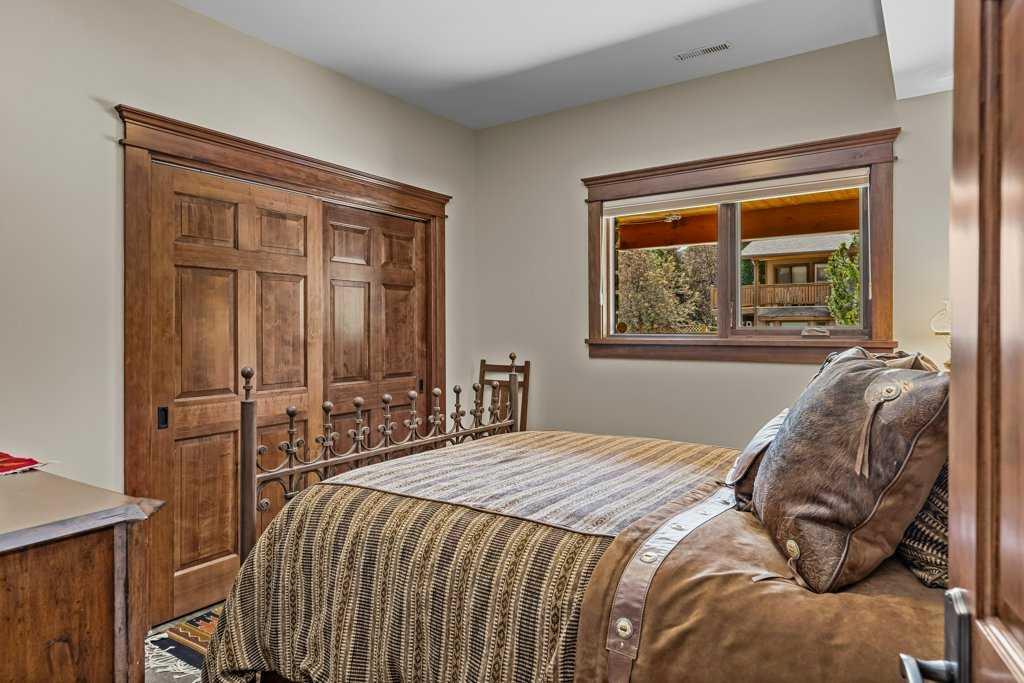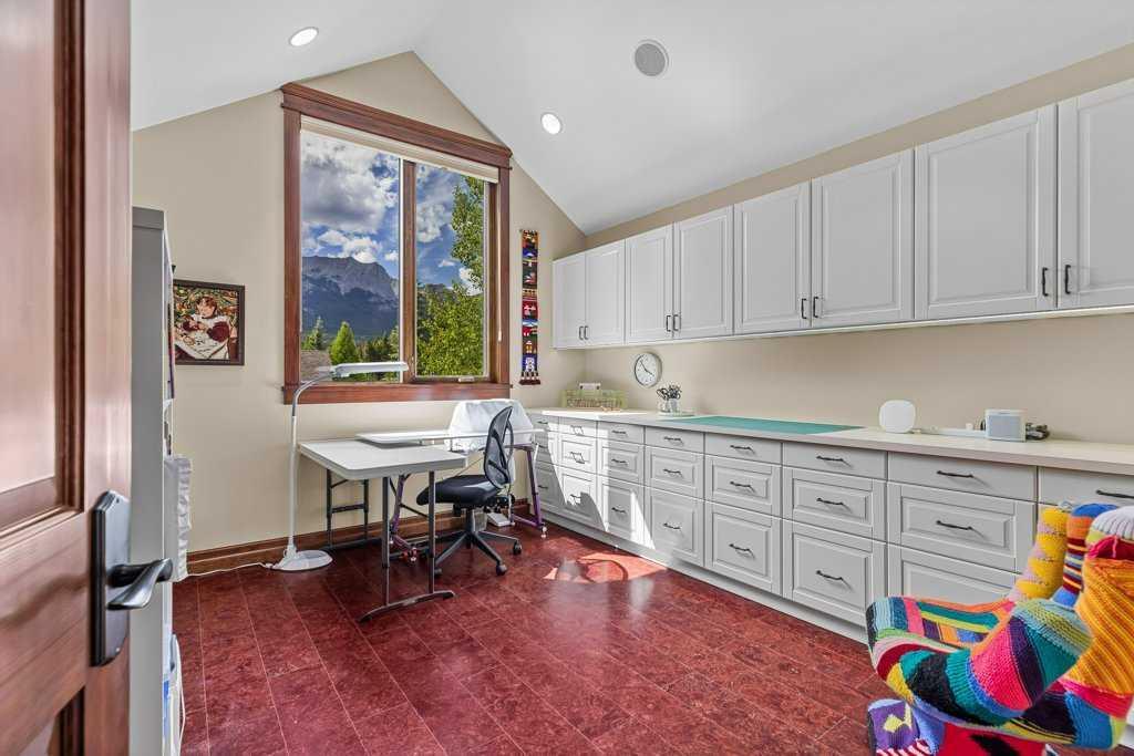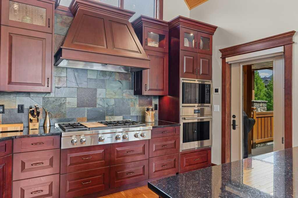 Welcome to this stunning custom mountain home, tucked away on a very private street in one of Canmore’s premium and most sought-after locations. Panoramic views from the Three Sisters to the Rundle Range fill the open-concept upper level through dramatic raked windows. A striking Rundle stone fireplace anchors the spacious living and dining areas, while the chef’s kitchen impresses with Wolf, Sub-Zero, and Miele appliances, granite counters, and an island bar. Step onto the wraparound deck for all-day sun and mountain vistas. The vaulted primary suite features its own view deck and spa-inspired 5-piece ensuite with steam shower and jetted tub. A second bedroom with ensuite, laundry, and powder room complete this level. The walkout lower level offers in-slab heat, a large family room with fireplace, two bedrooms, a 5-piece bath, and an office with custom built-ins. Finished with low-maintenance landscaping and extensive Rundle stone, plus an oversized, heated garage.