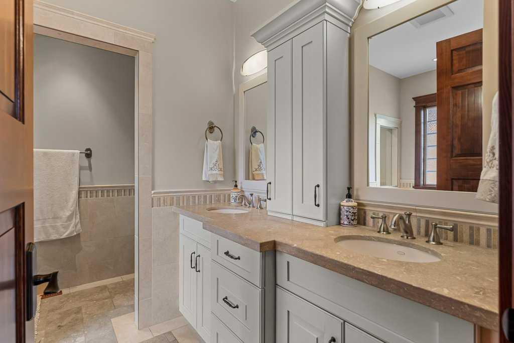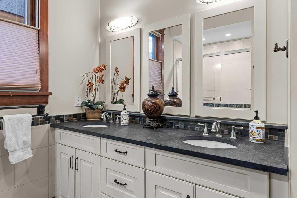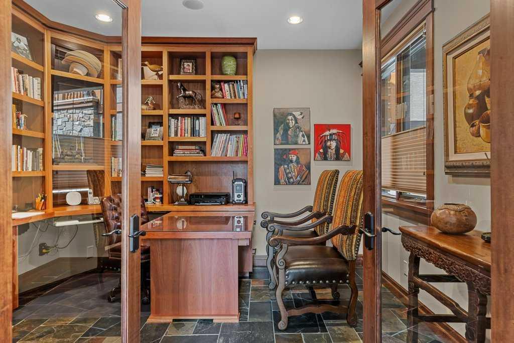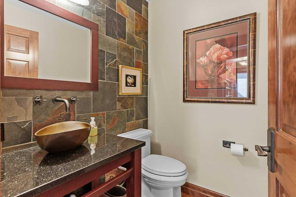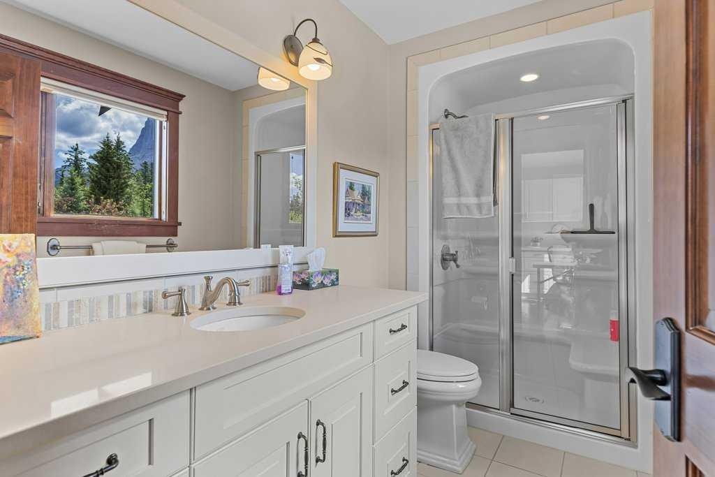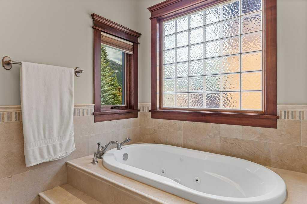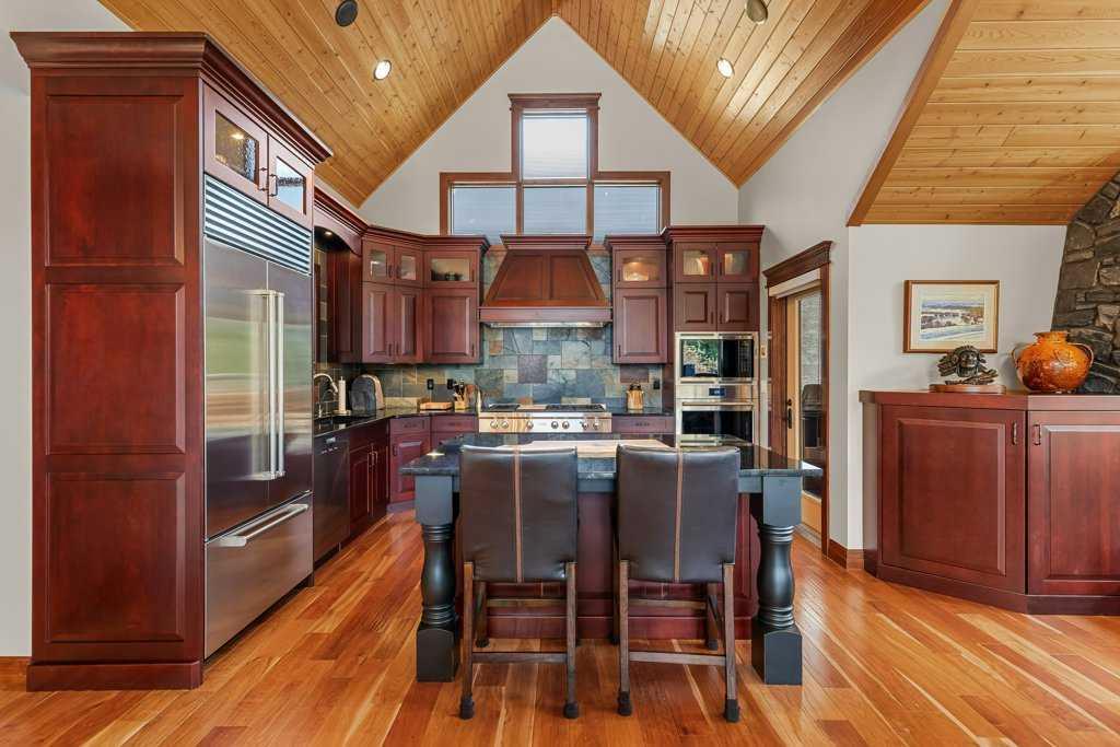 Welcome to this stunning custom mountain home, tucked away on a very private street in one of Canmore’s premium and most sought-after locations. Panoramic views from the Three Sisters to the Rundle Range fill the open-concept upper level through dramatic raked windows. A striking Rundle stone fireplace anchors the spacious living and dining areas, while the chef’s kitchen impresses with Wolf, Sub-Zero, and Miele appliances, granite counters, and an island bar. Step onto the wraparound deck for all-day sun and mountain vistas. The vaulted primary suite features its own view deck and spa-inspired 5-piece ensuite with steam shower and jetted tub. A second bedroom with ensuite, laundry, and powder room complete this level. The walkout lower level offers in-slab heat, a large family room with fireplace, two bedrooms, a 5-piece bath, and an office with custom built-ins. Finished with low-maintenance landscaping and extensive Rundle stone, plus an oversized, heated garage.