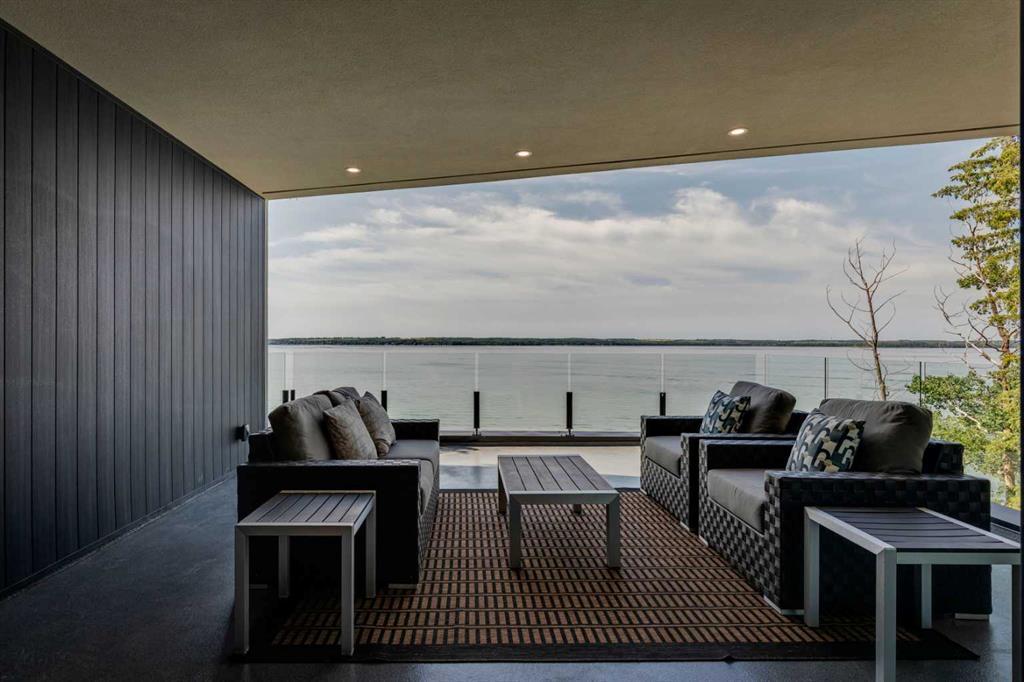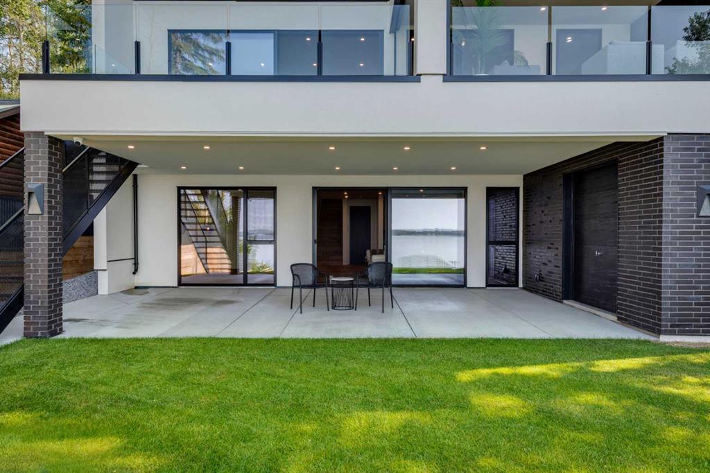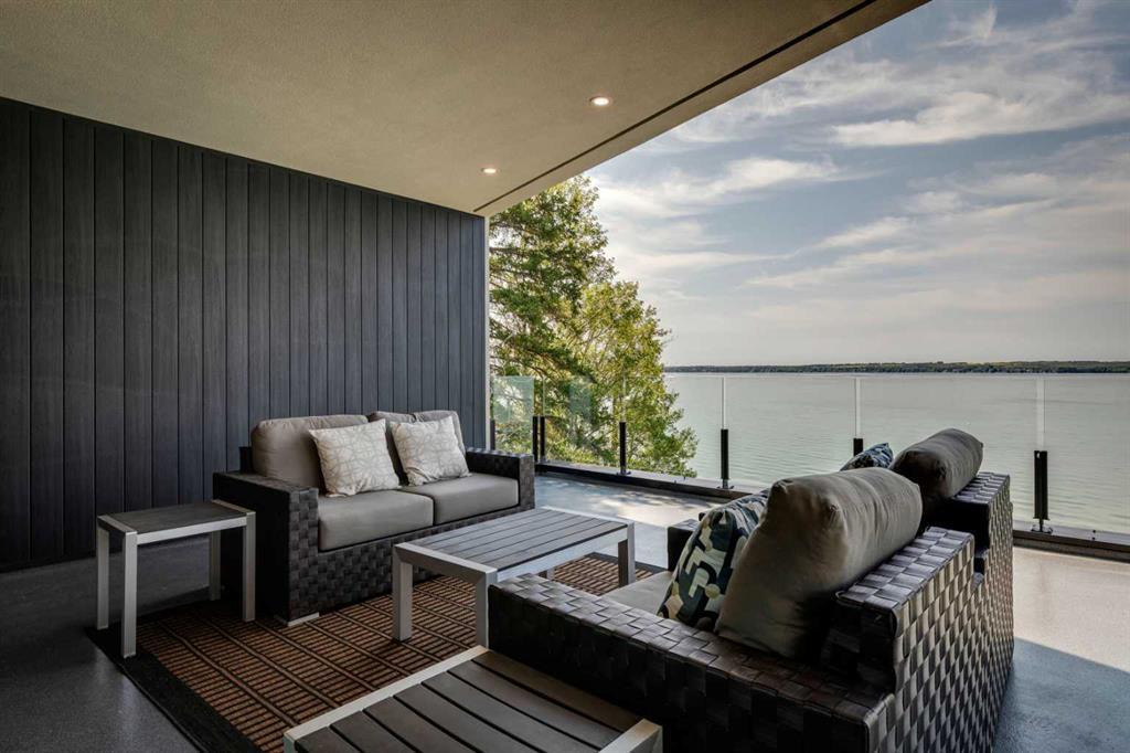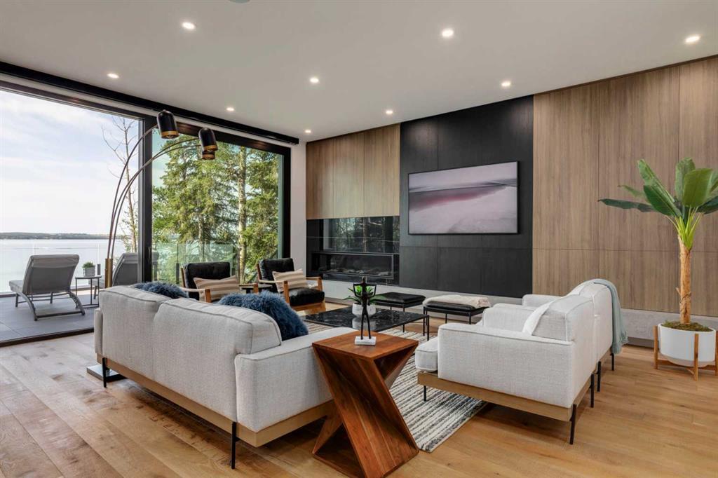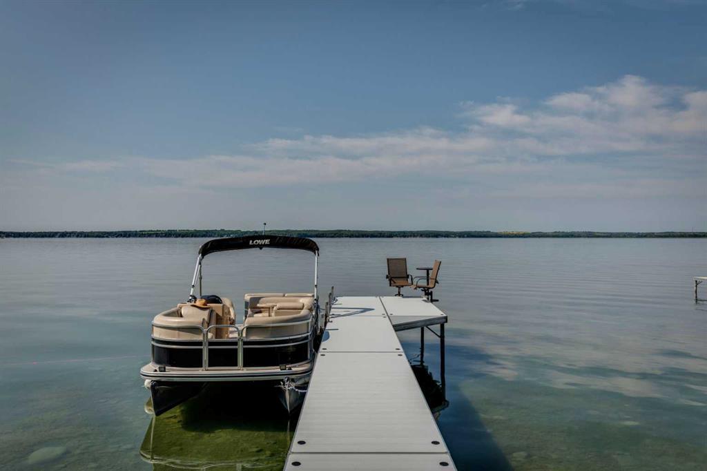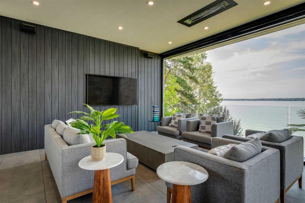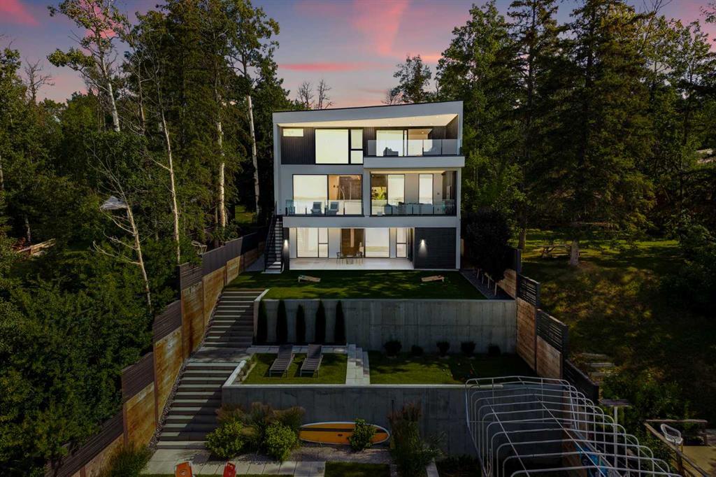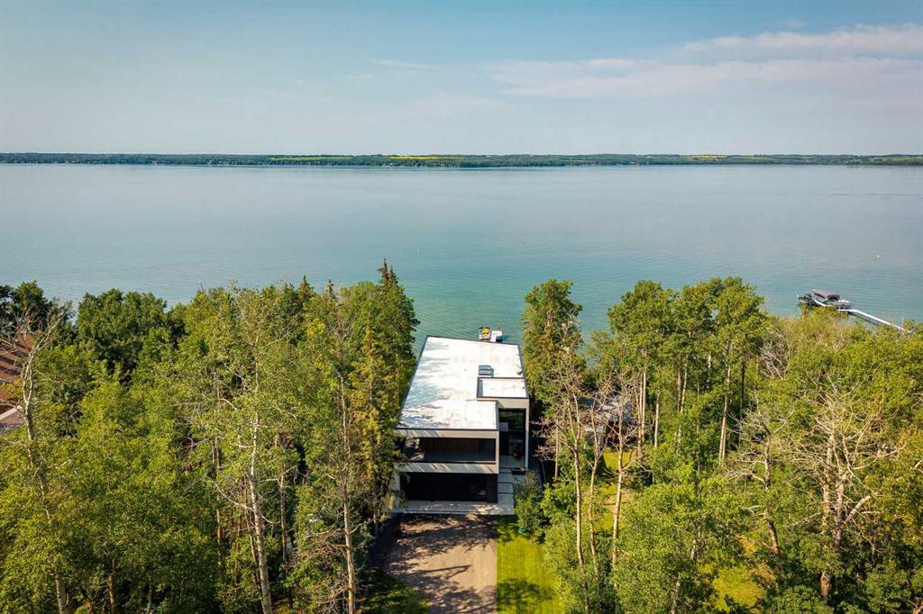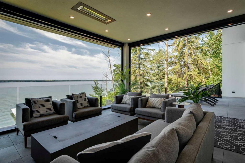 Welcome to The Cliffs — a breathtaking custom lakefront residence built by Square Structures, recipient of the Central Alberta Building Association’s Award of Excellence. This architectural masterpiece offers a seamless blend of luxury, function, and connection to nature, with panoramic south-facing lake views from every level. Designed with wall-to-wall, floor-to-ceiling triple-pane windows, the home is flooded with natural light and offers uninterrupted views of the water throughout. Step outside to enjoy 1,750 sq ft of outdoor decking, including a screened-in living space with gas fireplace, ceiling heaters and TV — the perfect extension of your indoor living. The striking exterior is finished with a premium combination of EIFS stucco, King Klinker brick, Cham Clad, and Lux Architectural panels, setting the tone for the elevated design found within. Enter through a 4’x8’ custom front door into an open-concept main floor featuring 8” wide-plank engineered white oak flooring, a spacious living area, and a fully custom kitchen complete with porcelain countertops, high-end appliances, a built-in ice maker, built-in coffee machine, induction cooktop, and a walk-through pantry housing a full-size fridge and freezer. The main floor also includes a 200 sq ft home office and seamless access to the outdoor living areas. The primary suite is a true retreat, featuring private lake-facing balcony access, a gas fireplace, and a spa-inspired ensuite with dual vanities, walk-through shower, and custom-tiled walls. Additional features include: personal GYM with wraparound balcony, WALK-OUT basement with lake views, family room, THEATRE room (100” screen & 5.1 surround sound) In-floor heating, ELECTRIC power blinds on every level, PROFESSIONALLY landscaped yard with tiered access to the water, underground irrigation, privacy fencing, and landscape lighting This is a rare opportunity to own a meticulously crafted luxury home with direct lake access and premium finishes throughout. The Cliffs is more than a home — it’s a lifestyle.