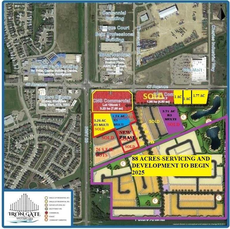 IRON GATE-SYLVAN LAKE. 88 acres of residential development land in BOOMING Sylvan Lake, with the area structure plan in place. This strategically positioned land is located on corner of Highway 20 and 47th Avenue. The area structure plan has been altered to take advantage of higher density and caters to affordable new home construction. Iron Gate is directly across from three fully developed quarter sections consisting of three district shopping centres with numerous tenants including Wal-Mart, Canadian Tire, No Frills, Sobey's, Shoppers Drug Mart, A&W, Wendy's, McDonalds. Directly supporting these shopping centres are the fully developed residential subdivisions of Ryder's Ridge, Hewlett Park and the industrial subdivisions of Cuendet Industrial Park and Norell business Park. This area has quickly become Sylvan Lake's "Go to" for shopping, commerce and residential lifestyles. Iron Gate subdivision consists consists of approximately 16 acres of commercial land, multi-family and duplex lots in the first phase, with the balance of the 88 acres ready for immediate development. Iron Gate subdivision has been designed and engineered to fully complement area growth with commercial development on the corner of Highway 20 and along 47th Avenue, and a comprehensive trail system/park areas with ease of walk-abilty and access to it's commercial component and surrounding amenities. The land is flat and dry with excellent building conditions. Take advantage of this rare opportunity with Environmental & Geotech reports available, Duck unlimited levies paid, internal roads already named, area structure plan in place. Legal and taxes to be confirmed upon final subdivision.
