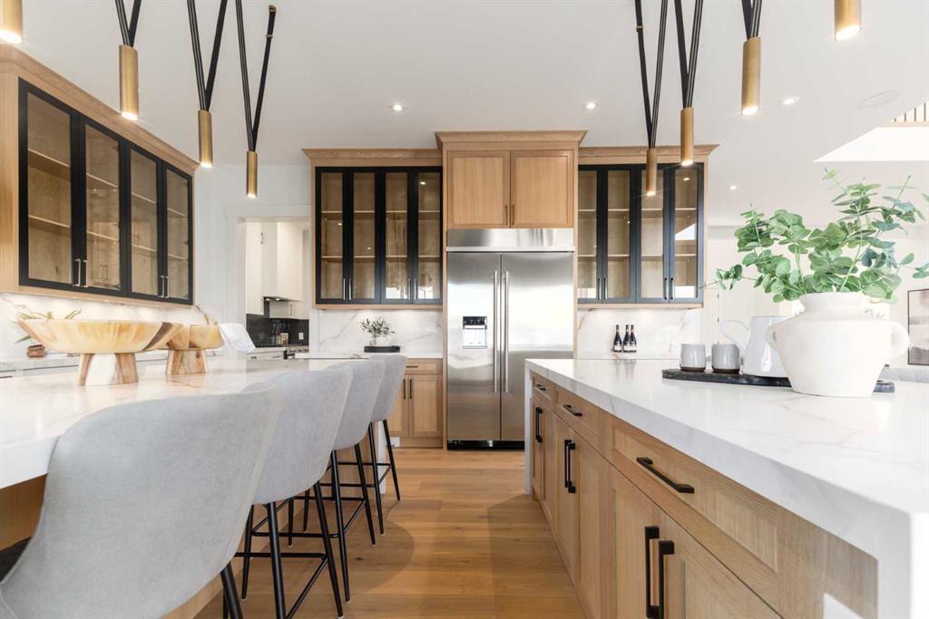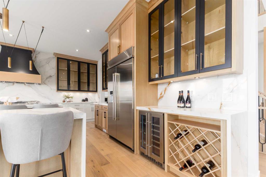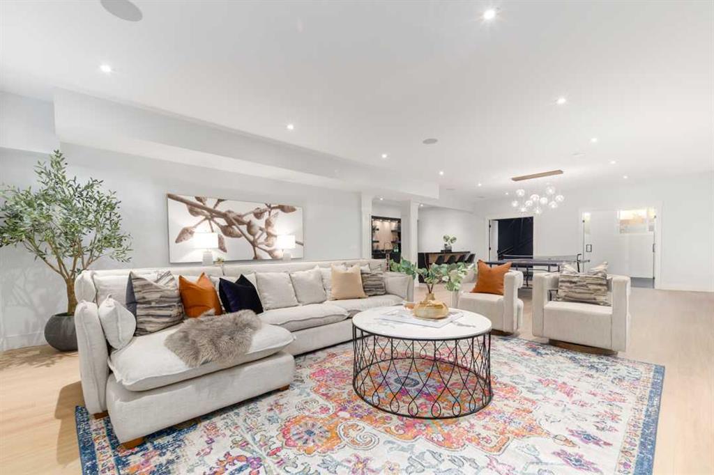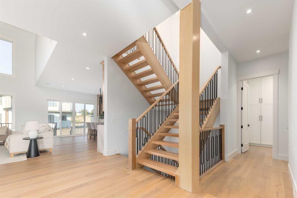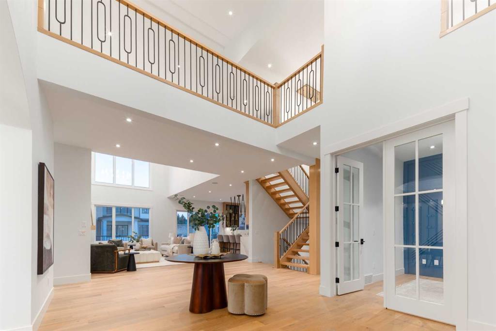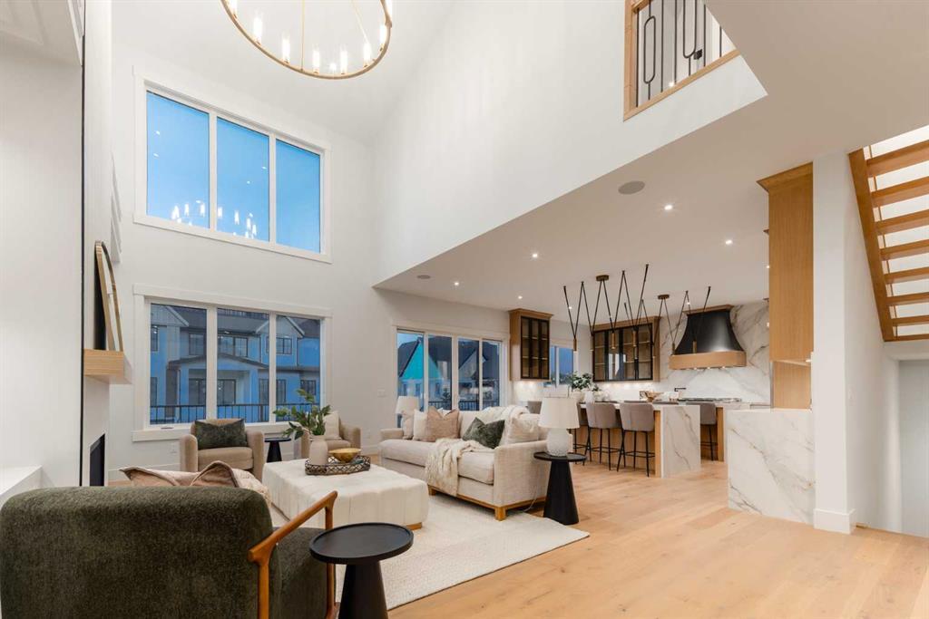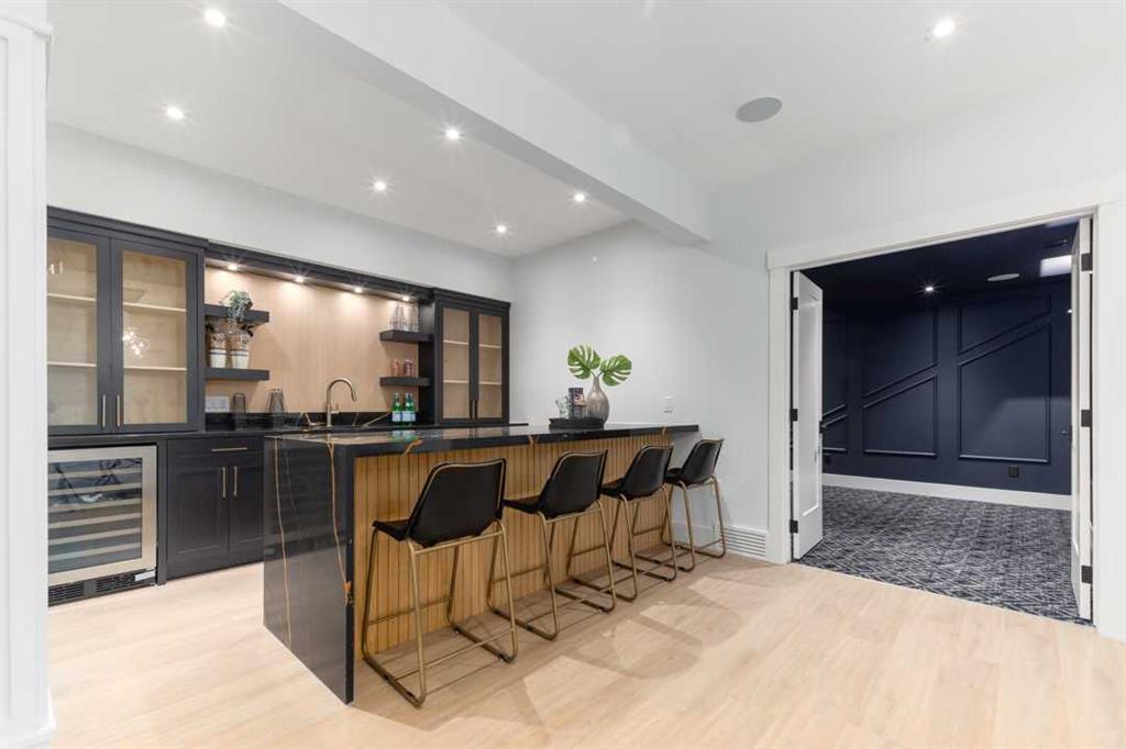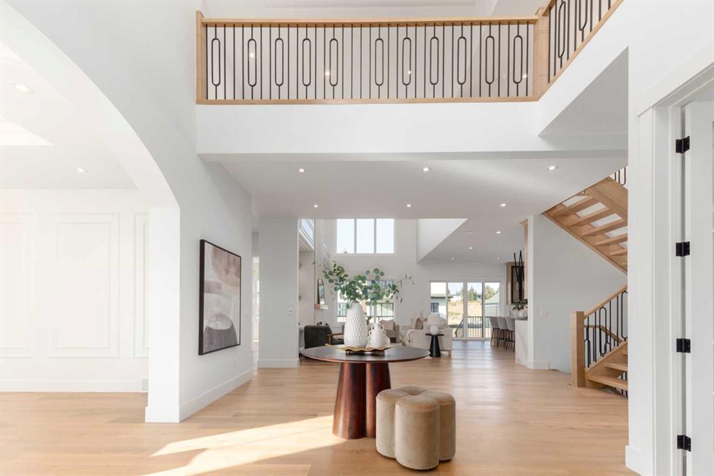Discover the epitome of luxury living at 200 Pondside Place, an extraordinary 7-bedroom, 6.5-bath estate in the prestigious community of Watermark at Bearspaw. Designed with families in mind, this home combines architectural elegance with modern functionality across nearly 6,800 sq ft of developed space. A striking façade of smooth stucco, black wood accents, and stone detailing sets the tone, while a four-car garage and exposed aggregate driveway provide both practicality and curb appeal. Inside, soaring ceilings, wide-plank oak floors, and expansive windows create a light-filled atmosphere that is as welcoming as it is refined. The gourmet chef’s kitchen is a true showpiece, featuring dual waterfall quartz islands, professional-grade Jenn-Air appliances, integrated wine storage, and a fully equipped spice/prep kitchen. The adjoining great room showcases a soaring fireplace wall and custom built-ins, perfect for both family gatherings and elegant entertaining. Formal dining is elevated with a glass-encased wine display and coffered ceiling, while a private main-floor office, guest suite, and stylish powder room add everyday convenience. Upstairs, the primary suite is a serene retreat with a boutique-style walk-in closet, spa-inspired ensuite with soaking tub and rainfall shower, and space for private lounging. Three additional bedrooms each feature their own ensuite and walk-in closet, while a flex loft/media space and a fully outfitted laundry room complete the level. The lower level is designed for recreation and relaxation, offering a spacious rec room with wet bar, fitness studio, plush theater room, and two additional bedrooms. Radiant in-floor heating throughout the lower level ensures year-round comfort. Set on a beautifully landscaped 0.28-acre lot, this home includes speaker zones, central vac, gas BBQ hookup, gas garage heater and smart-home rough-ins for modern living. Beyond the property, Watermark is one of Calgary’s most sought-after family communities, renowned for its strong sense of community, scenic pathways, and access to top schools and amenities. With nearby shopping, dining, recreation centers, and a quick drive into the city, it is the perfect balance of tranquility and convenience.