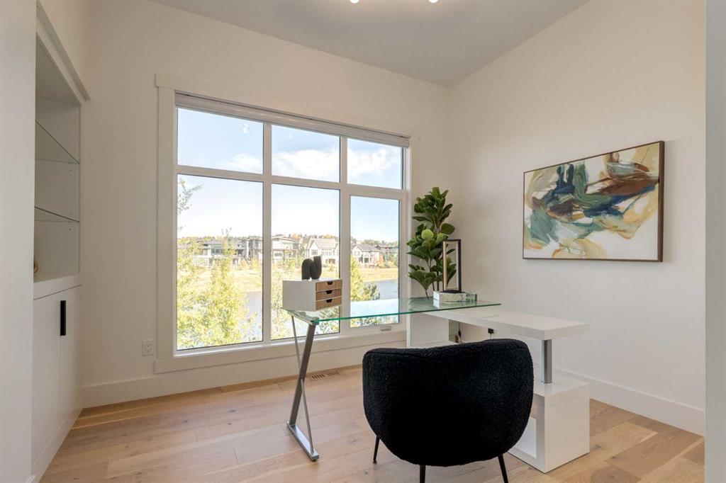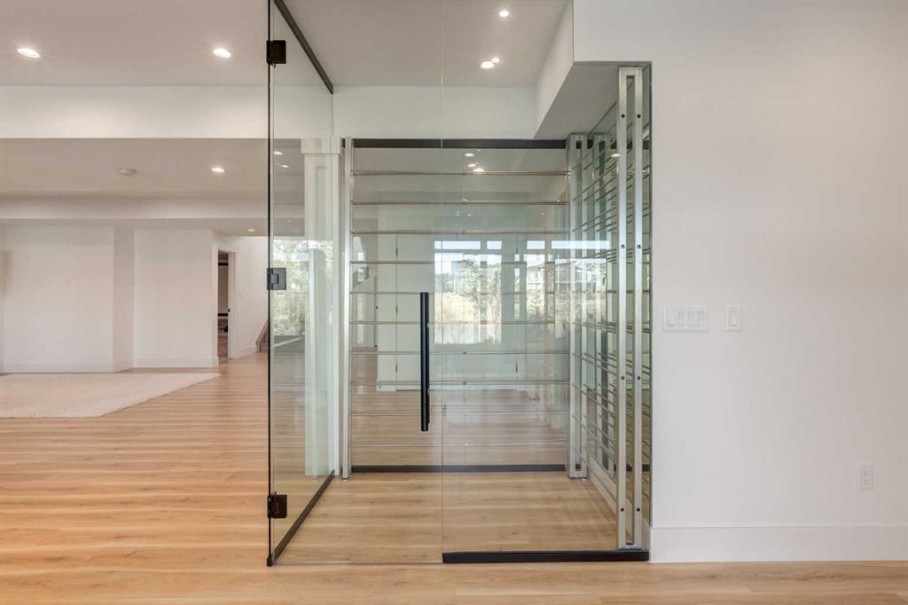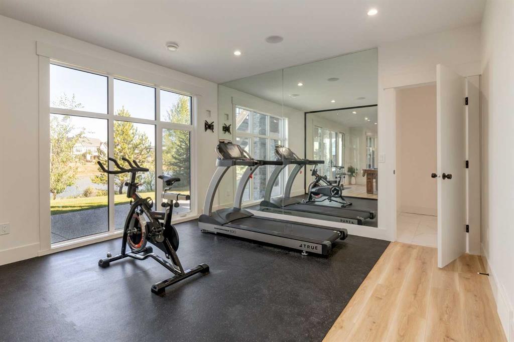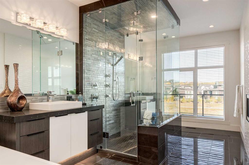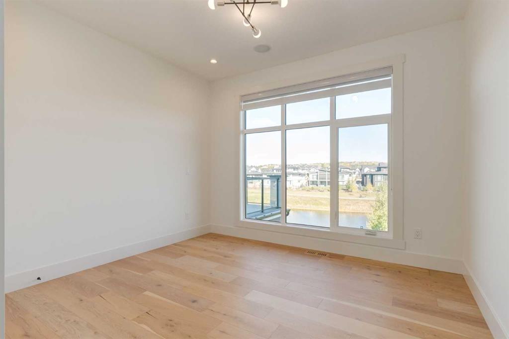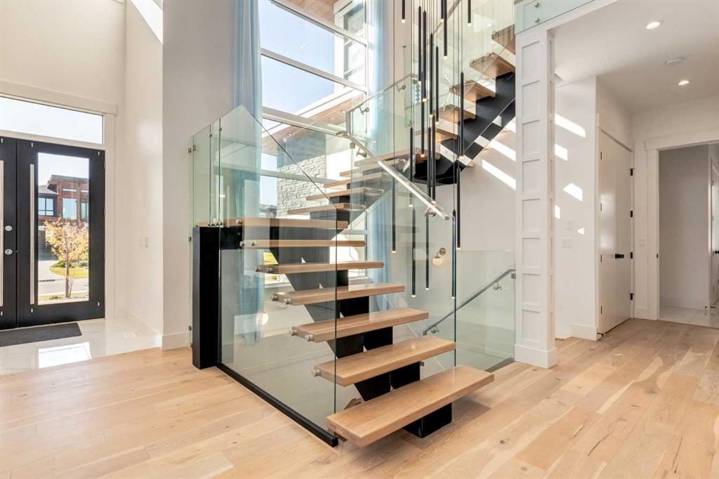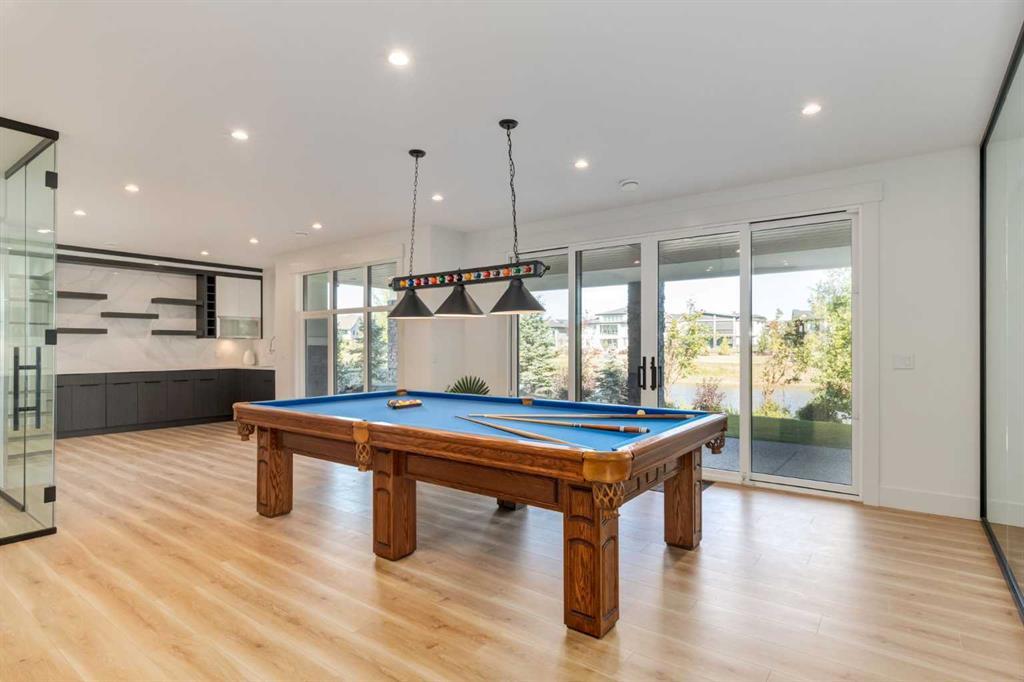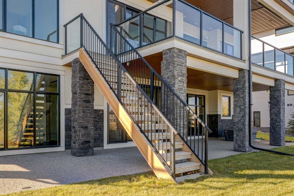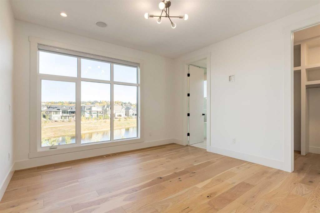 Welcome to this extraordinary WATERFRONT ESTATE in the prestigious community of WATERMARK AT BEARSPAW. Situated on a premium 0.29-acre lot backing onto a serene pond, this residence offers over 7,000 sq ft of luxurious living space with 7 bedrooms, 6.5 bathrooms, and two master suites, including one on the main floor. Designed with elegance and functionality in mind, the home features soaring 10-foot ceilings, 8-foot doors, an open-to-above foyer, and extra-wide hallways, all contributing to a grand and airy ambiance. A neutral color palette is paired with refined finishes such as engineered hardwood flooring, built-in speakers, heated flooring, and 12mm glass features throughout. The heart of the home is a stunning chef’s kitchen equipped with premium Thermador stainless steel appliances, a gas cooktop, quartz countertops, a spacious central island with a built-in banquette, and a separate spice kitchen or butler’s pantry. Adjacent to the kitchen is a formal dining room with a custom feature wall, a large family room with an upgraded linear gas fireplace, and a dedicated home office. The main-floor master suite includes a luxurious 5-piece ensuite, a generous walk-in closet, and private access to a serene outdoor patio. Upstairs, the primary suite offers a true retreat with a double-sided gas fireplace, an opulent 5-piece ensuite, an oversized shower, a walk-in closet with a custom island, and its own private patio with waterfront views. Three additional bedrooms, two with ensuite access & walk-in closets, while the upper floor also includes a bonus room with tray ceilings, a sleek glass-enclosed library, and a full laundry room with a sink. The walk-out basement is an entertainer’s dream, featuring a spacious recreation and games area, a wet bar, an elegant wine cellar, and a beautifully designed home theatre with a second wet bar. This level also includes a glass-walled gym, two large bedrooms, a full bathroom with a steam shower, and access to a future hot tub area. Outdoor living spaces include an upper deck with an outdoor theatre (wired for heaters & Motorized screens), and a lower concrete patio, all with spectacular water views. Additional highlights include a fully finished quad garage with extra storage and heater rough-ins, walk-in closets in all bedrooms with custom MDF shelving, dedicated laundry on each floor, double furnace, tankless water heater, water softener, and central vacuum system with multiple vac pans. Located on a quiet, central street in Watermark—an award-winning estate community—this impeccable home combines thoughtful design with premium features and finishes. One of the premier homes on one of the most desirable lots in the community makes this property a must-see if you're looking for luxury living at its finest!!! OPEN HOUSE SAT. OCT 18TH 2:00-5:00 & SUN OCT 19TH 1:00-4:00!!