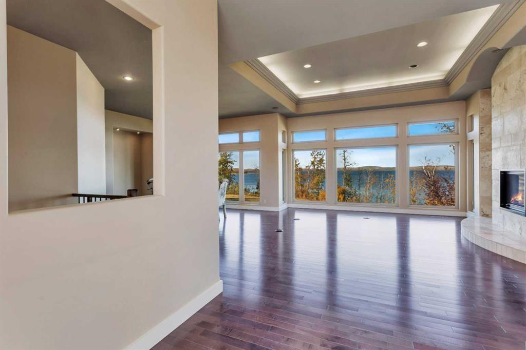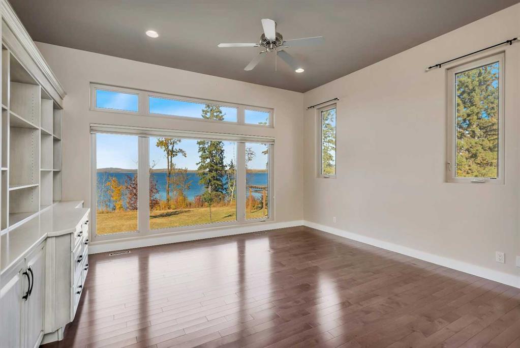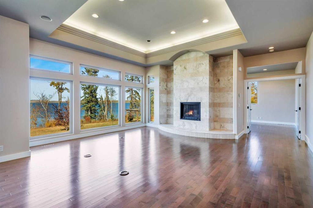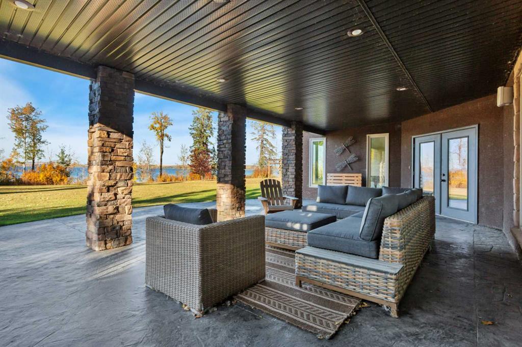 A rare opportunity to own an exceptional lakefront estate on 74 acres of prime Alberta countryside. This prestigious walkout bungalow offers an unmatched blend of luxury, privacy, and natural beauty, all with Riparian water rights. Located on 22108 Township Road 392 in Lacombe County, this residence exudes timeless elegance with custom finishes and breathtaking lake views throughout. Step inside to a chef-inspired kitchen, complete with granite countertops, custom cabinetry, and a layout designed for both daily living and entertaining. The expansive living room features coffered ceilings, a grand marble-faced fireplace, and floor-to-ceiling windows that showcase unobstructed water views. The primary retreat is a sanctuary of its own, with built-in cabinetry, panoramic lake-facing windows, a spa-inspired ensuite with walk-in shower, and an impressive walk-in dressing room. The lower level is built for entertaining, boasting a wet bar, spacious family room, and walk-out access to a covered patio, creating seamless indoor-outdoor living. Three large bedrooms downstairs offer comfort and scenic views. An additional finished space located above the garage provides extra flexibility for guests or workspace. Note: The secondary residence on the property is not part of the listing. Please do not access this area and respect all privacy signage during showings. Whether you're dreaming of a private retreat, family estate, or a legacy property, this home offers unparalleled lifestyle potential.