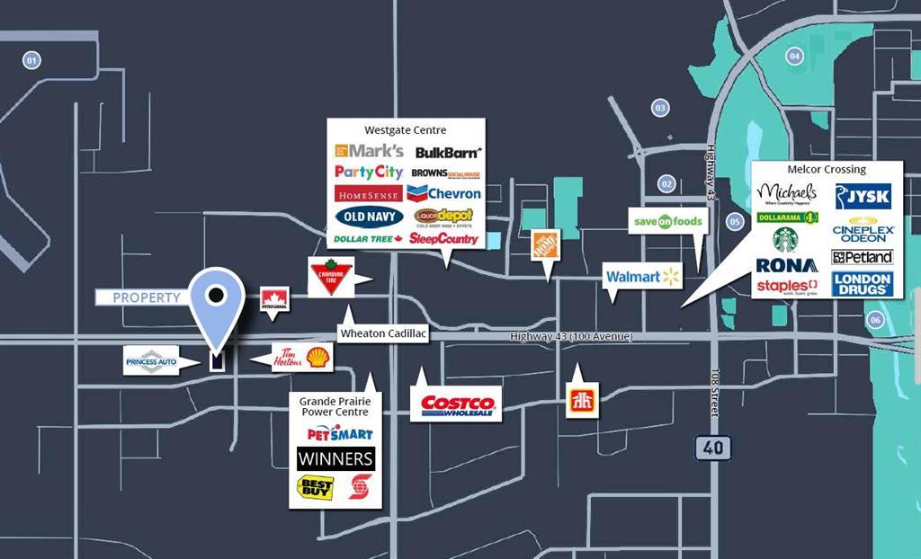 Situated in one of Grande Prairie’s strongest retail areas, this 3.52-acre Arterial Commercial (CA) site offers exceptional visibility along 100 Avenue and features a 31,549 sq. ft. building (28,800 sq. ft. footprint) built in 2012, supported by approximately 88 parking stalls. Surrounded by national and regional tenants along a major east–west commercial corridor, the property benefits from high daily traffic and steady activity from a regional catchment of roughly 300,000 people extending into northern British Columbia. This is a prime opportunity for high-exposure retail or service-commercial use, with the property also available for lease at $20 PSF.