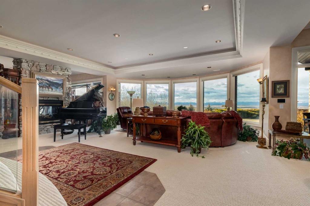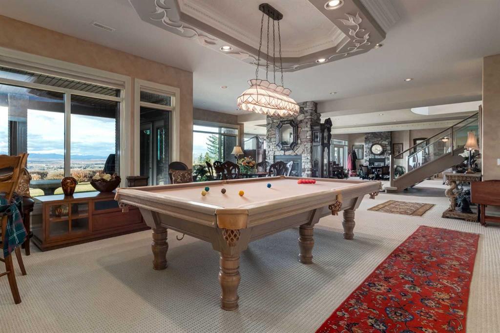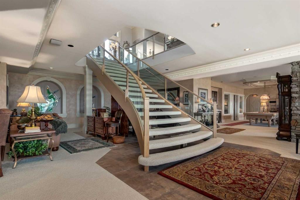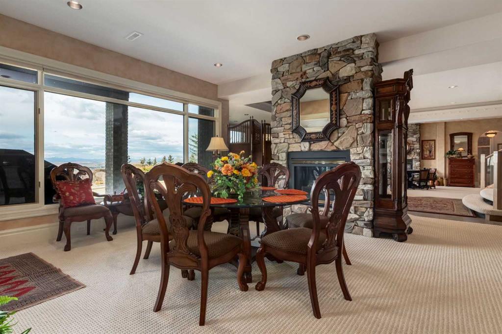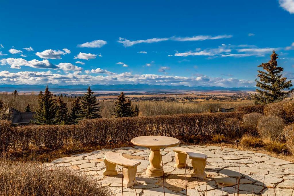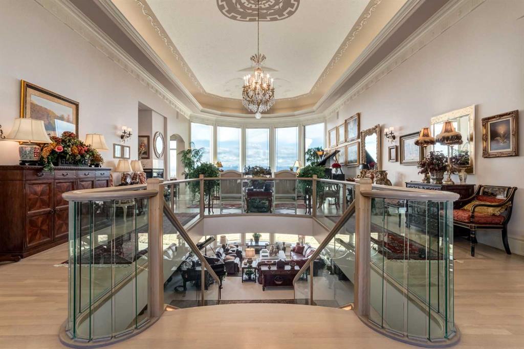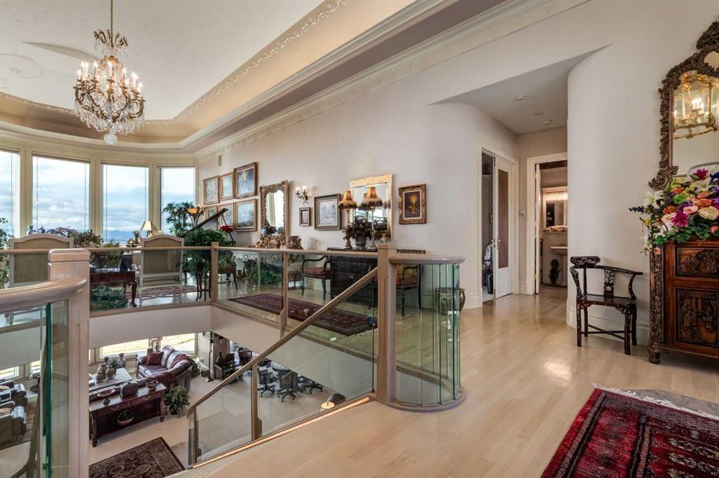 Set within the exclusive enclave of Pinnacle Ridge, this extraordinary estate offers more than 8,400 square feet of refined living space on a 2.32-acre private corner lot, surrounded by immaculate landscaping and breathtaking mountain vistas. Designed with timeless sophistication and modern comfort in mind, this six-bedroom, six-bathroom walkout bungalow captures panoramic views of the Rocky Mountains and the sweeping river valley beyond. Every element of the home reflects meticulous craftsmanship and architectural excellence—creating an inviting retreat only minutes from Stoney Trail, premier schools, fine dining, and every major city convenience. The residence welcomes you with stately curb appeal, intricate stonework, and resort-inspired grounds. At its heart lies a newly constructed pool and cascading waterfall, forming a tranquil centrepiece for outdoor gatherings and relaxation alike. Inside, dramatic vaulted ceilings, custom millwork, ornate columns, and dazzling chandeliers set a tone of elegance throughout. The floor plan offers perfect flow and function, featuring a formal study, elegant dining room, private den with French doors, a wine cellar, and a spacious billiard and entertainment area on the lower level. The chef’s kitchen blends sophistication and practicality with premium appliances, extensive cabinetry, and tile flooring designed for both beauty and ease of care. Multiple fireplaces enhance the home’s warmth and ambiance, creating inviting spaces for family and guests. Each of the bedrooms is generously scaled, with the primary suite offering a private sanctuary complete with a spa-inspired ensuite, an expansive dressing room, and a secluded deck that frames the most spectacular mountain views imaginable. Completing this remarkable estate is a triple attached garage with dedicated motorhome parking, offering abundant space for vehicles and recreational storage. A rare opportunity to own one of Calgary’s signature residences—where privacy, prestige, and proximity come together in perfect harmony.