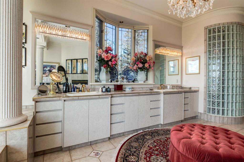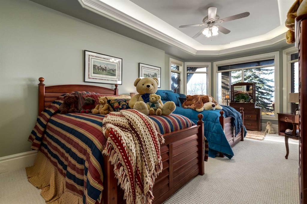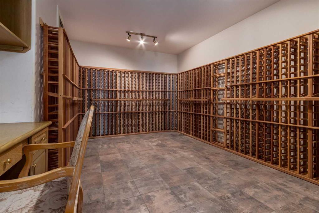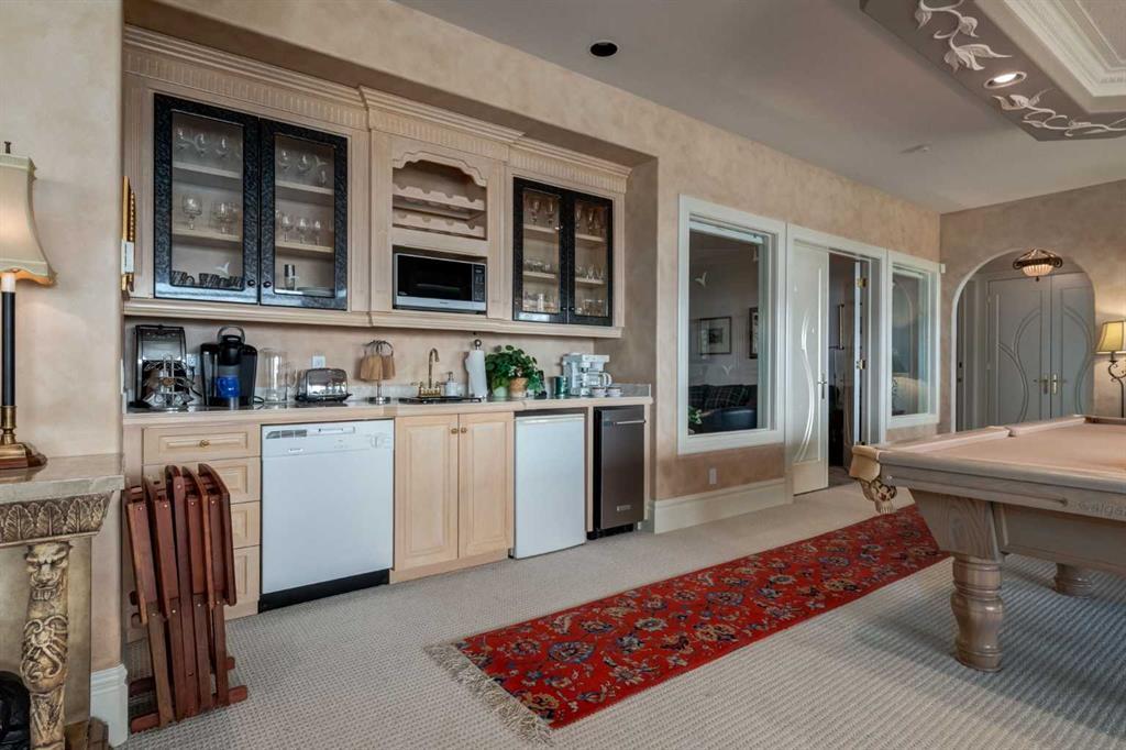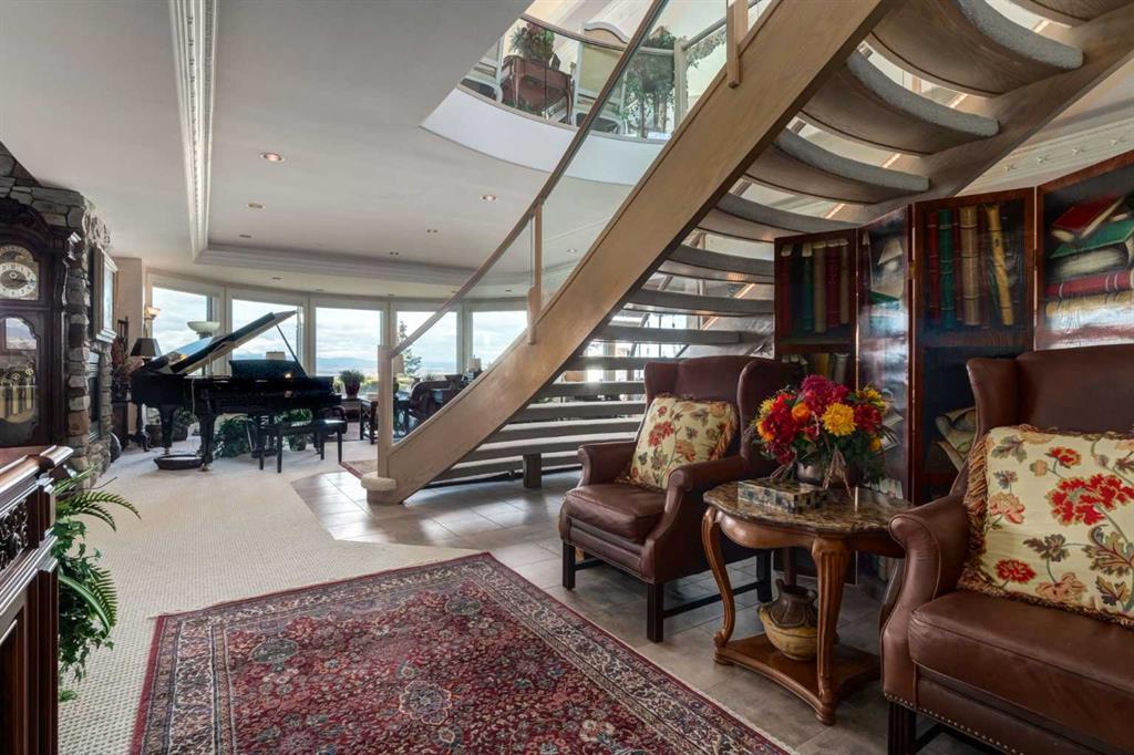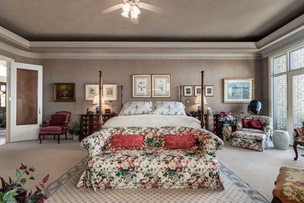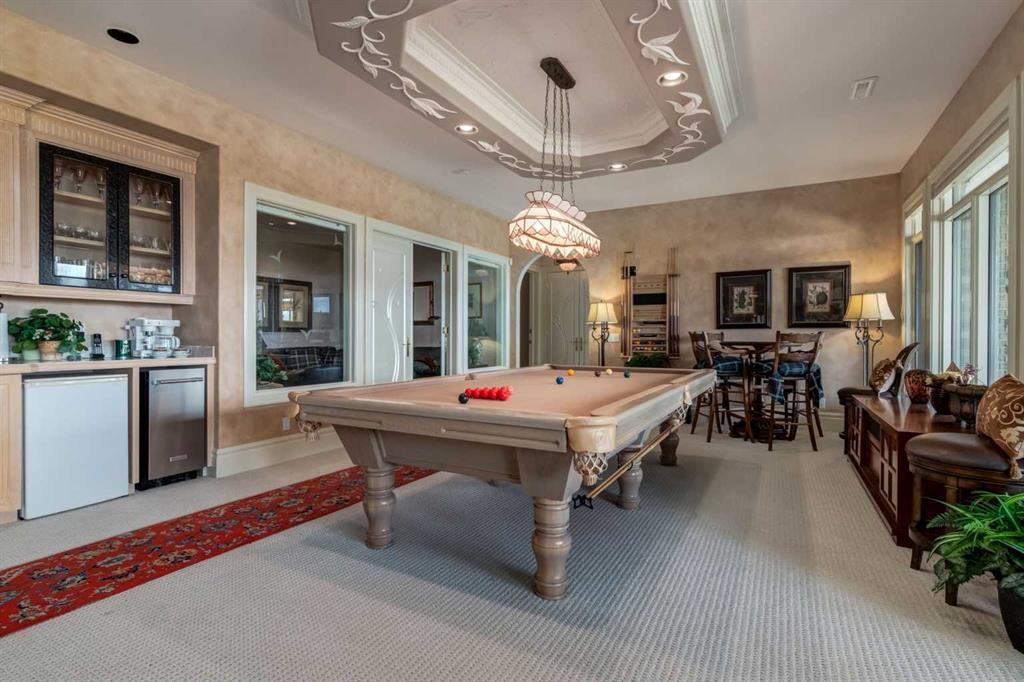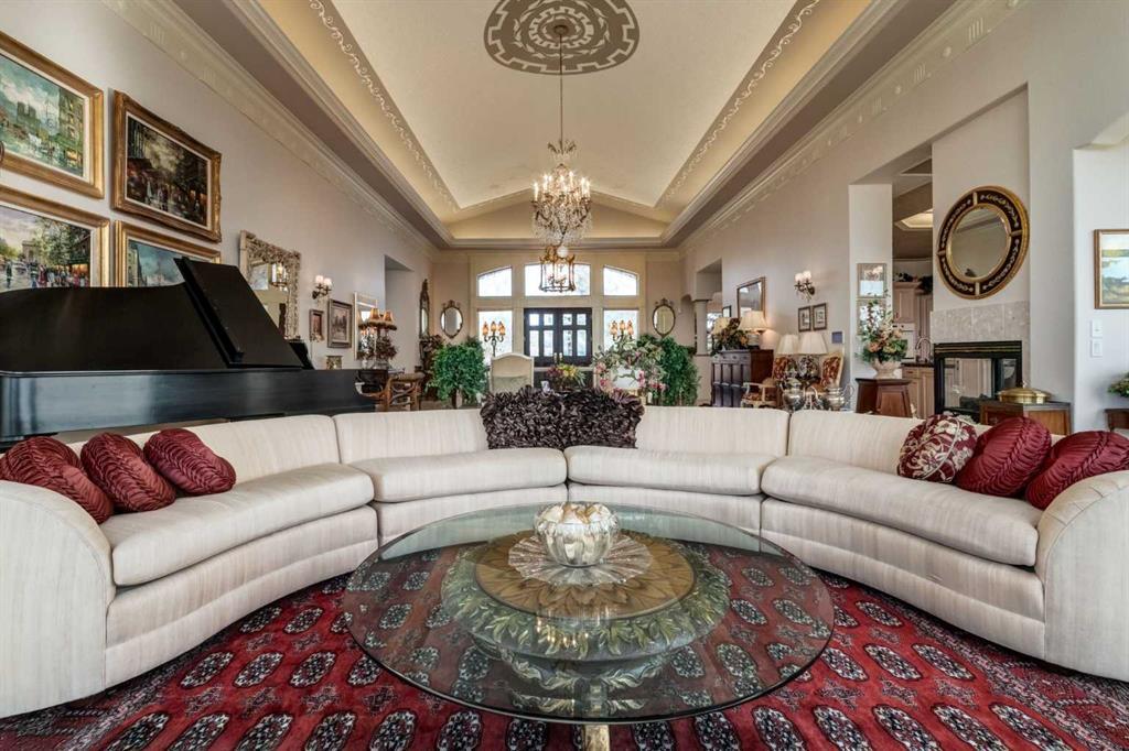 Set within the exclusive enclave of Pinnacle Ridge, this extraordinary estate offers more than 8,400 square feet of refined living space on a 2.32-acre private corner lot, surrounded by immaculate landscaping and breathtaking mountain vistas. Designed with timeless sophistication and modern comfort in mind, this six-bedroom, six-bathroom walkout bungalow captures panoramic views of the Rocky Mountains and the sweeping river valley beyond. Every element of the home reflects meticulous craftsmanship and architectural excellence—creating an inviting retreat only minutes from Stoney Trail, premier schools, fine dining, and every major city convenience. The residence welcomes you with stately curb appeal, intricate stonework, and resort-inspired grounds. At its heart lies a newly constructed pool and cascading waterfall, forming a tranquil centrepiece for outdoor gatherings and relaxation alike. Inside, dramatic vaulted ceilings, custom millwork, ornate columns, and dazzling chandeliers set a tone of elegance throughout. The floor plan offers perfect flow and function, featuring a formal study, elegant dining room, private den with French doors, a wine cellar, and a spacious billiard and entertainment area on the lower level. The chef’s kitchen blends sophistication and practicality with premium appliances, extensive cabinetry, and tile flooring designed for both beauty and ease of care. Multiple fireplaces enhance the home’s warmth and ambiance, creating inviting spaces for family and guests. Each of the bedrooms is generously scaled, with the primary suite offering a private sanctuary complete with a spa-inspired ensuite, an expansive dressing room, and a secluded deck that frames the most spectacular mountain views imaginable. Completing this remarkable estate is a triple attached garage with dedicated motorhome parking, offering abundant space for vehicles and recreational storage. A rare opportunity to own one of Calgary’s signature residences—where privacy, prestige, and proximity come together in perfect harmony.
