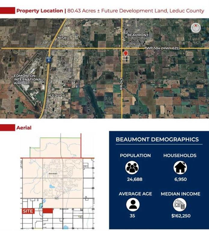 Click brochure link for more details** 80.43 acres ± of future development land. Land neighbours City of Beaumont, located in Leduc County. Ideal for current agricultural use, agri-business ventures, or as a strategic investment for future value growth. Quick access to amenities and major transportation routes from Highway 625 (Township Road 504). Close proximity to Beaumont, Nisku, and the EIA