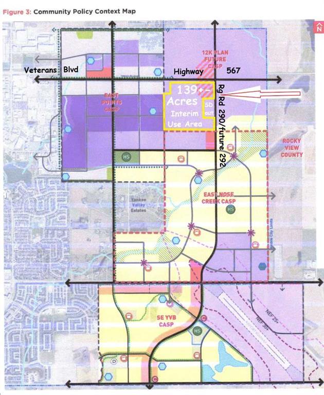 139+- Acres inside AIRDRIE, Alberta fronting on Highway 567 and within City of Airdrie Interim Use Policy Area. Located immediately north of the East Nose Creek Community ASP and immediately east of the East Points Industrial Community ASP. Excellent current opportunity for Interim business uses (by permit) and excellent future development potential. Great high visibility location with 1,900 feet fronting Highway 567 (Veterans Boulevard) and bordered on the east by Range Road 290 (future Rg Rd 292 alignment). Sale is SUBJECT TO City approval of the Landowner completing subdivision of a 10+- acre homesite and issuance and registration of new titles for the properties. GST may apply.