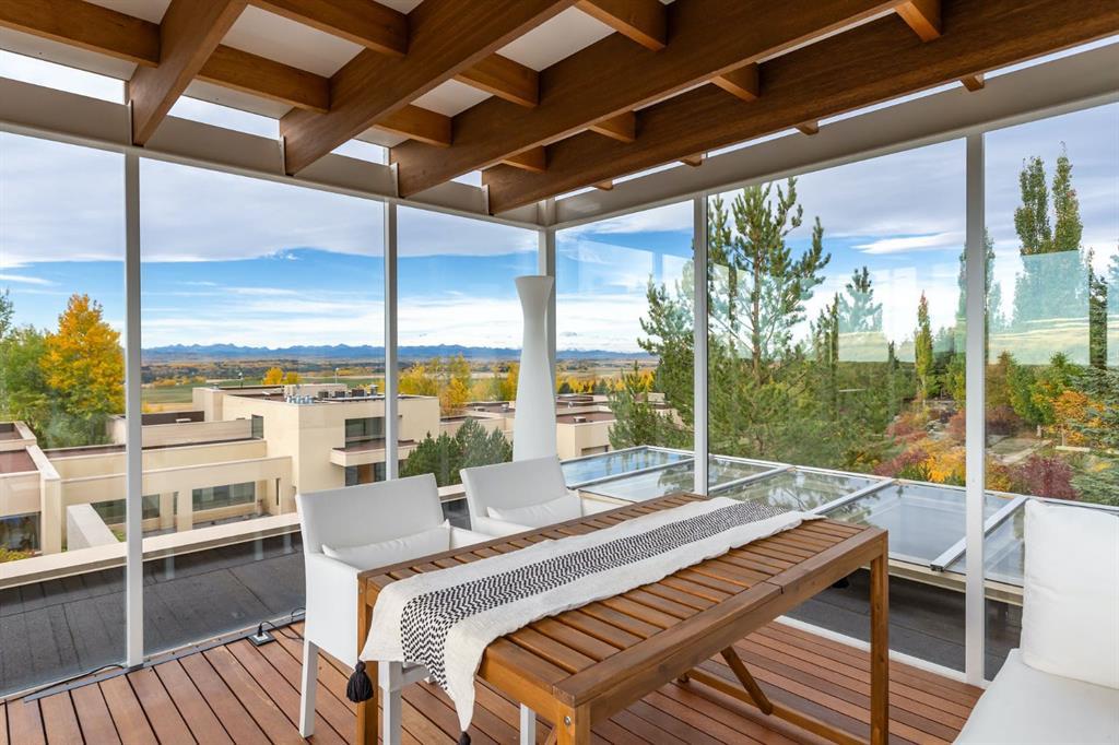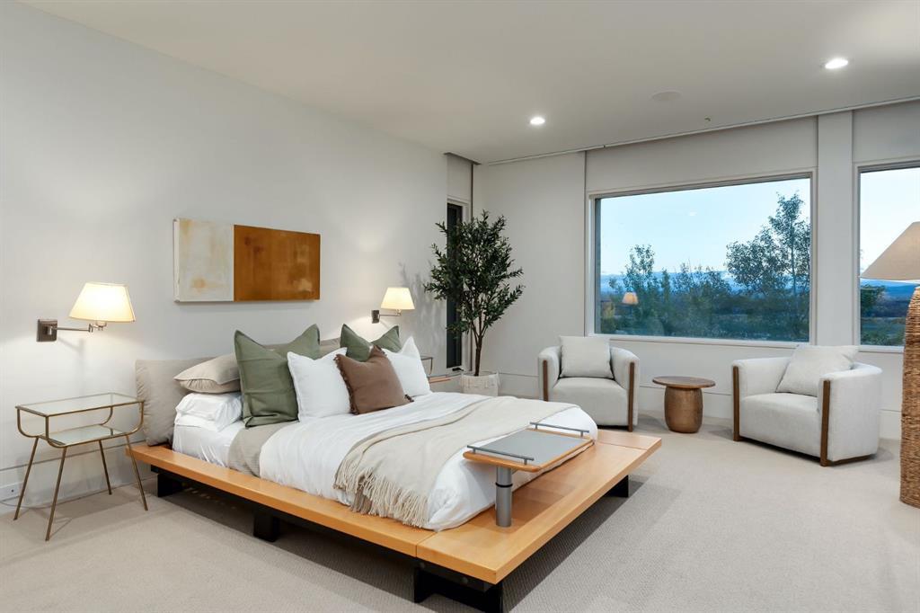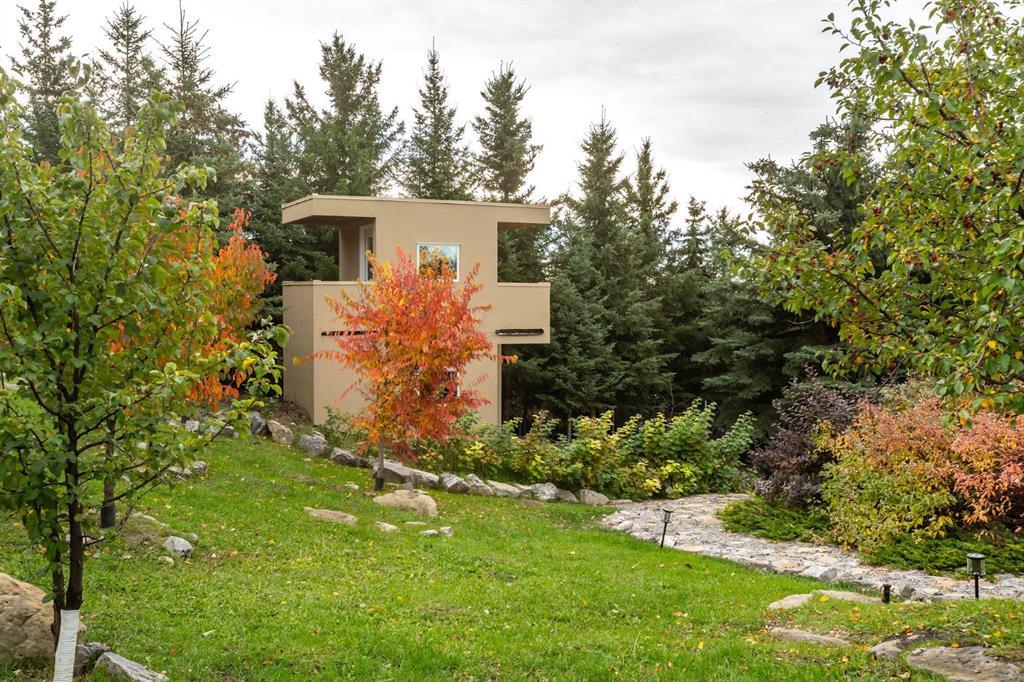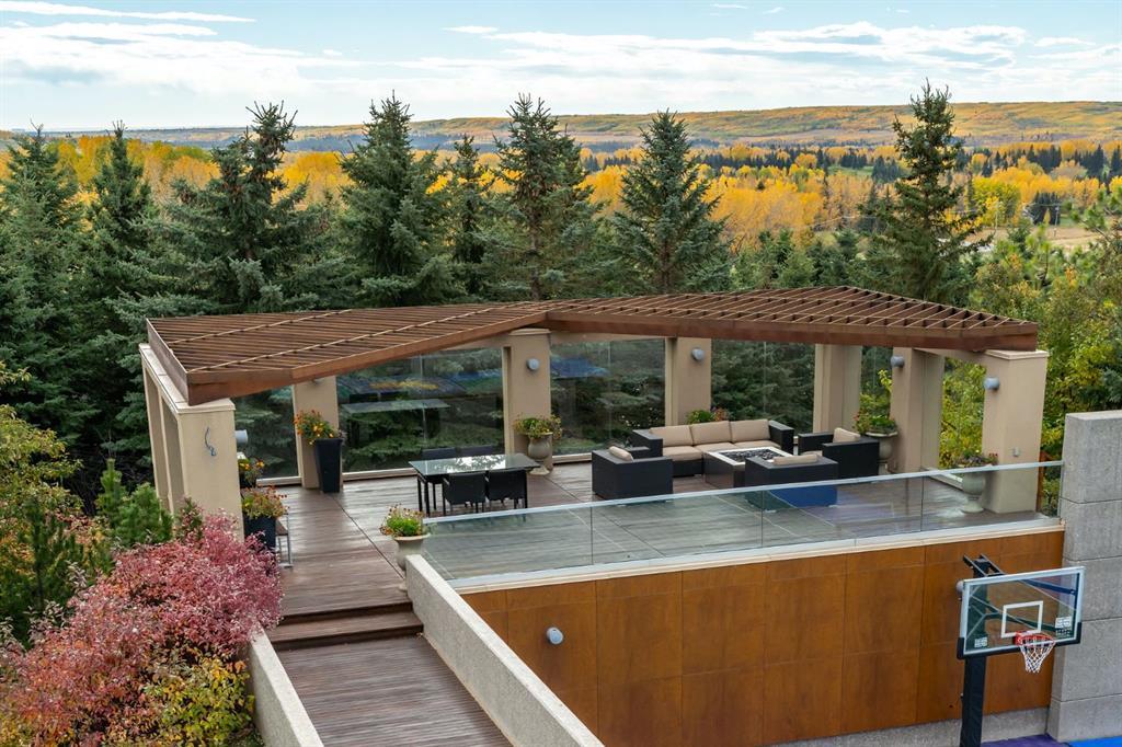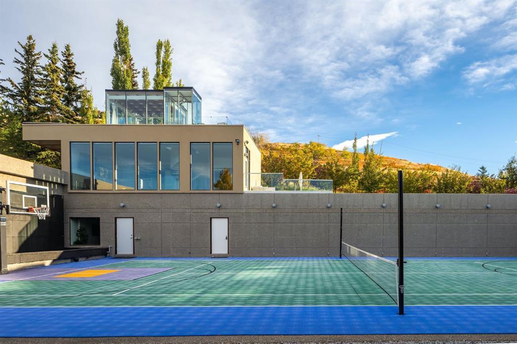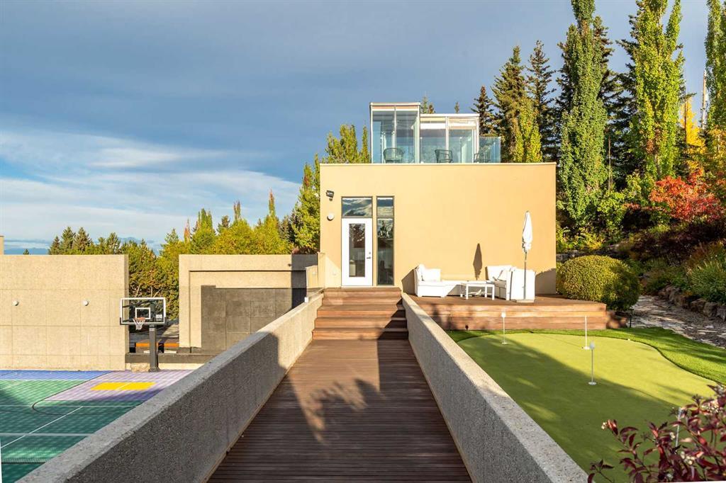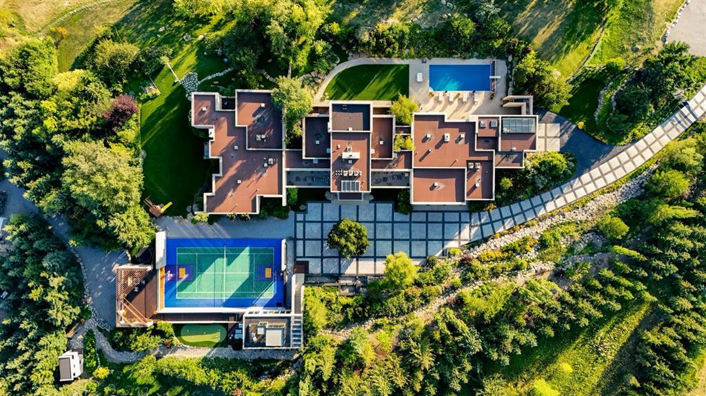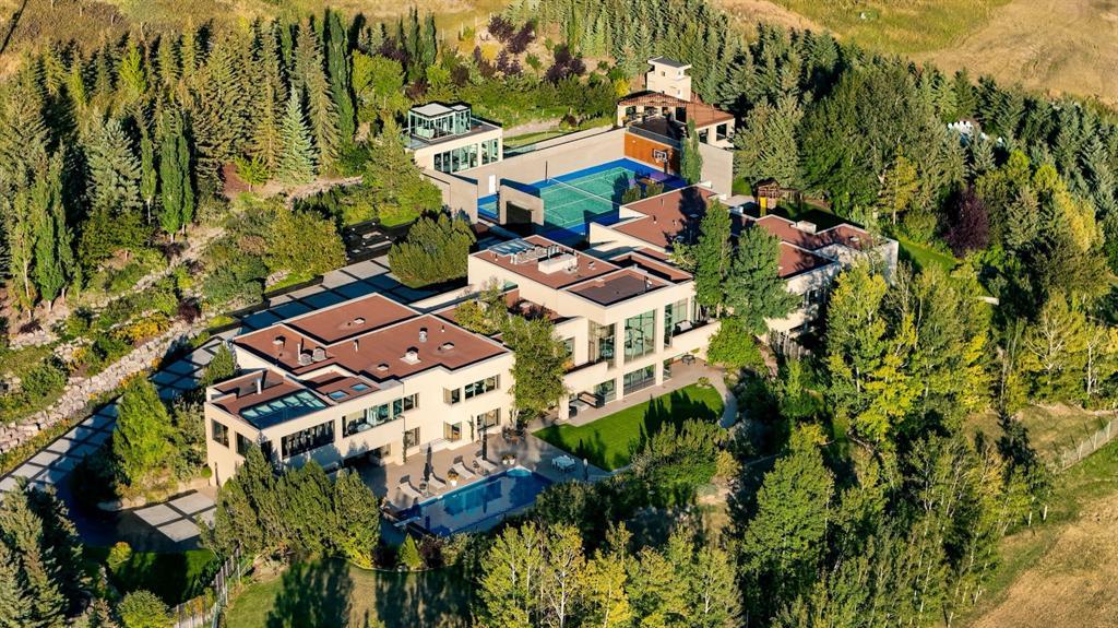 Seize a rare opportunity to own an iconic landmark in the prestigious southwest Springbank area, one of Calgary’s most coveted locations. Set on an expansive 18.62-acre escarpment, this exceptional property offers stunning mountain views and unparalleled privacy. Designed with new-age minimalism, this 20,000+ sq ft estate is a serene retreat for the discerning buyer. Located just minutes from Stoney Trail West, on the edge of Calgary, this secluded paradise offers the ultimate in luxury living. With 6 bedrooms + 10 bathrooms + 2 large offices, the home features stunning architectural design, including soaring flat & vaulted ceilings, a grand two-story great room illuminated by expansive windows. The contemporary living spaces are complemented by a soothing wood fireplace & ZEN garden inspired hallway views. The spacious dining room, perfect for memorable gatherings, overlooks beautifully landscaped grounds and majestic mountain vistas. Ample vehicle storage includes an oversized 3 car garage, a 2 car garage, and an additional oversized auxiliary 3 car garage (all heated). The gourmet kitchen is a chef’s dream, featuring a Wolf gas range with dual ovens, a built-in refrigerator, a walk-in pantry, an oversized granite island and custom white oak cabinetry. The adjacent family room includes a cozy fireplace, while the sunroom with another fireplace is perfect for family game or movie nights. The bedroom wing, secured by fire doors, houses the luxurious primary suite, a tranquil haven with views of mature trees and a lounge area with a fireplace. The ensuite boasts a deep soaker tub, granite dual-sink vanity, dual toilets, a bidet, and 2 oversized showers, along with a spacious walk-in closet. Four additional bedrooms, each with its own ensuite, are located in the bedroom wing, along with a laundry room and extra storage. Heated floors throughout both the main and lower levels provide year-round comfort. The lower level offers an additional bedroom with a full bathroom, a dedicated hot tub room, a spacious exercise room, an office and a large recreation room. A nearby bar and media room add to the entertainment space, while a walk-up entrance leads to the beautifully landscaped backyard, where a large in-ground pool awaits. Outdoor spaces include southwest-facing decks and a patio, a vast yard, and a middle courtyard with a sports court. An auxiliary building offers potential as a future guest house. The property has undergone millions of dollars in recent landscaping, with paved and natural pathways, waterfall features, and hidden sitting areas. Two security gates, fencing, and surveillance cameras ensure your privacy and security. This magnificent estate offers a private oasis with rolling hills, lush gardens, and elaborate landscaping that rivals anything in Aspen Hills—yet is only five minutes away from top-tier private schools. Experience the pinnacle of luxury living in Canada. Schedule your private tour today and discover all that your next home has to offer.