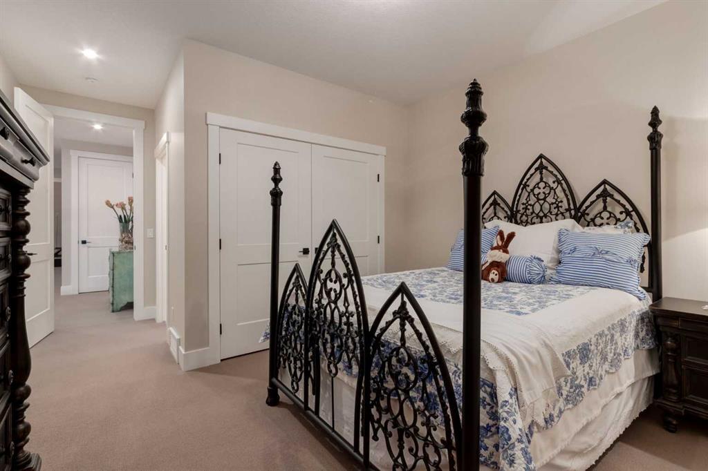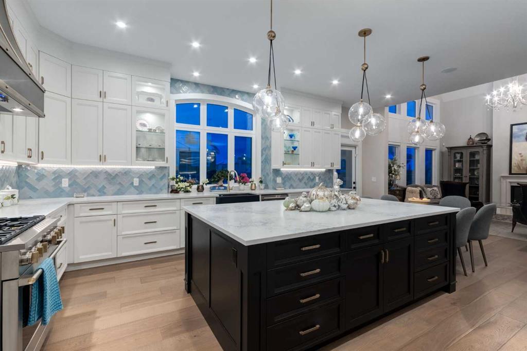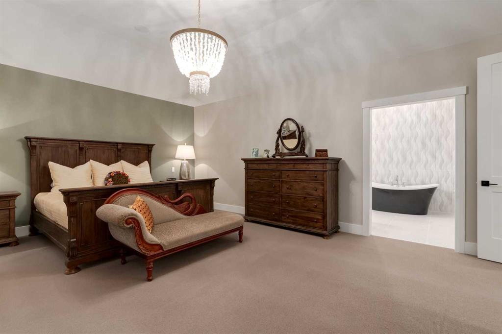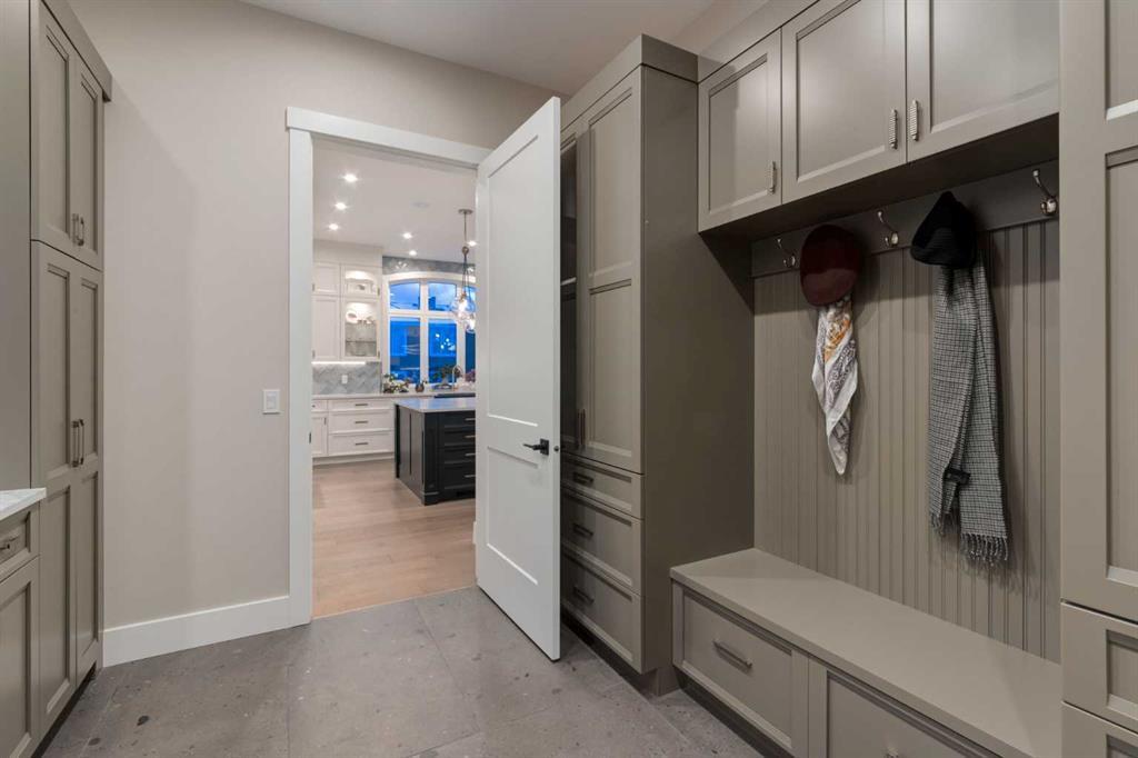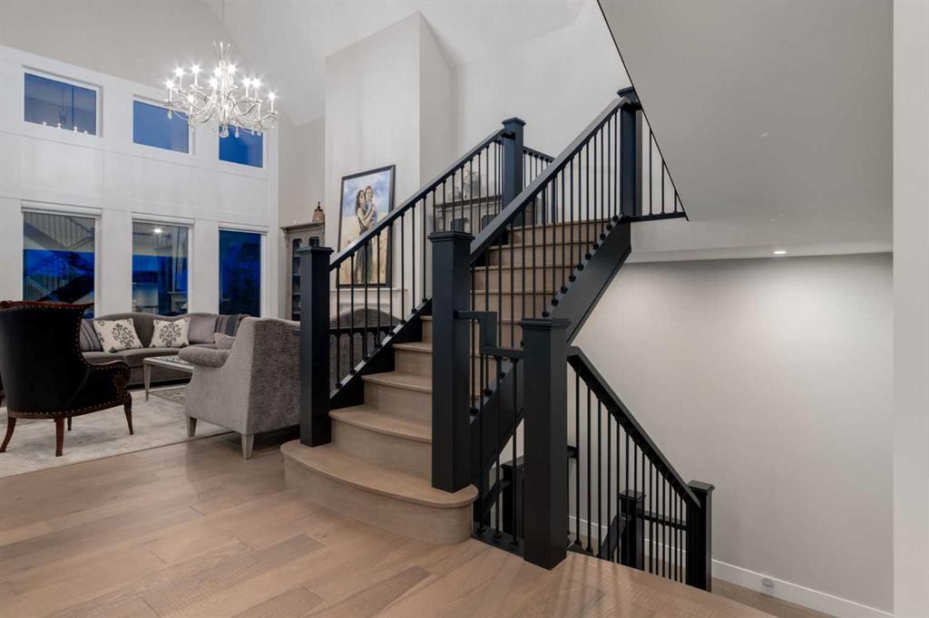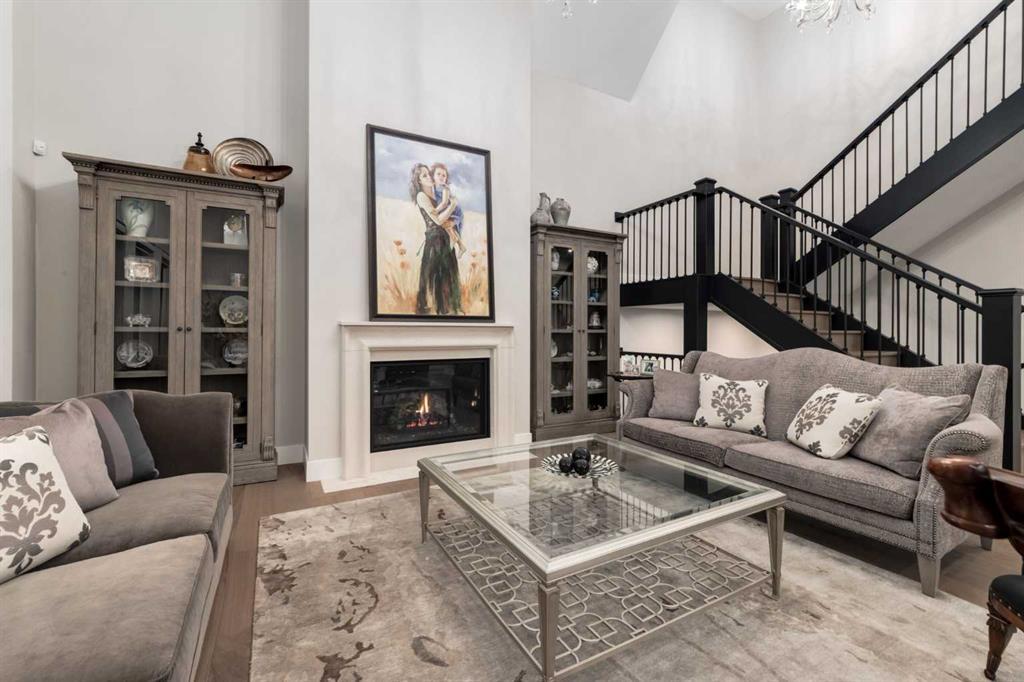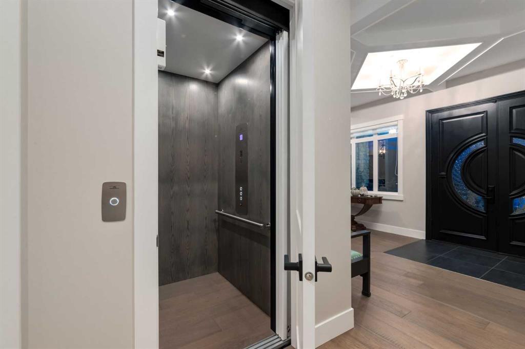 Masterfully executed in a transitional design style, this exquisite Family Home showcases nearly 5,500 sf of impeccable luxury defined by unparalleled craftsmanship and the highest quality of finishes throughout, including an ELEVATOR for easy accessibility to all three floors. The exterior architecture exudes a timeless appeal from the peaked rooflines to the "eyebrow" detailing to the rich stone accents, incredible window designs, a front veranda & upper balcony, and a striking "piece de resistance" front door. The beautifully landscaped front and back gardens impress with perfectly manicured flower beds, and a textural mélange of shrubs and trees. The home's layout is outstanding, while the interior design elements leave a lasting impression on the most discerning "eye for design". The main floor boasts soaring ceiling heights with coffered detailing, impressive, large windows flooding the interior with streams of natural light, custom millwork designs, beautiful, wide-plank hardwood floors, timeless floor and backsplash tile designs, and last but not least, exquisite "Schonbek" chandeliers. The grand, light-filled great room features a magnificent fireplace. It is open to the decadent kitchen and an elegant dining room perfectly suited to hosting dinner parties for family and friends. The front study offers complete privacy and leads to a unique "plant sunroom". The custom-designed kitchen is a chef's dream featuring high-end appliances, ample storage with pullout units, a gigantic center island, timeless quartz countertops, a coveted "Hammersmith" range hood, and last but not least, an impressive chevron pattern backsplash design executed with the utmost precision. Beautifully custom-designed stairs ascend to the upper level complete with three bedrooms and a bonus room, perfectly suited for the children's play area, a TV/games room, or a study room. The master suite is a luxurious retreat complete with wool carpeting, a showpiece chandelier, its own West-facing balcony and a lavish spa-like ensuite and "dressing room" - a fashionista's dream. Each of the children's bedrooms offers its own chic ensuite bath. The lower level is a true "entertaining haven" featuring a family/TV room that opens onto a private patio area, a wet bar complete with custom furniture-piece units, a wine room, three additional bedrooms, one of which being designated as an exercise room, a full bathroom and a large storage/cold room area. The double and single garage spaces are heated. The single garage is complete with 220 V wiring to allow for an EV charging station. The monthly HOA fees include front yard maintenance, including weekly mowing/trimming; weekly curbside garbage/recycling pickup; snow removal on the streets, sidewalks, pathways & the central plaza; maintenance of the central plaza, cascading ponds, outdoor kitchen, and playgrounds. Please refer to the community website for a wealth of information. MUST BE SEEN!