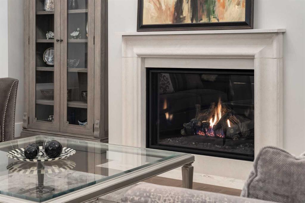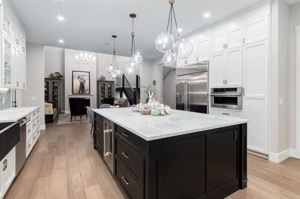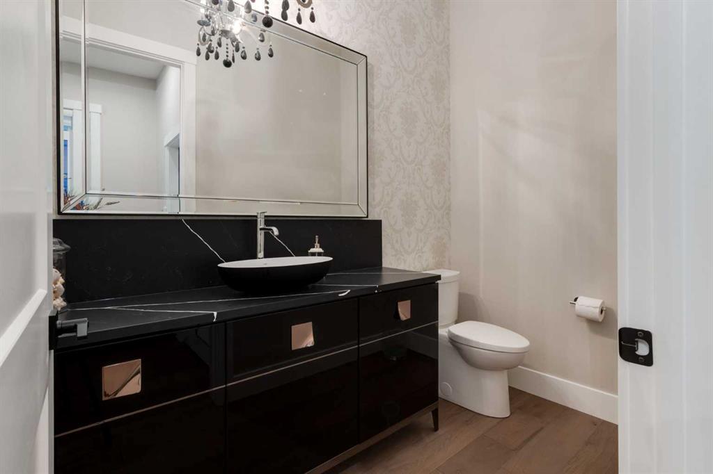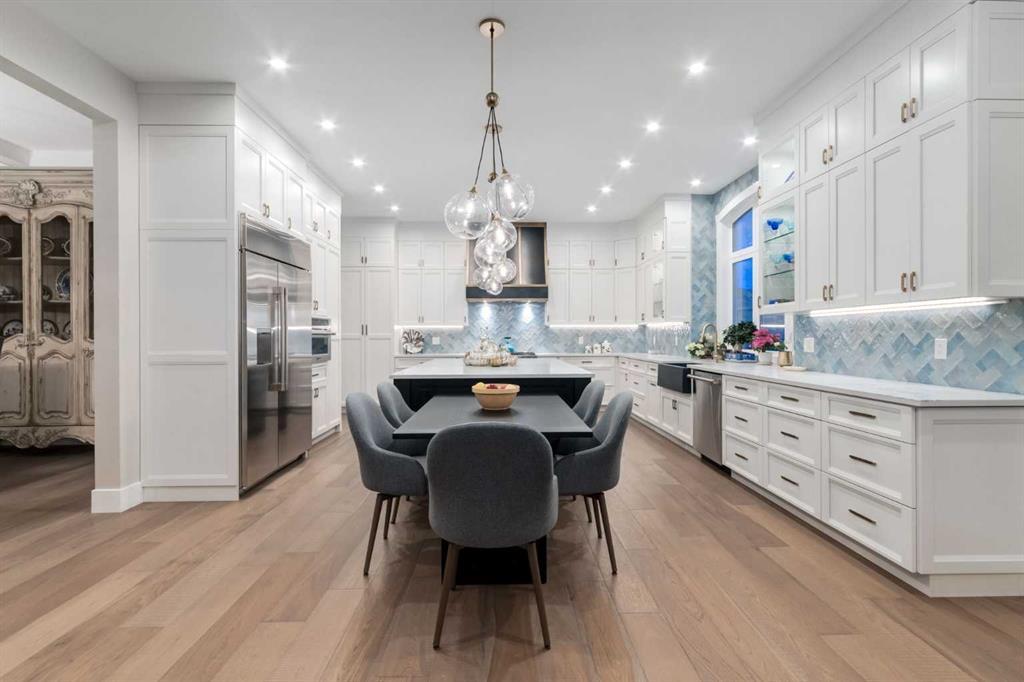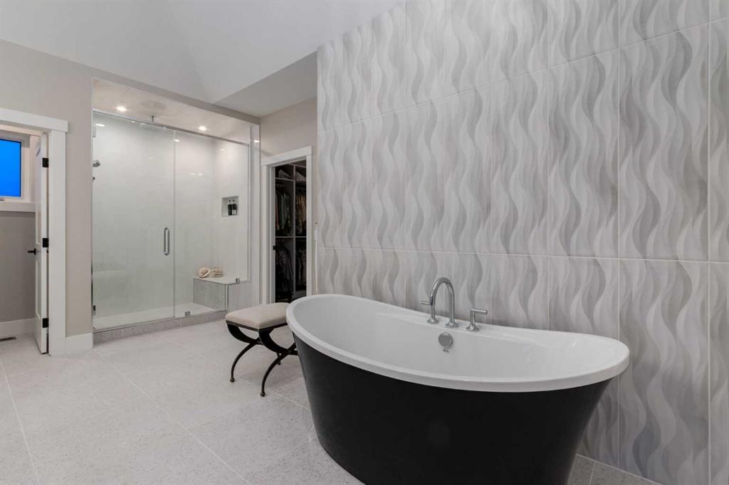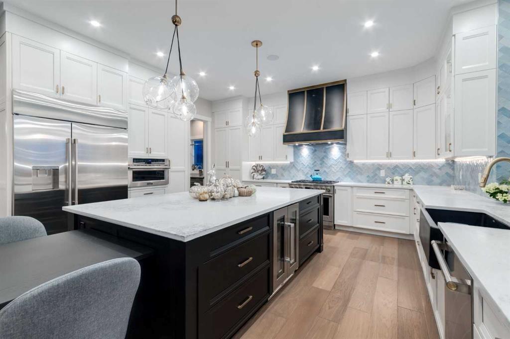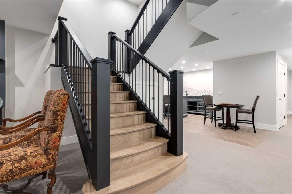 Masterfully executed in a transitional design style, this exquisite Family Home showcases nearly 5,500 sf of impeccable luxury defined by unparalleled craftsmanship and the highest quality of finishes throughout, including an ELEVATOR for easy accessibility to all three floors. The exterior architecture exudes a timeless appeal from the peaked rooflines to the "eyebrow" detailing to the rich stone accents, incredible window designs, a front veranda & upper balcony, and a striking "piece de resistance" front door. The beautifully landscaped front and back gardens impress with perfectly manicured flower beds, and a textural mélange of shrubs and trees. The home's layout is outstanding, while the interior design elements leave a lasting impression on the most discerning "eye for design". The main floor boasts soaring ceiling heights with coffered detailing, impressive, large windows flooding the interior with streams of natural light, custom millwork designs, beautiful, wide-plank hardwood floors, timeless floor and backsplash tile designs, and last but not least, exquisite "Schonbek" chandeliers. The grand, light-filled great room features a magnificent fireplace. It is open to the decadent kitchen and an elegant dining room perfectly suited to hosting dinner parties for family and friends. The front study offers complete privacy and leads to a unique "plant sunroom". The custom-designed kitchen is a chef's dream featuring high-end appliances, ample storage with pullout units, a gigantic center island, timeless quartz countertops, a coveted "Hammersmith" range hood, and last but not least, an impressive chevron pattern backsplash design executed with the utmost precision. Beautifully custom-designed stairs ascend to the upper level complete with three bedrooms and a bonus room, perfectly suited for the children's play area, a TV/games room, or a study room. The master suite is a luxurious retreat complete with wool carpeting, a showpiece chandelier, its own West-facing balcony and a lavish spa-like ensuite and "dressing room" - a fashionista's dream. Each of the children's bedrooms offers its own chic ensuite bath. The lower level is a true "entertaining haven" featuring a family/TV room that opens onto a private patio area, a wet bar complete with custom furniture-piece units, a wine room, three additional bedrooms, one of which being designated as an exercise room, a full bathroom and a large storage/cold room area. The double and single garage spaces are heated. The single garage is complete with 220 V wiring to allow for an EV charging station. The monthly HOA fees include front yard maintenance, including weekly mowing/trimming; weekly curbside garbage/recycling pickup; snow removal on the streets, sidewalks, pathways & the central plaza; maintenance of the central plaza, cascading ponds, outdoor kitchen, and playgrounds. Please refer to the community website for a wealth of information. MUST BE SEEN!