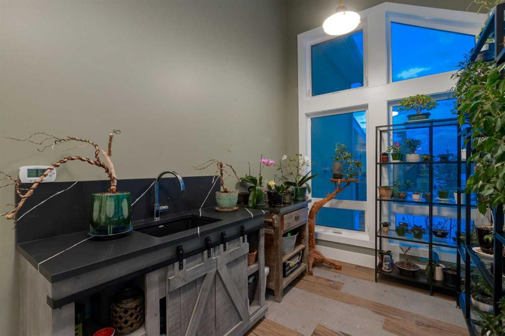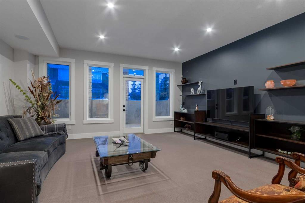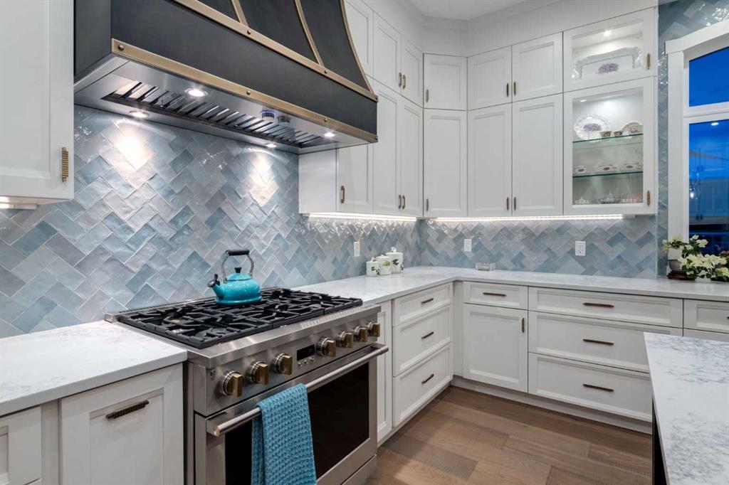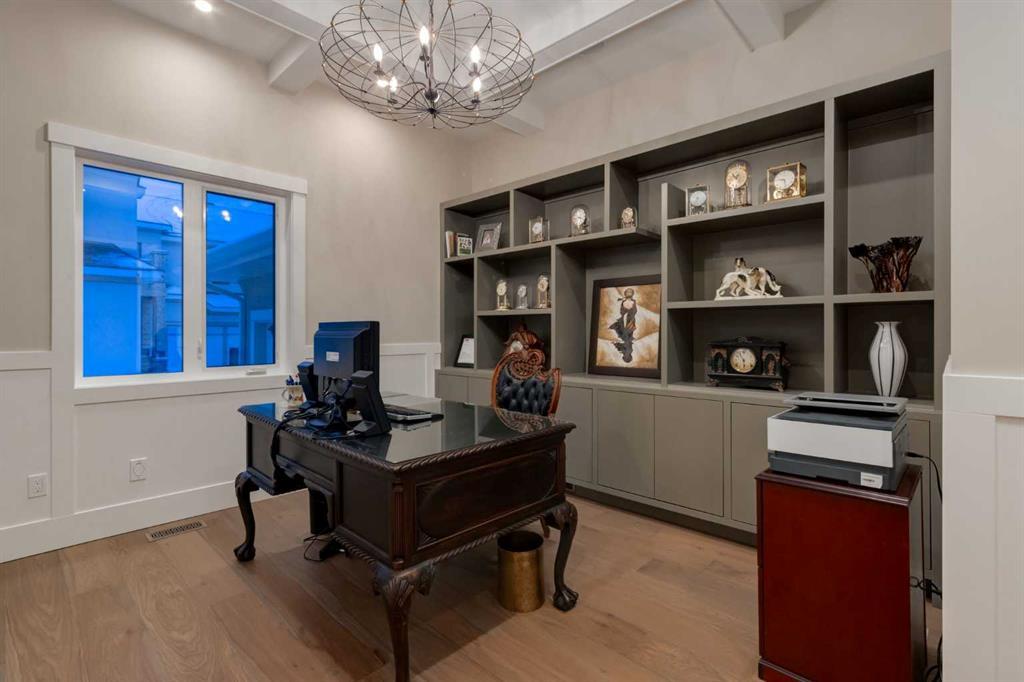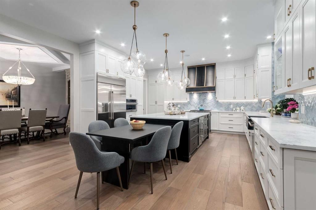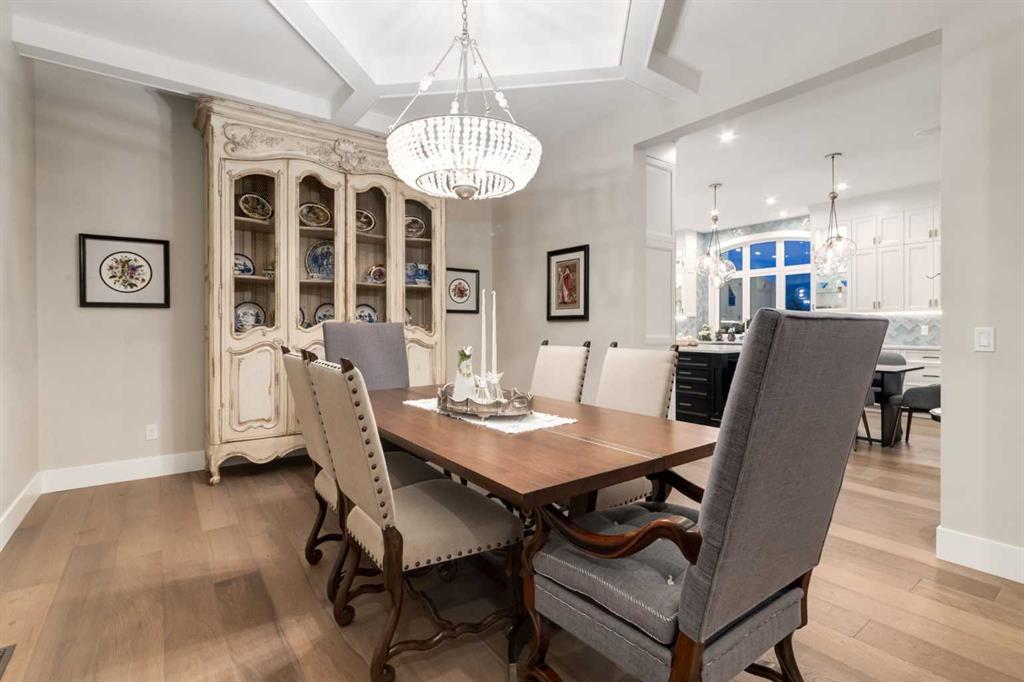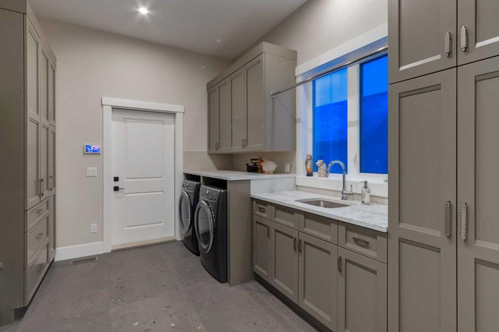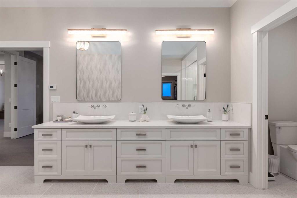 Masterfully executed in a transitional design style, this exquisite Family Home showcases nearly 5,500 sf of impeccable luxury defined by unparalleled craftsmanship and the highest quality of finishes throughout, including an ELEVATOR for easy accessibility to all three floors. The exterior architecture exudes a timeless appeal from the peaked rooflines to the "eyebrow" detailing to the rich stone accents, incredible window designs, a front veranda & upper balcony, and a striking "piece de resistance" front door. The beautifully landscaped front and back gardens impress with perfectly manicured flower beds, and a textural mélange of shrubs and trees. The home's layout is outstanding, while the interior design elements leave a lasting impression on the most discerning "eye for design". The main floor boasts soaring ceiling heights with coffered detailing, impressive, large windows flooding the interior with streams of natural light, custom millwork designs, beautiful, wide-plank hardwood floors, timeless floor and backsplash tile designs, and last but not least, exquisite "Schonbek" chandeliers. The grand, light-filled great room features a magnificent fireplace. It is open to the decadent kitchen and an elegant dining room perfectly suited to hosting dinner parties for family and friends. The front study offers complete privacy and leads to a unique "plant sunroom". The custom-designed kitchen is a chef's dream featuring high-end appliances, ample storage with pullout units, a gigantic center island, timeless quartz countertops, a coveted "Hammersmith" range hood, and last but not least, an impressive chevron pattern backsplash design executed with the utmost precision. Beautifully custom-designed stairs ascend to the upper level complete with three bedrooms and a bonus room, perfectly suited for the children's play area, a TV/games room, or a study room. The master suite is a luxurious retreat complete with wool carpeting, a showpiece chandelier, its own West-facing balcony and a lavish spa-like ensuite and "dressing room" - a fashionista's dream. Each of the children's bedrooms offers its own chic ensuite bath. The lower level is a true "entertaining haven" featuring a family/TV room that opens onto a private patio area, a wet bar complete with custom furniture-piece units, a wine room, three additional bedrooms, one of which being designated as an exercise room, a full bathroom and a large storage/cold room area. The double and single garage spaces are heated. The single garage is complete with 220 V wiring to allow for an EV charging station. The monthly HOA fees include front yard maintenance, including weekly mowing/trimming; weekly curbside garbage/recycling pickup; snow removal on the streets, sidewalks, pathways & the central plaza; maintenance of the central plaza, cascading ponds, outdoor kitchen, and playgrounds. Please refer to the community website for a wealth of information. MUST BE SEEN!