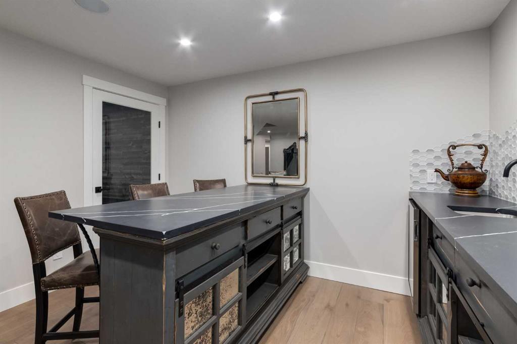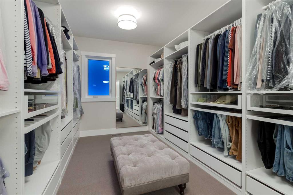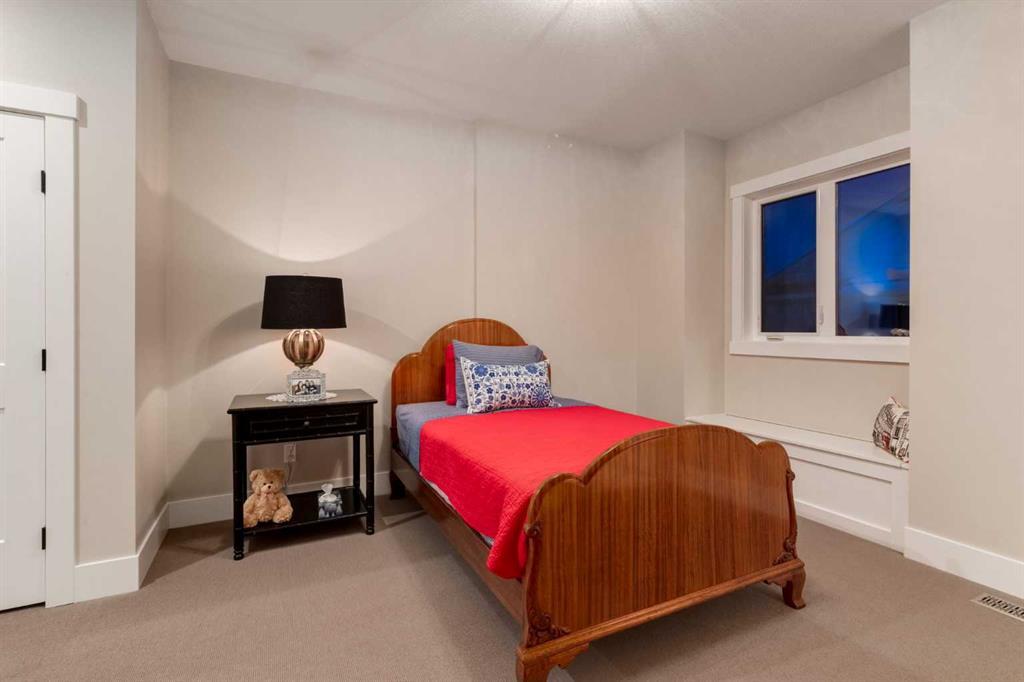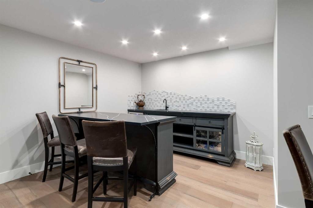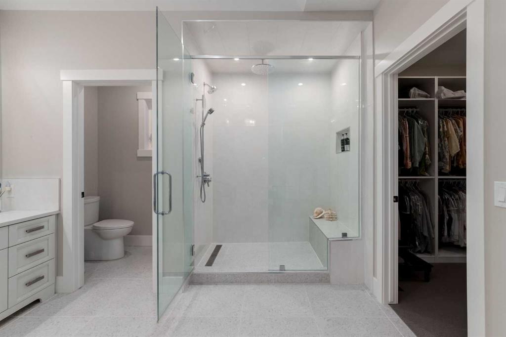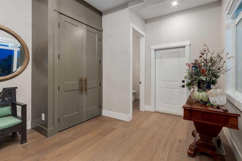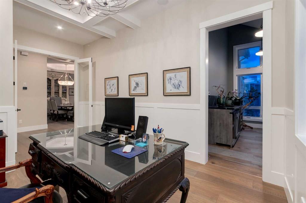 Masterfully executed in a transitional design style, this exquisite Family Home showcases nearly 5,500 sf of impeccable luxury defined by unparalleled craftsmanship and the highest quality of finishes throughout, including an ELEVATOR for easy accessibility to all three floors. The exterior architecture exudes a timeless appeal from the peaked rooflines to the "eyebrow" detailing to the rich stone accents, incredible window designs, a front veranda & upper balcony, and a striking "piece de resistance" front door. The beautifully landscaped front and back gardens impress with perfectly manicured flower beds, and a textural mélange of shrubs and trees. The home's layout is outstanding, while the interior design elements leave a lasting impression on the most discerning "eye for design". The main floor boasts soaring ceiling heights with coffered detailing, impressive, large windows flooding the interior with streams of natural light, custom millwork designs, beautiful, wide-plank hardwood floors, timeless floor and backsplash tile designs, and last but not least, exquisite "Schonbek" chandeliers. The grand, light-filled great room features a magnificent fireplace. It is open to the decadent kitchen and an elegant dining room perfectly suited to hosting dinner parties for family and friends. The front study offers complete privacy and leads to a unique "plant sunroom". The custom-designed kitchen is a chef's dream featuring high-end appliances, ample storage with pullout units, a gigantic center island, timeless quartz countertops, a coveted "Hammersmith" range hood, and last but not least, an impressive chevron pattern backsplash design executed with the utmost precision. Beautifully custom-designed stairs ascend to the upper level complete with three bedrooms and a bonus room, perfectly suited for the children's play area, a TV/games room, or a study room. The master suite is a luxurious retreat complete with wool carpeting, a showpiece chandelier, its own West-facing balcony and a lavish spa-like ensuite and "dressing room" - a fashionista's dream. Each of the children's bedrooms offers its own chic ensuite bath. The lower level is a true "entertaining haven" featuring a family/TV room that opens onto a private patio area, a wet bar complete with custom furniture-piece units, a wine room, three additional bedrooms, one of which being designated as an exercise room, a full bathroom and a large storage/cold room area. The double and single garage spaces are heated. The single garage is complete with 220 V wiring to allow for an EV charging station. The monthly HOA fees include front yard maintenance, including weekly mowing/trimming; weekly curbside garbage/recycling pickup; snow removal on the streets, sidewalks, pathways & the central plaza; maintenance of the central plaza, cascading ponds, outdoor kitchen, and playgrounds. Please refer to the community website for a wealth of information. MUST BE SEEN!