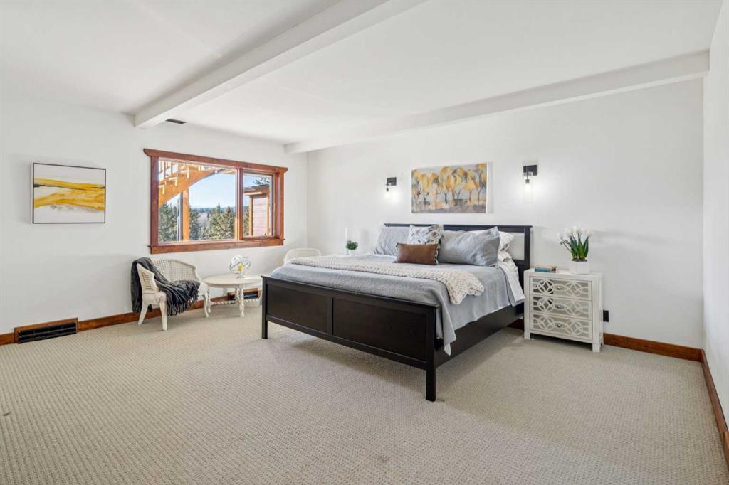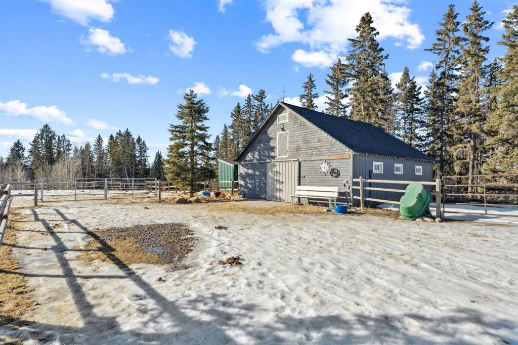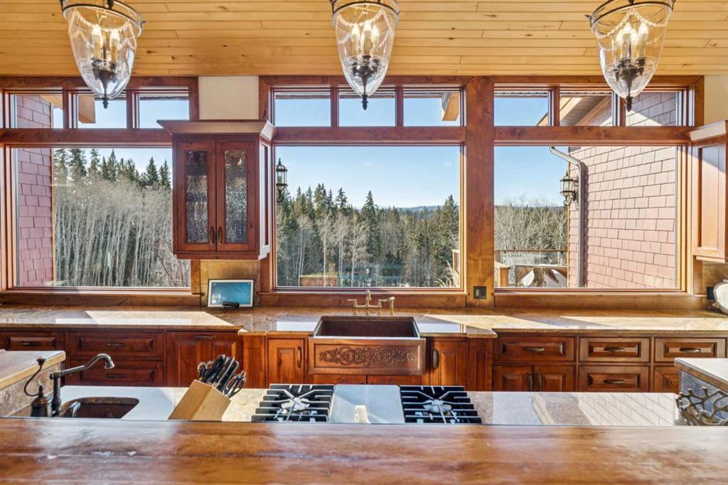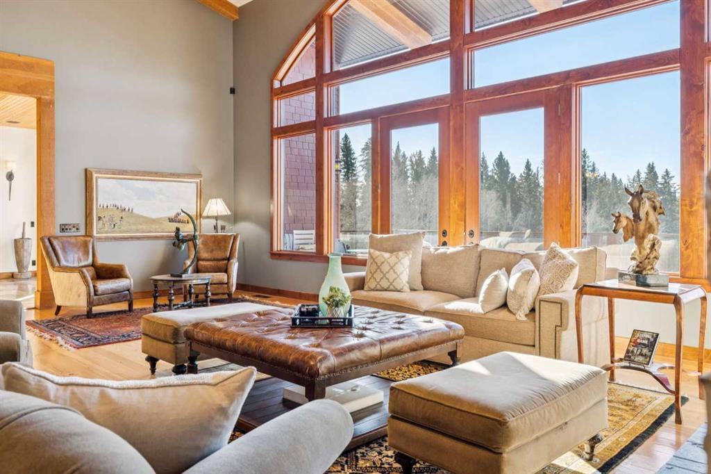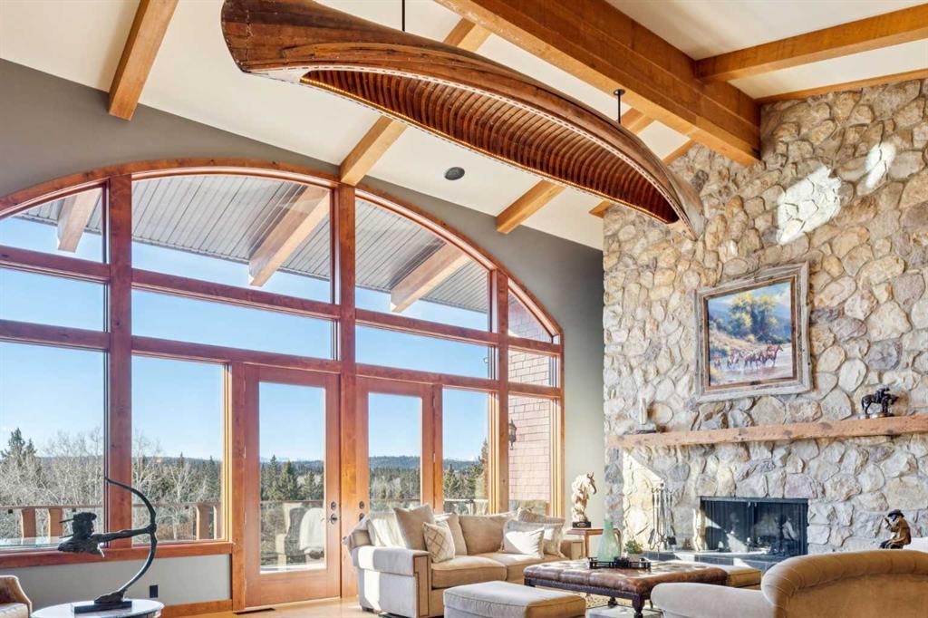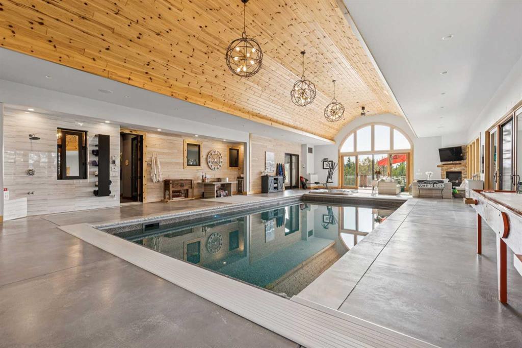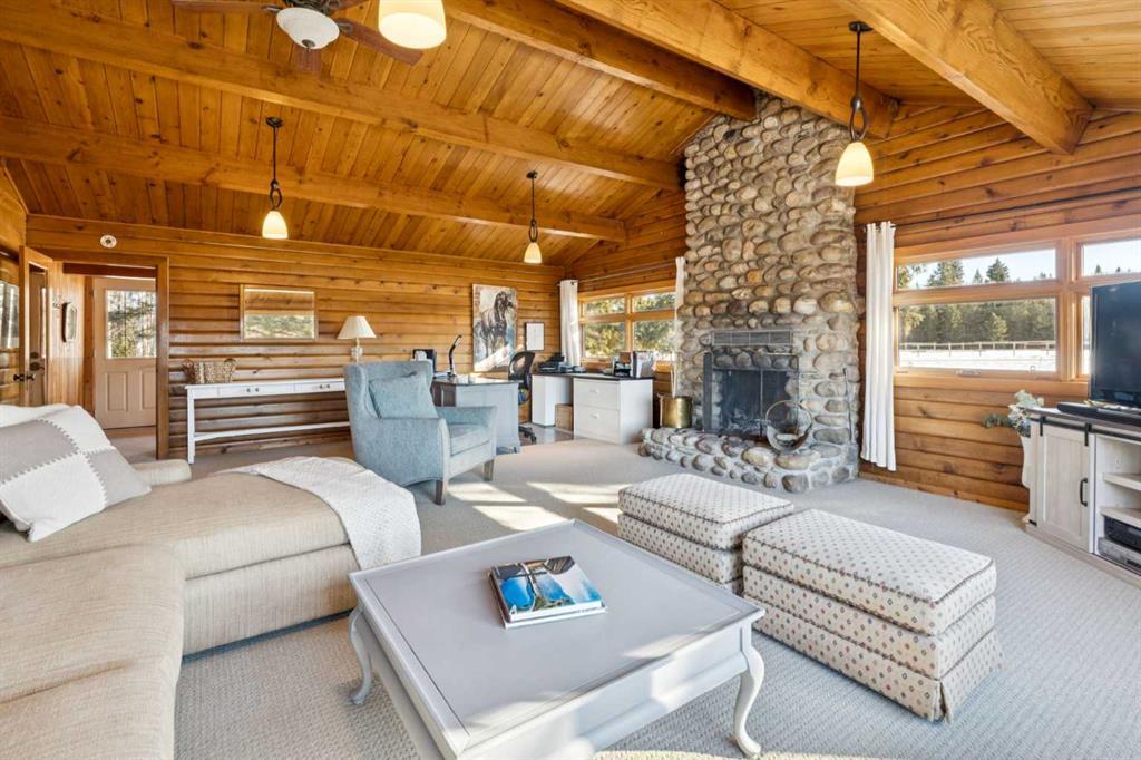 This is a property defined by lifestyle. From the moment you arrive at the secure electric gate and begin the gentle journey down the winding, tree-lined driveway, the outside world quietly fades away. Take a deep breath—what awaits is a rare sense of calm, privacy, and connection to nature. Perched above Fish Creek, this remarkable 7,222 sq. ft. bungalow commands breathtaking views of the creek below, open fields, rolling foothills, and distant mountain vistas. A wraparound deck spanning the south and west sides of the home invites you to fully embrace the outdoors—whether watching wildlife pass by, listening to the soft sounds of the creek, or enjoying sunsets that never disappoint. Step through the dramatic front entrance and you are immediately greeted by soaring vaulted ceilings, a stunning wall of windows, and uninterrupted views beyond. Custom stonework and timeless timber-frame construction define the home’s architectural character, creating a seamless blend of natural materials and refined craftsmanship. The expansive living spaces are perfectly designed for entertaining—whether hosting intimate gatherings or larger celebrations, indoors or out. This is a residence where the outdoors is intentionally brought in, offering warmth, scale, and a true sense of place. The gourmet kitchen features a generous dining area, an abundance of cabinetry and counter space, and a beautiful screened summer dining room—ideal for seasonal entertaining. Enhancing the lifestyle experience is an attached pool house complete with a 16' x 30' indoor heated pool, hot tub, games area, and a cozy sitting space with fireplace for year-round enjoyment. The primary retreat features soaring vaulted ceilings, a wood-burning fireplace, and two sets of patio doors leading to the deck and pool area. The luxurious ensuite offers a two-person air tub, double vanities, walk-in shower, and a spacious walk-in closet with floor-to-ceiling built-ins. The main floor office showcases distinctive copper ceiling details, a charming pot-belly stove, and two sets of custom built-in drawers and cabinetry. An attached private cabin provides ideal accommodations for children, a nanny, or staff, complete with its own kitchen, two bedrooms, living area, and full bathroom. The fully developed lower level offers a spacious recreation room with wood-burning fireplace and walkout to a covered patio. Additional features include a wet bar, sauna, cedar closet, back up gas generator, generous storage, a four-piece bathroom, and a large bedroom. For equestrian enthusiasts, the property is exceptionally well-appointed with a four-stall barn, multiple paddocks, open grass riding ring, open pasture, and a fenced in riding arena . The only thing missing? A one-way road sign at the entrance—because once you arrive, you may never want to leave.