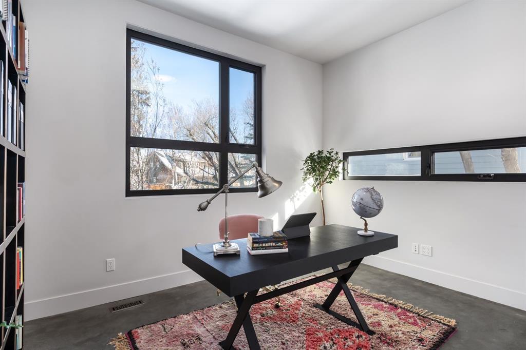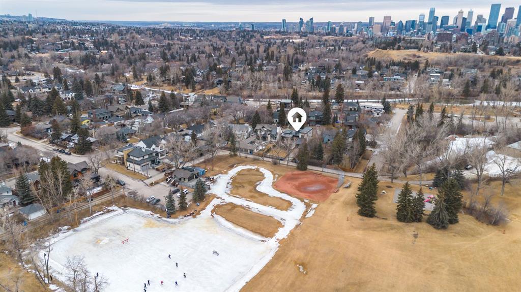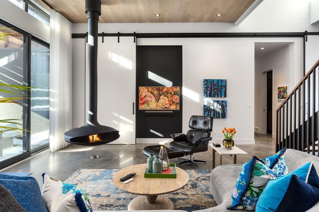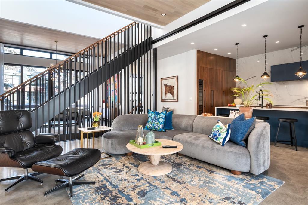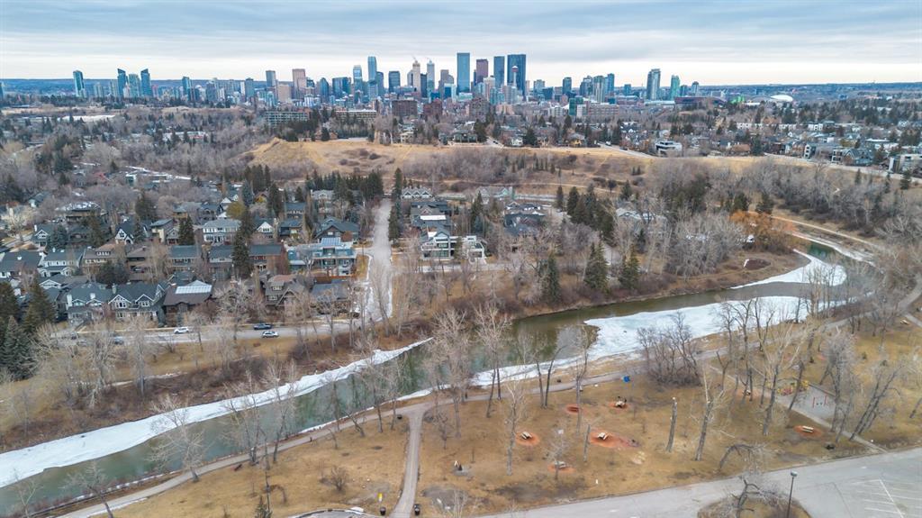 Set within one of Calgary’s most sought after inner city pockets, this architecturally driven residence blends scale, design & everyday livability. Situated on a south facing lot just over ¼ acre, a rare inner city offering, this custom Homes by Avi build with interiors by Connie Young Design balances striking architecture with functional living & exceptional craftsmanship. Featured in a design magazine & recognized with multiple awards, the home reflects a level of design rarely seen within inner city living. The thoughtfully designed 1.5 storey layout places the primary suite, additional bedroom, den, and flex room on the main level, with two upper bedrooms, each with an ensuite, plus a bonus room. Well suited for downsizers, families, and executive living, it offers main level convenience with independent upper living. Architectural features include polished concrete floors with in floor radiant heat, brushed oak engineered hardwood ceilings, recessed LED lighting, triple pane windows, & an open riser staircase beneath soaring 20 foot ceilings enhancing light & volume. The main living area features 12 foot ceilings, a suspended Scandinavian inspired gas fireplace, & two steel barn doors that open for flow or close for privacy from the bedroom wing. Oversized sliding glass doors connect the dining area to the front patio, while the mudroom offers built in storage & organization. Designed for everyday living & entertaining, the kitchen features book matched walnut inspired cabinetry, floating cabinets, porcelain tile backsplash, & a premium appliance package with Wolf built in wall oven, steam convection oven, Sub Zero integrated refrigeration, vertical freezer, & oversized wine fridge. The primary retreat offers patio access, a walk in closet, & a spa inspired ensuite with 14 foot ceilings, oversized steam shower & soaker tub, bidet toilet, & custom wood feature wallpaper for a five star hotel feel. Mechanical highlights include a high efficiency boiler, two furnaces, two central A/C units, HRV, water softener, sump pump, main floor mechanical room, & heated attached garage with epoxy floors & integrated wall storage. Oversized sliding glass doors open to a pergola covered patio with hot tub & gas fire table for effortless indoor outdoor living. The south facing backyard overlooks the outdoor skating rink, playgrounds, baseball diamond, & green space with direct access to the Elbow River, pathways, Stanley Park Outdoor Pool, Lawn Bowling Club, tennis courts, plus nearby amenities including the Saddledome & MNP Community & Sport Centre. Minutes to downtown, top rated schools, the Glencoe Club, & Calgary Golf & Country Club. The unfinished basement offers a blank canvas with nearly 10 foot ceilings, ready to customize. With protected sight lines, no direct rear neighbours, & seamless access to green space, this home offers privacy & architectural elegance. Architecturally stunning & designed for everyday living, a rare inner city opportunity.