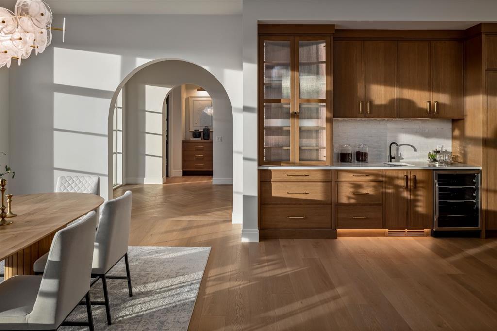 OPEN HOUSE Saturday April 4th 12-6PM & Sunday April 5th 12-3PM! Homes on this exclusive ridge rarely come to market, and this breathtaking two-storey estate is a shining example of elevated inner-city living. With 5,545.89 sq.ft. of exquisitely developed space, this 6 bedroom, 5.5 bath residence blends refined craftsmanship with functional luxury; set against a backdrop of sweeping valley and park views. Step inside to soaring ceilings, pristine engineered hardwood floors, and custom archway details that frame each thoughtfully designed space. The heart of the home begins in the sunlit dining area, perfect for hosting epic dinner parties, and highlighted by west-facing triple-glazed LUX windows. The adjacent chef’s kitchen impresses with stainless steel integrated appliances, including a Wolf gas cooktop, double wall ovens, classic white shaker cabinetry, and a hidden butler’s pantry for discreet prep and storage. The expansive great room invites relaxation with vaulted ceilings and a cozy microcement faced gas fireplace, opening directly to a sunny south-facing deck overlooking endless green space. A main floor guest suite (or executive office) with a private ensuite, a designer powder room, and a spacious mudroom with built-ins complete this level. The fully insulated triple car garage is EV-ready and lift-kit friendly, marrying form and function. Upstairs, a serene primary retreat features elegant vaulted ceilings, a custom walk-in closet, and a spa-inspired 5-piece ensuite with a soaker tub, dual vanities, and a glass shower with bench and niche. Three additional bedrooms (one with an ensuite), an upper laundry room with sink and storage, and a charming library nook provide comfort and convenience for the entire family. The fully developed basement is an entertainer’s dream: featuring a large media lounge, games area, wet bar with brick backsplash and undermount lighting, and a high calibre wine room that secretly accesses the highly systemized maintenance room. A versatile home gym, sixth bedroom with walk-in closet, and additional full bathroom on this level ensure guests feel at home. Noteworthy highlights include: Hydronic in-floor heat in the basement; 2 High-Efficiency furnaces & A/C units; built-in speakers throughout; and quartz countertops in all bathrooms. Located minutes from the University of Calgary, Foothills Hospital, and local shops and restaurants, this timeless home sits in a top-tier school catchment and offers quick access to major routes while maintaining a tranquil, park-like setting. A truly unique opportunity to own a well-appointed, move-in ready home in one of the city’s most prestigious enclaves.