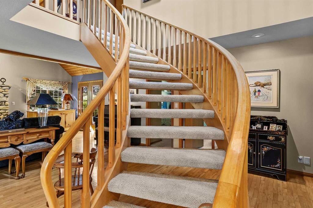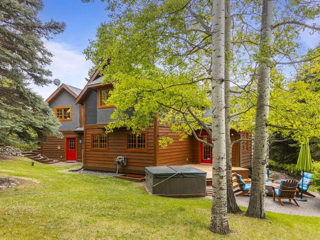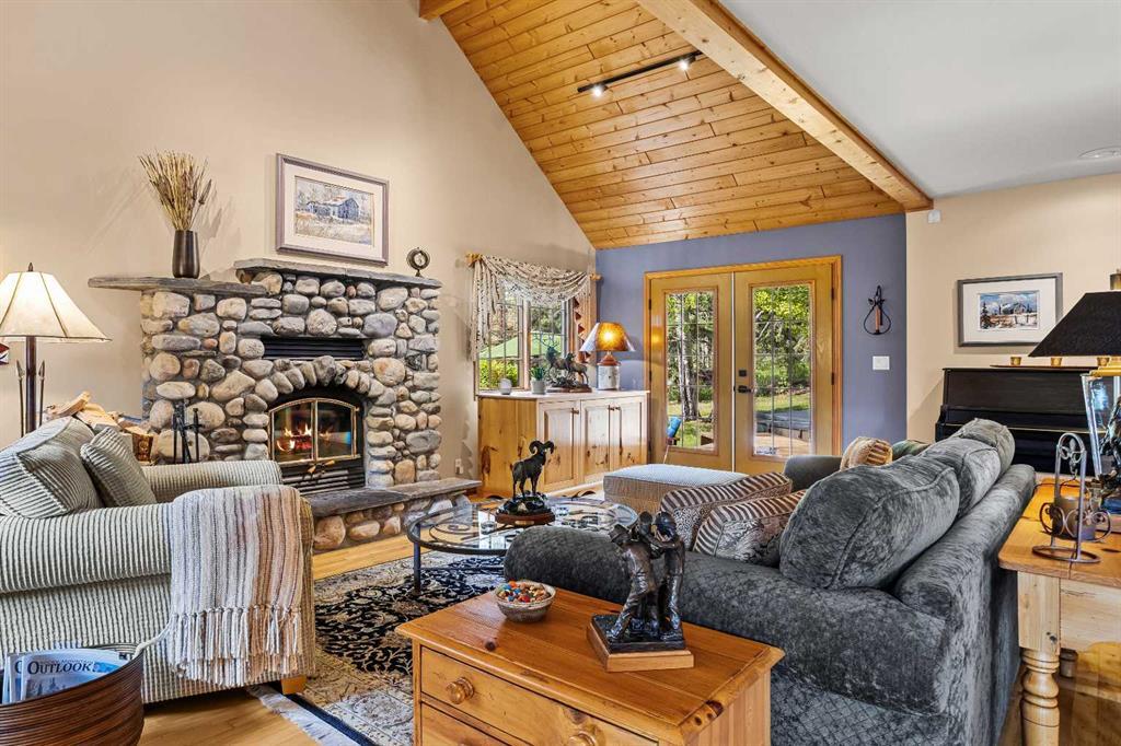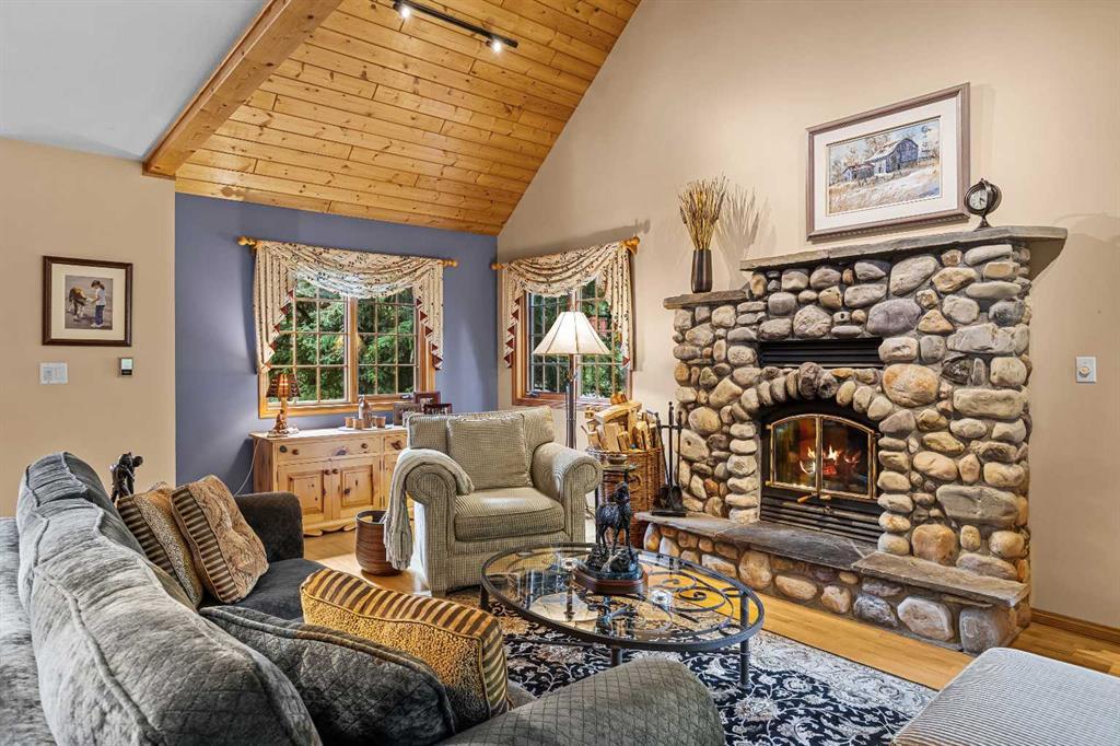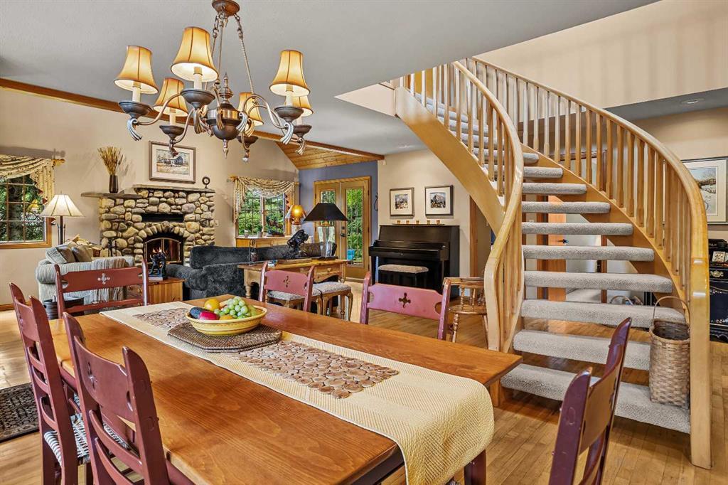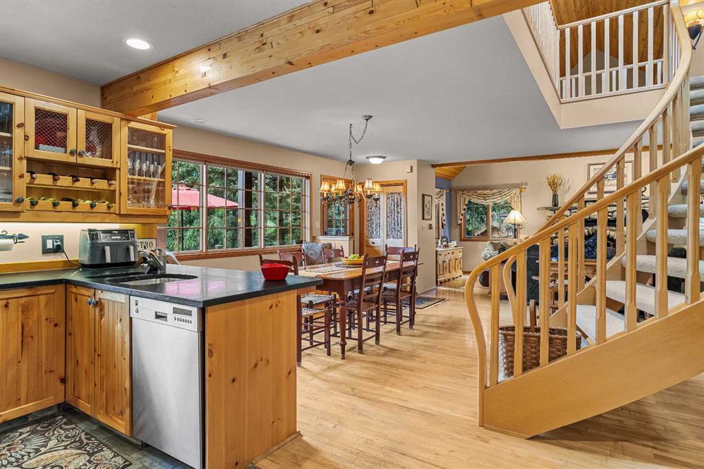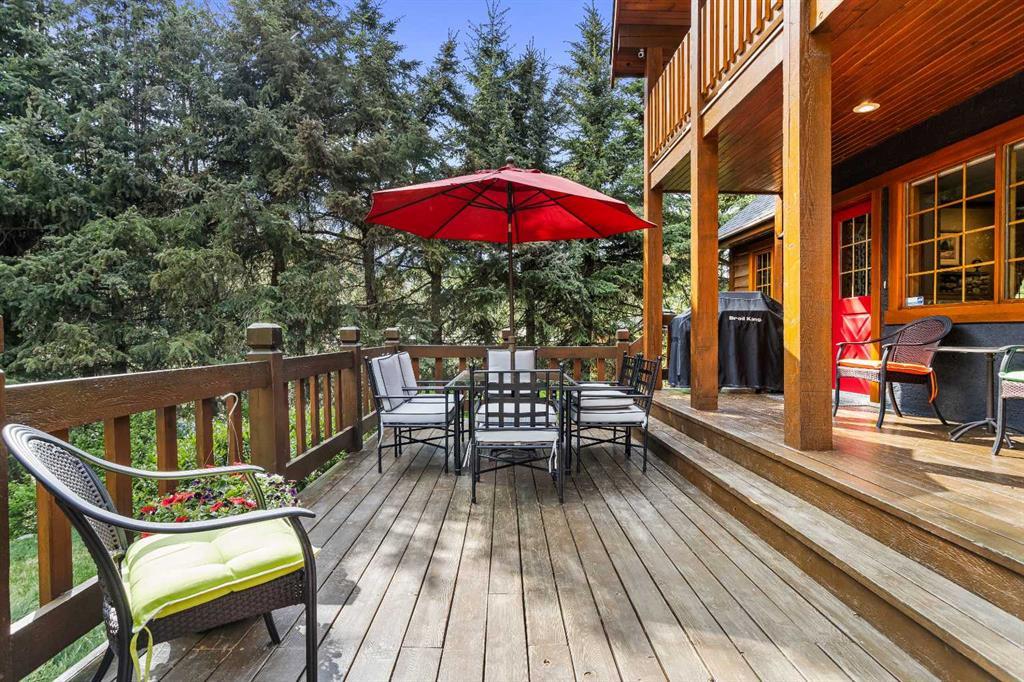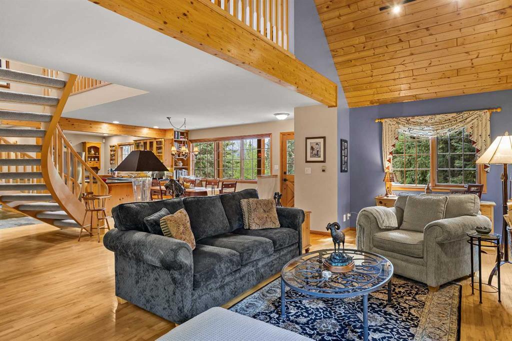 Exempt from the foreign buyer ban, this exquisite mountain estate is quietly nestled in the serene hamlet of Harvie Heights, just minutes from the heart of Canmore. Set on a beautifully landscaped 11,250+ sq.ft. lot and surrounded by mature trees and mountain vistas, this is a rare opportunity to own a private alpine escape. Blending rustic charm with refined comfort, the home features vaulted ceilings, rich hardwood floors, and a spiral staircase that adds architectural elegance to the warm, wood-accented interior. The thoughtful layout includes 4 bedrooms and 3 bathrooms, plus a spacious lower-level family room, and additional storage — ideal for future customization. Four sun-drenched sundecks invite you to relax and take in the sweeping views, while a tandem double garage provides ample space for vehicles and gear. One of the few properties still eligible for foreign ownership, this mountain sanctuary is a truly rare offering in today’s market.
