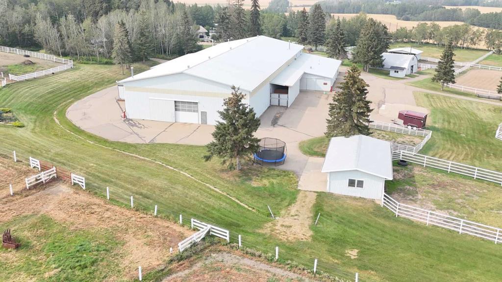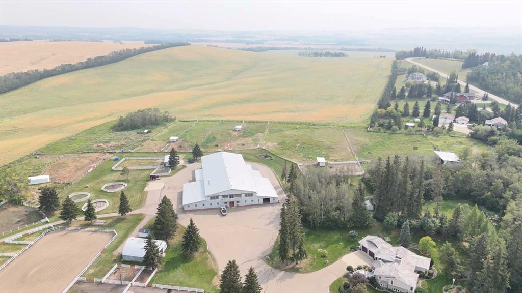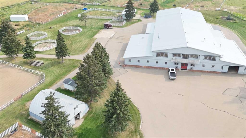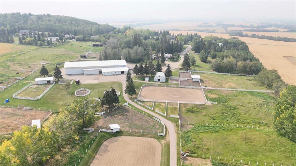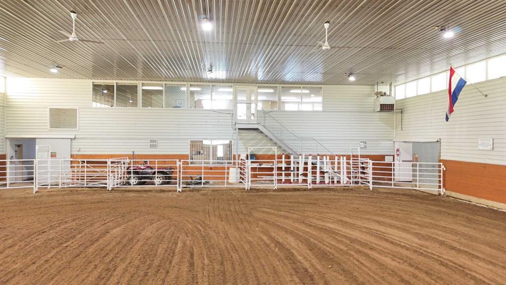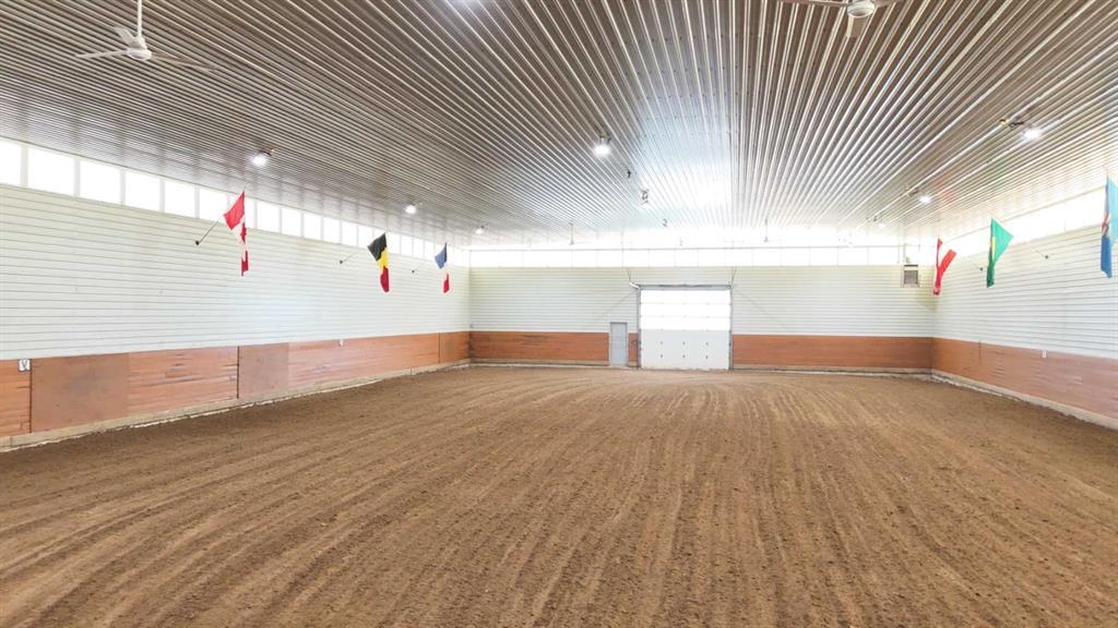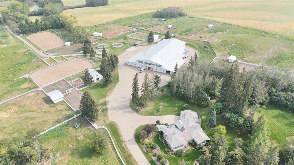 Springvale Meadows is a fully developed, infrastructure-rich equestrian estate purpose-built for professional training, boarding, and year-round operation. The scale of improvements and established land base provide a comprehensive facility in a prime central Alberta location. At the center of the property is an approximately 20,800 square foot heated indoor riding arena designed for all-season use. The facility includes a large riding surface, 19 permanent stalls, wash bays, tack areas, office space, and an elevated viewing lounge with integrated suite accommodations (approximately 1,740 square feet). LED high-bay lighting has been installed, and the building includes emergency generator connection capability. Arena footing is professionally maintained on an approximate four-year cycle. Additional infrastructure includes a quonset-style barn with 7 overflow stalls, multiple paddocks equipped with shelters and automatic waterers, 14 individual round pens for structured training rotation, and two outdoor riding arenas to expand seasonal capacity. A 60’ x 100’ x 18’ hay shed provides substantial covered storage for feed and equipment. Secondary support buildings, extensive paved yard areas, and a gated entrance contribute to operational efficiency and year-round accessibility. The residence offers approximately 2,750 square feet of developed living space, positioned to maintain privacy while remaining integrated within the operational footprint. Mature landscaping, established shelterbelts, and a pond with cabin and dock enhance the overall setting. The 94.23-acre parcel includes approximately 70 cultivated acres currently under lease. Two producing water wells service domestic and livestock requirements. Zoning supports agricultural and equestrian uses consistent with existing improvements. This offering presents an opportunity to acquire an established equestrian facility with substantial existing infrastructure in place.