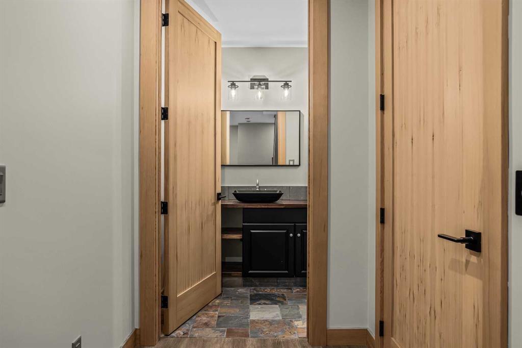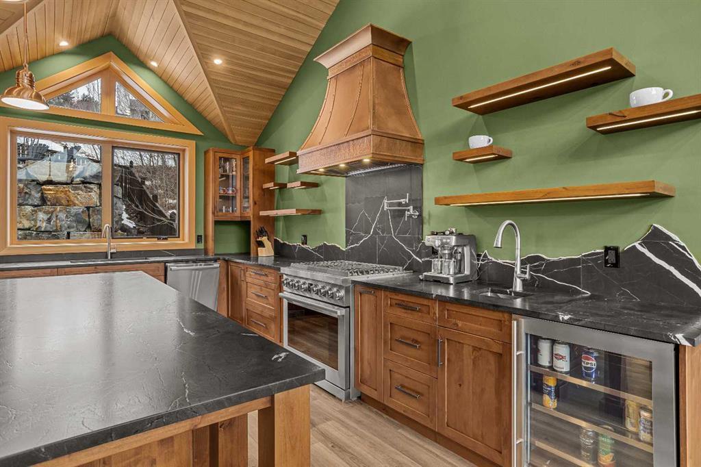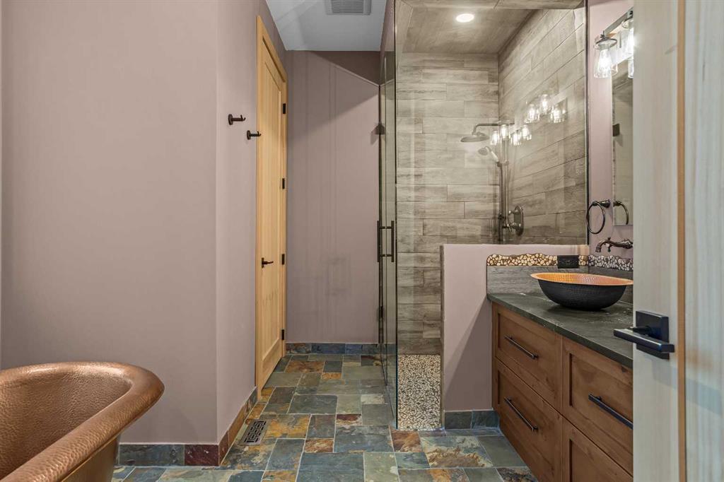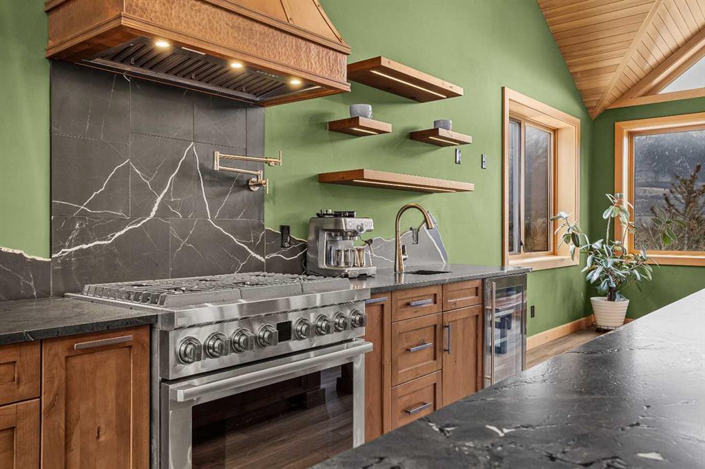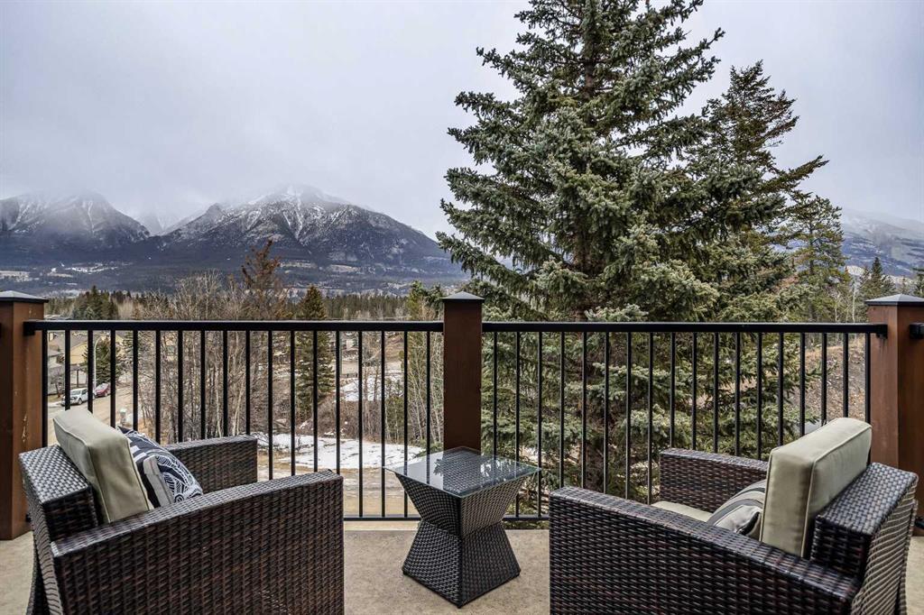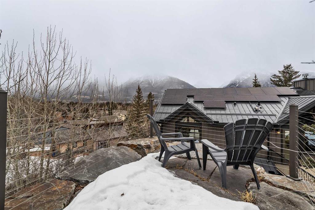 At nearly 3,200 SF, Positioned at the top of a quiet cul-de-sac, 104 Rummel Place captures elevated Bow Valley views in one of Canmore’s most peaceful residential settings. This 4-bedroom, 4-bathroom custom home blends privacy, scale, and thoughtful design anchored by a triple-car garage with exceptional storage capacity. Vaulted ceilings frame the surrounding mountain and valley views, creating a dramatic yet welcoming upper-level living space. Expansive windows draw natural light throughout, while multiple outdoor patios and balconies offer seamless indoor-outdoor living. The backyard is truly exceptional fully fenced and thoughtfully terraced with multiple lounging areas, a covered hot tub retreat, fire pit, and a private viewing platform perched above the valley an ideal vantage point to take in Canmore’s landscape. The kitchen is designed for entertaining, featuring a large island, gas range, prep sink, and generous workspace. The main level includes a spacious primary suite complete with a walk-in closet and a striking copper bathtub in the ensuite a distinctive design feature that elevates the space. Two additional bedrooms offer direct access to outdoor areas. The lower level includes a recreation room, fourth bedroom, and full bathroom, creating flexibility for guests, family, or additional living space. Additional features include in-floor heat throughout, heated driveway and steps, solar panels, elevator access to all levels, and rough-in for a future sauna or Nordic spa. This is a home defined by its position elevated, private, and immersed in nature while remaining just minutes from downtown Canmore.