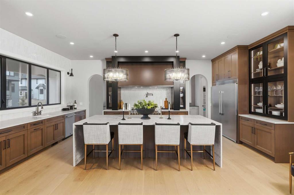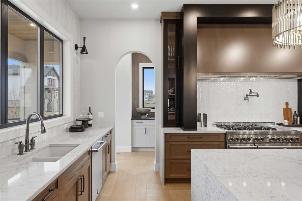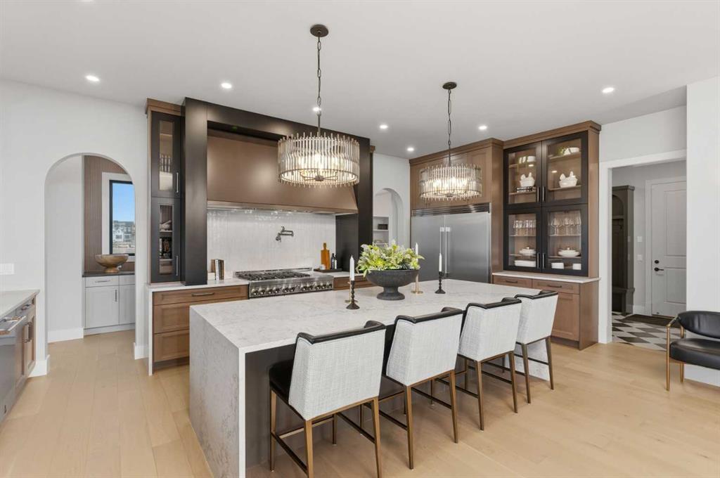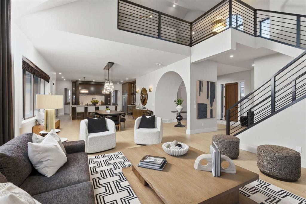 A rare opportunity to own a former Crystal Creek LOTTERY HOME in Watermark, offered FULLY FURNISHED and completely turn key, where every detail has been professionally curated and included. Set on a large lot with a sunny south facing backyard, this 5,652 sq ft fully developed luxury home with triple car garage makes an immediate impression. Soaring open to above ceilings, full height windows, and a statement fireplace define the main living space. The main level flows effortlessly through a designer kitchen with oversized island, premium appliances, butler’s pantry, and an elegant dining area framed by architectural arches and custom lighting, while a private office, functional mudroom, and thoughtful storage round out the floor. Upstairs, the primary retreat feels like a boutique hotel, complete with a spa inspired ensuite with in-floor heating, freestanding tub, oversized shower, fully built out walk in closet, and a private balcony overlooking the south facing yard, a quiet spot for morning coffee or winding down at the end of the day. Additional bedrooms offer their own character and access to ensuites, while the upper lounge overlooks the great room below, creating a bright and open second living space. The fully developed basement is designed for entertaining with a large rec room, bar, gym or flex space, and guest bedroom. Built for comfort and efficiency, this home features dual furnaces, dual A/C units, tankless hot water, HRV system, water softener, audio system, Wi-Fi extenders and full new home warranty coverage for complete peace of mind. Outside, the property features Gemstone lights, is fully landscaped with irrigation system and ready to enjoy from day one. Located just outside Calgary, the prestigious community of Watermark offers estate living with quick access to the city, mountain views, pathways, and a level of privacy that is increasingly hard to find. Homes of this caliber, fully finished and furnished, rarely become available. Book your private showing and experience it in person.